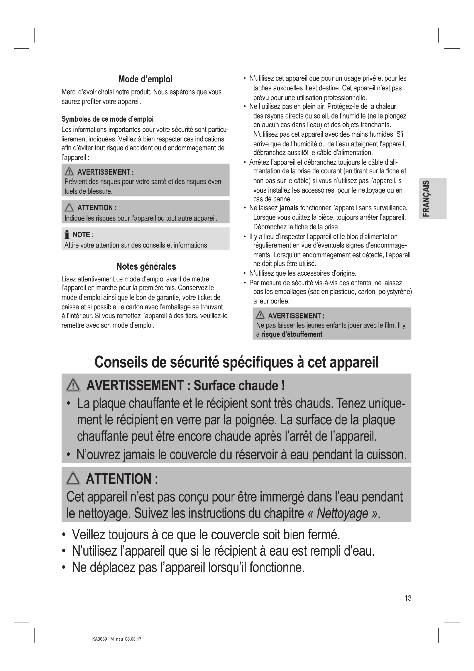 - Ne déplacez pas l’appareil lorsqu’il fonctionne.14 KA3689_IM_neu 08.08.17