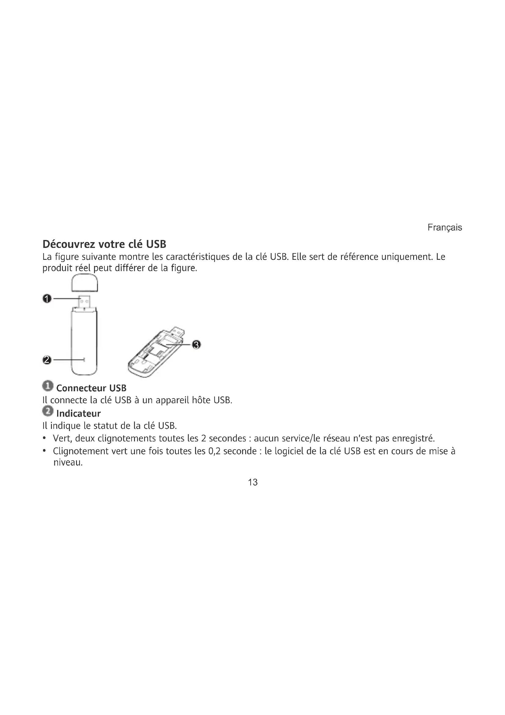- Clignotement vert une fois toutes les 0,2 seconde : le logiciel de la clé USB est en cours de mise à niveau. Français 13• Vert, un clignotement toutes les 2 secondes : le réseau 2G a déjà été enregistré.