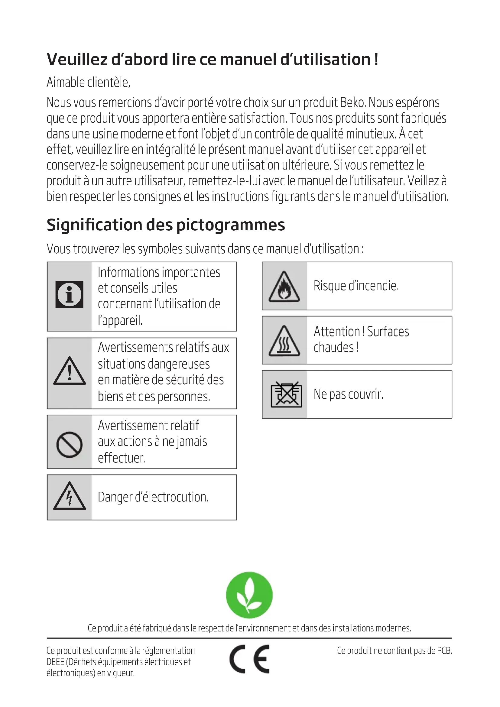The picture is general remote controller, contains almost all of the function buttons. They may be slightly different from material abject (depend on model). Manufactured by Arcelik A.S. Karaagac Cd. No:2-6 34445 Sutluce, Beyoglu, Istanbul, Turkey.Veuillez d’abord lire ce manuel d’utilisation ! Aimable clientèle, Nous vous remercions d’avoir porté votre choix sur un produit Beko. Nous espérons que ce produit vous apportera entière satisfaction. Tous nos produits sont fabriqués dans une usine moderne et font l’objet d’un contrôle de qualité minutieux. À cet effet, veuillez lire en intégralité le présent manuel avant d’utiliser cet appareil et conservez-le soigneusement pour une utilisation ultérieure. Si vous remettez le produit à un autre utilisateur, remettez-le-lui avec le manuel de l’utilisateur. Veillez à bien respecter les consignes et les instructions figurants dans le manuel d’utilisation. Signication des pictogrammes Vous trouverez les symboles suivants dans ce manuel d’utilisation : Ce produit a été fabriqué dans le respect de l’environnement et dans des installations modernes. Ce produit est conforme à la réglementation DEEE (Déchets équipements électriques et électroniques) en vigueur. Ce produit ne contient pas de PCB.