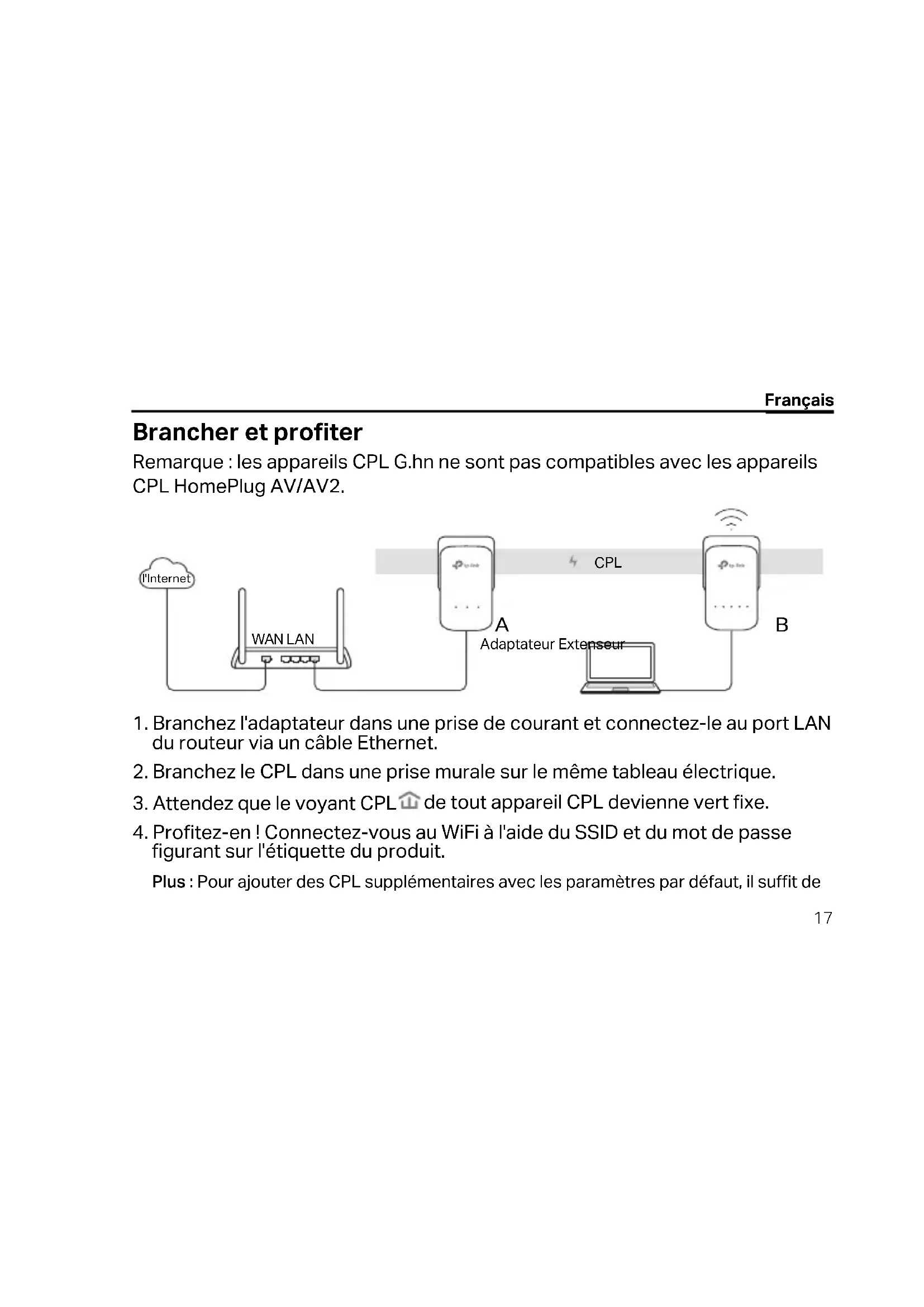 gurant sur l'étiquette du produit. Plus : Pour ajouter des CPL supplémentaires avec les paramètres par défaut, il sut de l'Internet WAN LAN Adaptateur Extenseur CPLFrançais