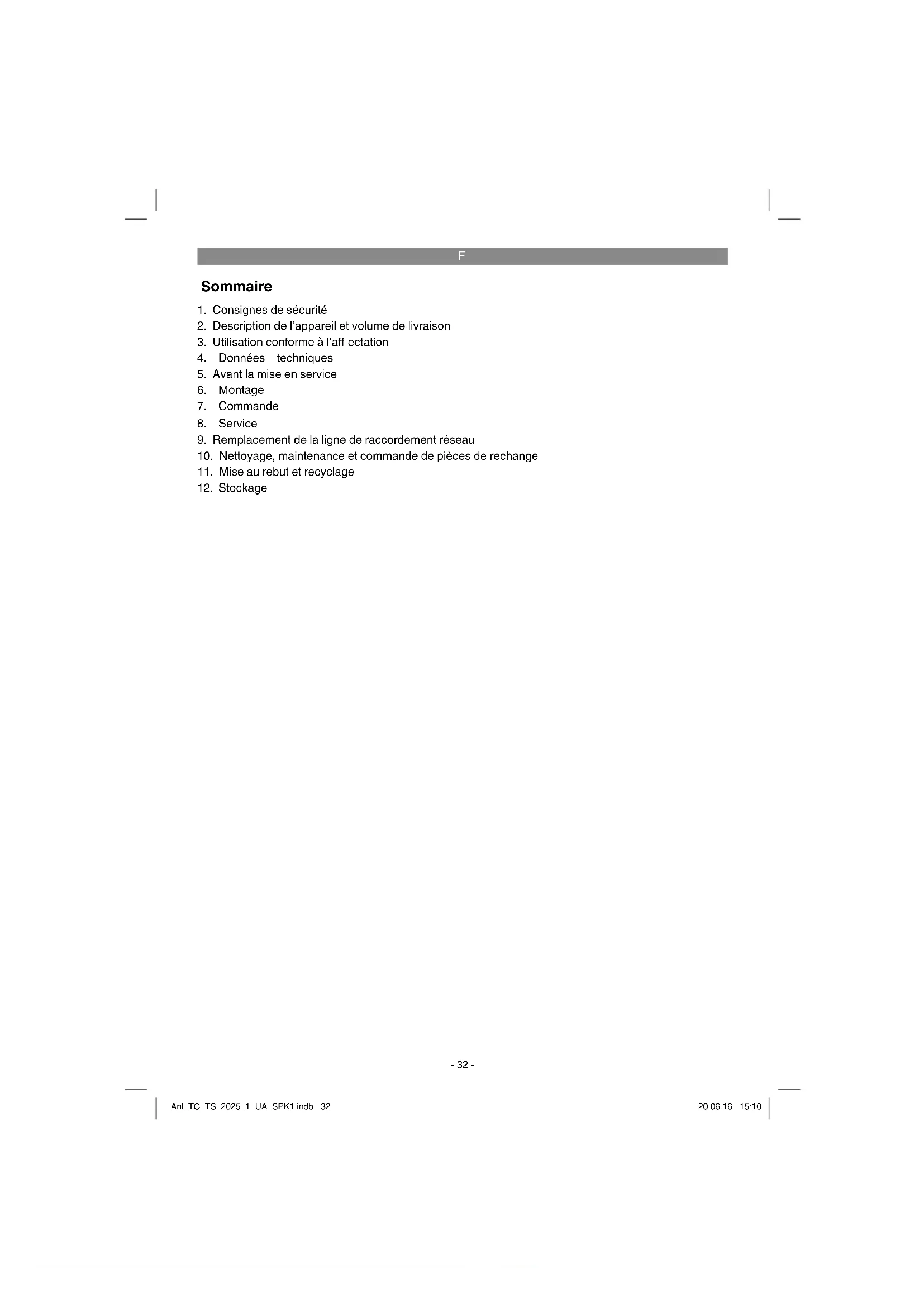 Conservez l’emballage autant que possible jusqu’à la fin de la période de garantie. Danger ! L’appareil et le matériel d’emballage ne sont pas des jouets ! Il est interdit de laisser des enfants jouer avec des sacs et des fi lms en plastique et avec des pièces de petite taille. Ils risquent de les avaler et de s’étouff er ! Anl_TC_TS_2025_1_UA_SPK1.indb 34Anl_TC_TS_2025_1_UA_SPK1.indb 34 20.06.16 15:1020.06.16 15:10F