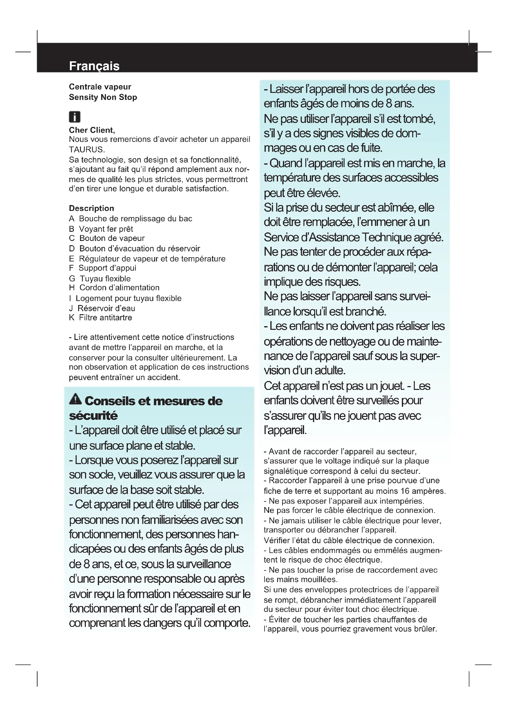 - Repeat the cleaning process at least twice. ** We recommend performing the process once a month to prolong the service life of the ironing system. If the water in your area is very hard or you notice limescale coming out through the sole- plate during ironing, use this function more often. Anomalies and repair - Take the appliance to an authorised technical support service if problems arise. Do not try to dismantle or repair without assistance, as this may be dangerous. For EU product versions and/or in the case that it is requested in your country: Ecology and recyclability of the product The materials used to make the packaging of this appliance are covered by a system for collecting, classifying and recycling them. Should you wish to dispose of them, use the appropriate public containers for each type of material. The product does not contain concentrations of substances that could be considered harmful to the environment This symbol means that in case you wish to dispose of the product once its working life has ended, take it to an authorised waste agent for the selective collection of waste electrical and electronic equipment (WEEE) This symbol indicates that the surface may heat up during use. This appliance complies with Directive 2014/35/ EU on Low Voltage, with Directive 2014/30/EU on Electromagnetic Compatibility, with Directive 2014/30/EU on restrictions on the use of certain dangerous substances in electrical and electronic appliances.Français Centrale vapeur Sensity Non Stop Cher Client, Nous vous remercions d’avoir acheter un appareil TAURUS. Sa technologie, son design et sa fonctionnalité, s’ajoutant au fait qu’il répond amplement aux nor- mes de qualité les plus strictes, vous permettront d’en tirer une longue et durable satisfaction. Description A Bouche de remplissage du bac B Voyant fer prêt C Bouton de vapeur D Bouton d’évacuation du réservoir E Régulateur de vapeur et de température F Support d’appui G Tuyau exible H Cordon d’alimentation I Logement pour tuyau exible J Réservoir d’eau K Filtre antitartre - Lire attentivement cette notice d’instructions avant de mettre l’appareil en marche, et la conserver pour la consulter ultérieurement. La non observation et application de ces instructions peuvent entraîner un accident. Conseils et mesures de sécurité - L’appareil doit être utilisé et placé sur une surface plane et stable. - Lorsque vous poserez l’appareil sur son socle, veuillez vous assurer que la surface de la base soit stable. - Cet appareil peut être utilisé par des personnes non familiarisées avec son fonctionnement, des personnes han- dicapées ou des enfants âgés de plus de 8 ans, et ce, sous la surveillance d’une personne responsable ou après avoir reçu la formation nécessaire sur le fonctionnement sûr de l’appareil et en comprenant les dangers qu’il comporte. - Laisser l’appareil hors de portée des enfants âgés de moins de 8 ans. Ne pas utiliser l’appareil s’il est tombé, s’il y a des signes visibles de dom- mages ou en cas de fuite. - Quand l’appareil est mis en marche, la température des surfaces accessibles peut être élevée. Si la prise du secteur est abîmée, elle doit être remplacée, l’emmener à un Service d’Assistance Technique agréé. Ne pas tenter de procéder aux répa- rations ou de démonter l’appareil; cela implique des risques. Ne pas laisser l’appareil sans survei- llance lorsqu’il est branché. - Les enfants ne doivent pas réaliser les opérations de nettoyage ou de mainte- nance de l’appareil sauf sous la super- vision d’un adulte. Cet appareil n’est pas un jouet. - Les enfants doivent être surveillés pour s’assurer qu’ils ne jouent pas avec l’appareil. - Avant de raccorder l’appareil au secteur, s’assurer que le voltage indiqué sur la plaque signalétique correspond à celui du secteur. - Raccorder l’appareil à une prise pourvue d’une che de terre et supportant au moins 16 ampères. - Ne pas exposer l’appareil aux intempéries. Ne pas forcer le câble électrique de connexion. - Ne jamais utiliser le câble électrique pour lever, transporter ou débrancher l’appareil. Vérier l’état du câble électrique de connexion. - Les câbles endommagés ou emmêlés augmen- tent le risque de choc électrique. - Ne pas toucher la prise de raccordement avec les mains mouillées. Si une des enveloppes protectrices de l’appareil se rompt, débrancher immédiatement l’appareil du secteur pour éviter tout choc électrique. - Éviter de toucher les parties chauffantes de l’appareil, vous pourriez gravement vous brûler.Utilisation et entretien : - Avant chaque utilisation, dérouler complètement le câble d’alimentation de l’appareil. - Ne pas utiliser l’appareil tant que les acces- soires ou les consommables ne soient pas bien ajustés. Utiliser les poignées pour prendre ou transporter l’appareil. - Respecter le niveau MAXIMUM (Fig. 2). - Débrancher l’appareil du secteur tant qu’il reste hors d’usage et avant de procéder à toute opéra- tion de nettoyage. Cet appareil est uniquement destiné à un usage domestique et non professionnel ou industriel. - Conservez cet appareil hors de portée des enfants ou des personnes avec capacités physiques, sensorielles ou mentales réduites ou présentant un manque d’expérience et de connaissances - Ne pas garder l’appareil s’il est encore chaud. - Pour un fonctionnement correct, maintenir la semelle bien propre, ne l’appliquez pas sur des objets métalliques (par exemple, la planche à repasser, boutons, fermetures éclair, etc.) IMPORTANT: Remplacer le ltre ANTICAL tous les 30 remplissages du réservoir environ ou utili- ser de l’eau déminéralisée avec le ltre usagé. - L’usage d’eau déminéralisée est spécialement recommandé, si l’eau dont vous disposez est boueuse ou du type “dure“ (contenant du calcium ou du magnésium). REMARQUE: Il es