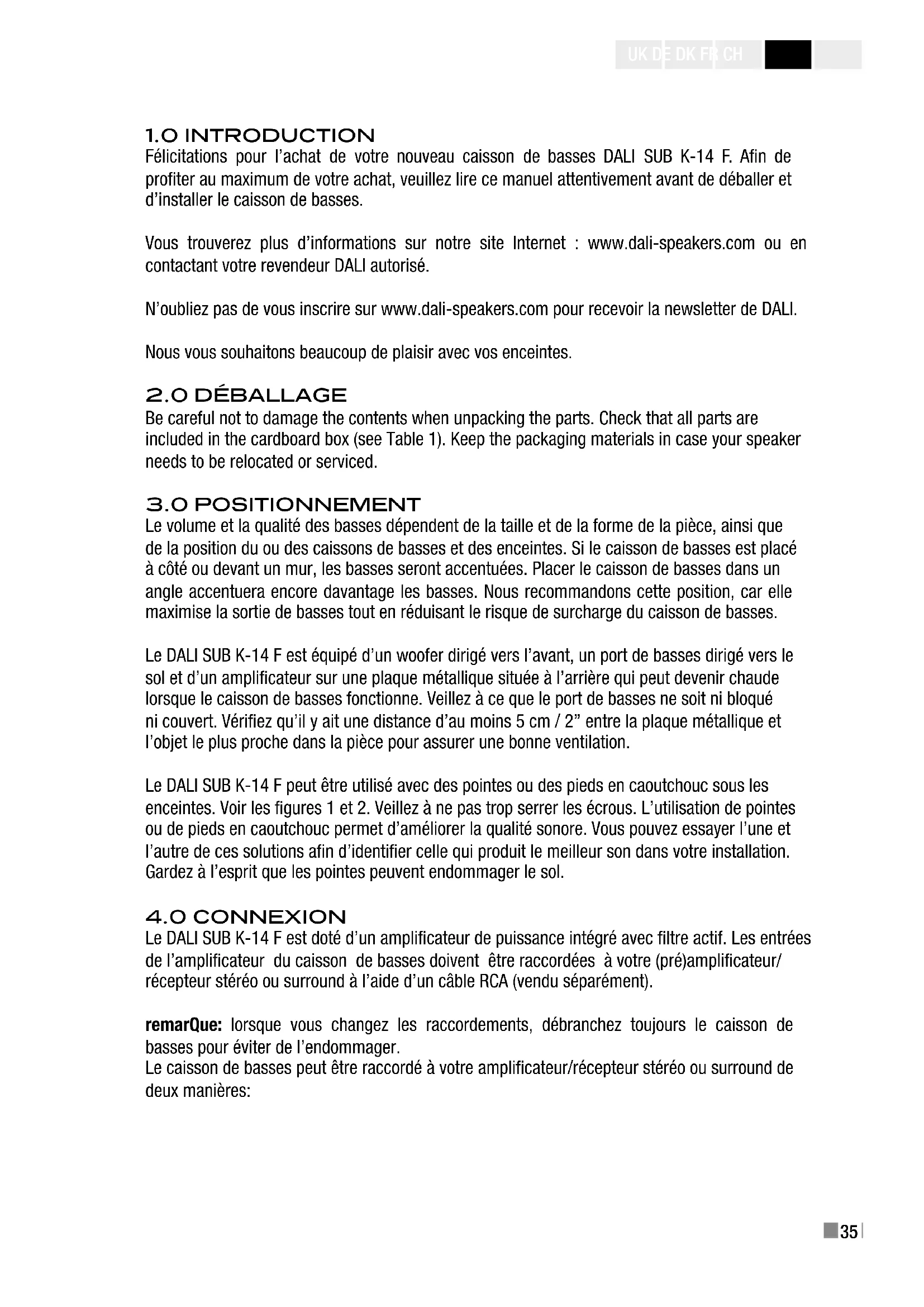 Félicitations pour l’achat de votre nouveau caisson de basses DALI SUB K-14 F. An de proter au maximum de votre achat, veuillez lire ce manuel attentivement avant de déballer et d’installer le caisson de basses. Vous trouverez plus d’informations sur notre site Internet : www.dali-speakers.com ou en contactant votre revendeur DALI autorisé. N’oubliez pas de vous inscrire sur www.dali-speakers.com pour recevoir la newsletter de DALI. Nous vous souhaitons beaucoup de plaisir avec vos enceintes.