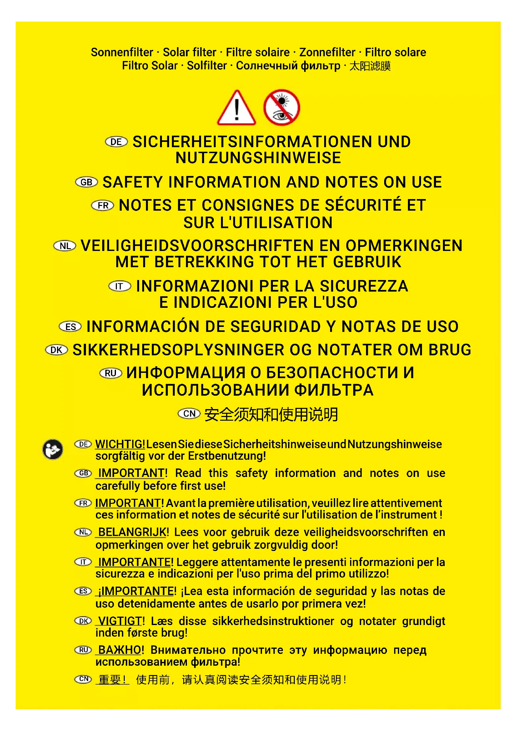 - Ne jamais regarder le soleil à travers un oculaire avec uniquement un filtre solaire ou un filtre lunaire monté sur celui-ci. Le rayon de lumière obtenu par la lentille détruit immédiatement la feuille du filtre et peut instantanément causer des lésions oculaires ou même provoquer des risques de cécité complète.