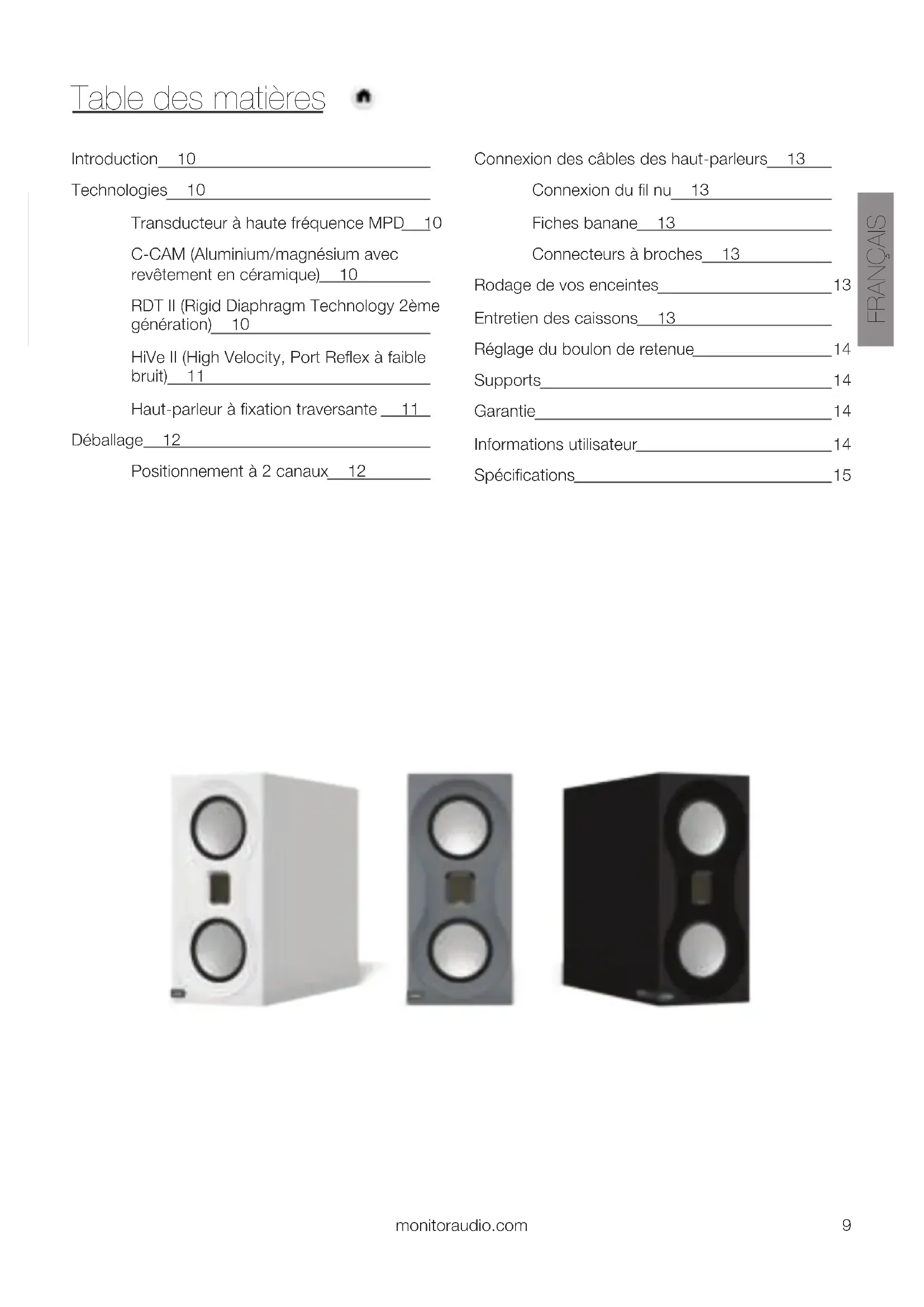 3/8 x 6 1/8 x 141 3/16 inch Product Weight 7.58Kg (16lb 9oz) Finishes Available Satin lacquer finish in black, white and grey Monitor Audio reserves the right to alter specifications without notice. ENGLISHManuel utilisateurTable des matières Introduction 10 Technologies 10 Transducteur à haute fréquence MPD 10 C-CAM (Aluminium/magnésium avec revêtement en céramique) 10 RDT II (Rigid Diaphragm Technology 2ème génération) 10 HiVe II (High Velocity, Port Reflex à faible bruit) 11 Haut-parleur à fixation traversante 11 Déballage 12 Positionnement à 2 canaux 12 Connexion des câbles des haut-parleurs 13 Connexion du fil nu 13 Fiches banane 13 Connecteurs à broches 13 Rodage de vos enceintes 13 Entretien des caissons 13 Réglage du boulon de retenue 14 Supports 14 Garantie 14 Informations utilisateur 14 Spécifications 15 FRANÇAIS monitoraudio.com 9Introduction Studio est un système d'enceintes haute-performance destiné aux passionnés de musique qui recherchent un ensemble compact et abordable offrant un résultat parfait. La philosophie de conception sans compromis influe particulièrement sur la technologie de haut-parleur de diffusion issue de la série de référence Platinum II. Chaque détail de la chaîne de signal a été pensé de façon à atteindre la neutralité ; pour cela, notre équipe de conception a dû opter pour une approche intransigeante. Par exemple, la conception sans grille garantit des performances toujours optimales et sans concession. Les pieds personnalisés ont été créés pour offrir un support optimal, un design adapté et des performances impeccables. Technologies Transducteur à haute fréquence MPD Le transducteur à haute fréquence MPD (Micro Pleated Diaphragm) a été conçu pour offrir une netteté exceptionnelle grâce à sa membrane de faible masse. Ce transducteur MPD compresse rapidement les plis pour produire une réponse fluide, large et naturellement rapide sur la bande ultrasonore. Ainsi, le son est plus vivant, libérant le spectre harmonieux de chaque note sans distorsion pouvant perturber la définition du son. C-CAM (Aluminium/magnésium avec revêtement en céramique) Le C-CAM est un alliage innovant développé à l'origine par l'industrie aérospatiale. Il présente des qualités idéales pour une utilisation dans les cônes de haut-parleur, grâce à son extrême rigidité et il reste suffisament léger pour offrir un rendement général élevé. Le C-CAM est formé d'un alliage d'aluminium et de magnésium, qui subit des traitements de soulagement de la tension en usine pour éviter la déformation de surface et une faiblesse moléculaire. Une couche de céramique pure (alumina) est coulée sur les surfaces pour produire un extérieur complètement rigide. Les cônes C-CAM sont conçus pour offrir une haute résistance à la contrainte de tension. Lorsqu'il est formé en cône, le C-CAM offre une clarté améliorée et une distorsion réduite en comparaison avec les cônes en matériaux conventionnels. RDT II (Rigid Diaphragm Technology 2ème génération) RDT II est une structure composite de type « sandwich » composée de couches ultrafines de masse faible, collées à un matériau de base NomexR en nid d'abeille. L'épaisseur générale du diaphragme du RDT II n'est que de 2 mm, elle présente pourtant 150 fois la solidité d'un cône de haut-parleur conventionnel. RDT II est un développement innovant et unique conçu par les ingénieurs de Monitor Audio pour la nouvelle série Platinum II. Il utilise deux revêtements extérieurs avec des propriétés mécaniques dissemblables. Le C-CAM est utilisé pour le revêtement avant, tandis que l'arrière est conçu en fibre de carbone tissée. Cette combinaison est capable de réduire la distorsion de plus de 8 dB au-dessus de 300 Hz, ce qui équivaut à une réduction de 60 % de l'énergie des composants harmoniques, faisant du RDT II la technologie de distorsion cône la plus basse de toute l'histoire de Monitor Audio. Les doubles haut-parleurs RDT II de 10,16 cm utilisés dans Studio ont été développés à partir de l'enceinte PL500 II, modifiée pour produire des basses ainsi que des médiums. La technologie DCF (Dynamic Coupling Filter) a également été intégrée pour optimiser et réduire le bris du cône haute fréquence et accroître la rigidité circonférentielle de la bobine acoustique critique. Comme la série Platinum II, les haut- parleurs Studio ont été conçus pour offrir une distorsion incroyablement faible et ils utilisent les mêmes principes de conception magnétique. Studio10HiVe II (High Velocity, Port Reflex à faible bruit) La technologie de port de Monitor Audio utilise un design à rayures droites pour accélérer le flux d'air et réduire les turbulences. La technologie HiVe II a la capacité de déplacer l'air vers l'extérieur et l'intérieur plus rapidement qu'un port conventionnel, avec pour résultat des basses puissantes et réactives couplées à une réponse transitoire supérieure. Le caisson Studio est extrêmement fin et se compose de deux ports HiVe II fixés à l'arrière, en haut et en bas du caisson, afin de garantir une pression symétriquement équilibrée à l'intérieur du caisson. La surface étendue du port garantit également l'absence de turbulences et de bruit lié à l'air, ce qui peut être un problème dans les petits caissons. Haut-parleur à fixation traversante L'enceinte Studio utilise notre système de haut-parleur à fixation traversante simple, fixé à l'arrière du caisson. Serré selon un couple de serrage spécifique, le boulon sert à conférer au haut-parleur une force de serrage égale tout autour de sa périphérie, tout en assurant le bon positionnement du système moteur. Dans la mesure où il s'agit effectivement d'un type supplémentaire de fixation, le système du caisson avec les haut-parleurs installés en devient encore plus rigide. FRANÇAIS monitoraudio.com 11Déballage Assurez-vous 