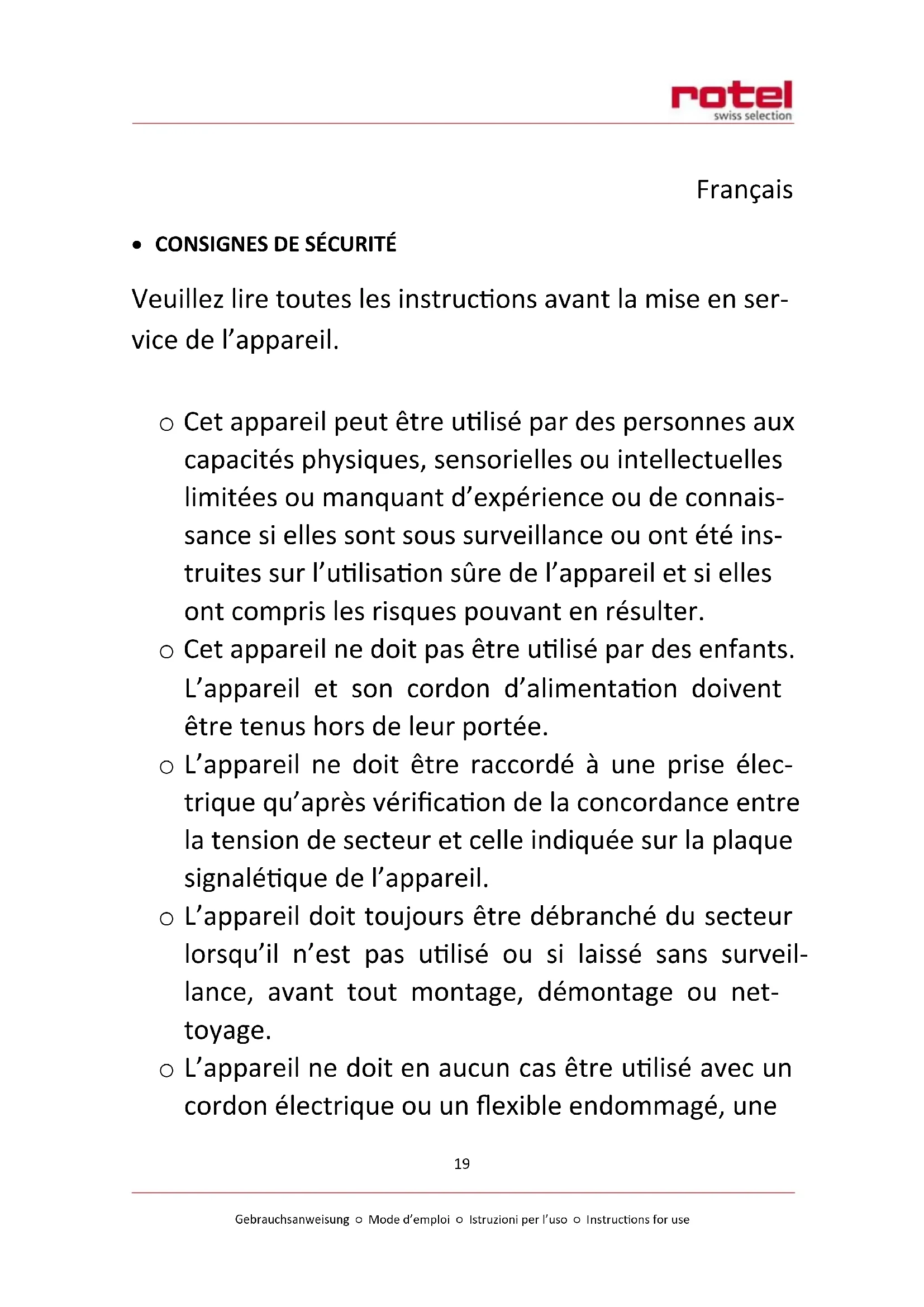 Pour une élimination dans les régles de l'art, veuillez remetre l'appareil à un reven-deur, un responsable du service après-vente ou Rotel SA.