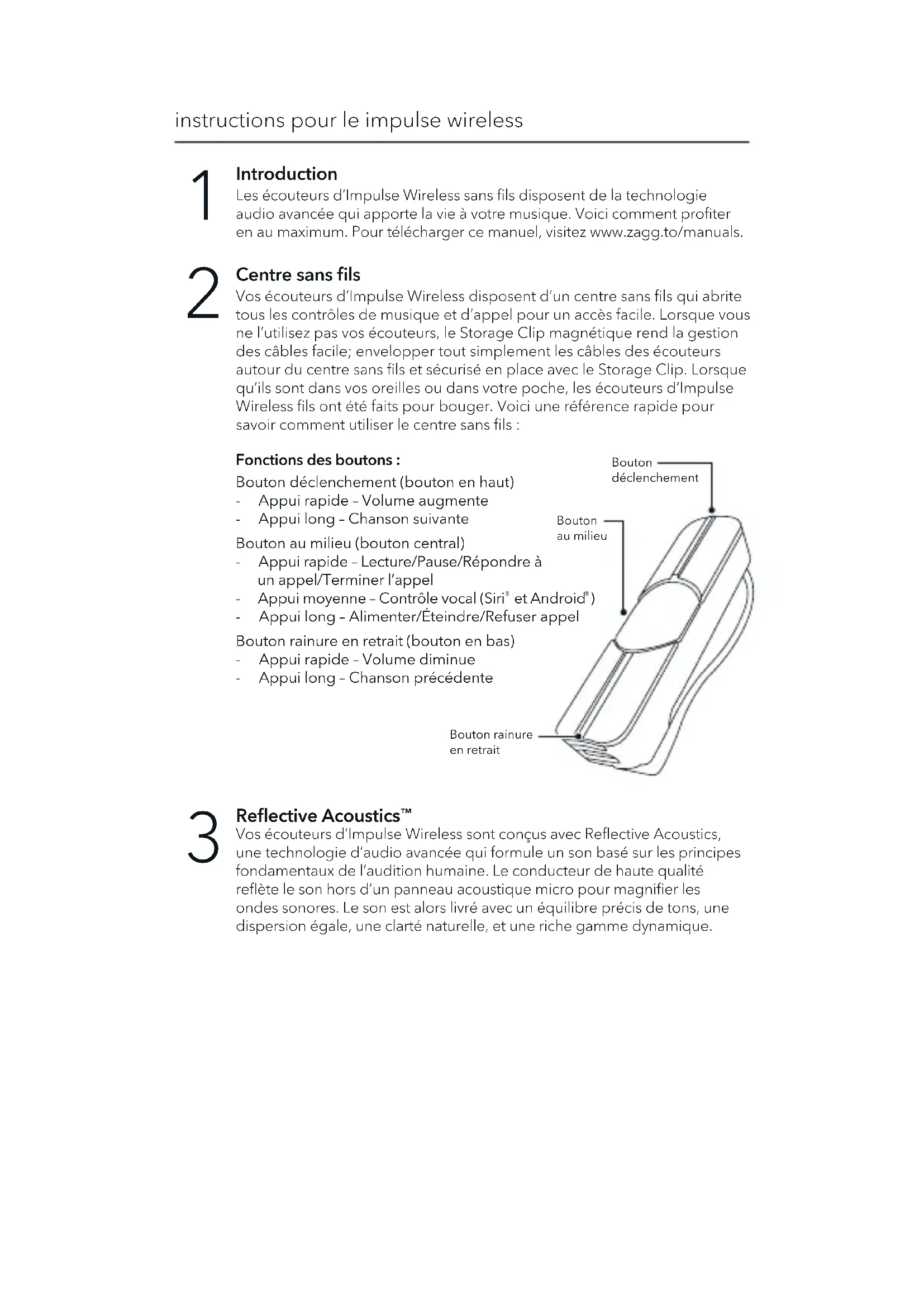 - Appui long – Alimenter/Éteindre/Refuser appel Bouton rainure en retrait (bouton en bas) - Appui rapide – Volume diminue - Appui long – Chanson précédente Introduction Les écouteurs d’Impulse Wireless sans fils disposent de la technologie audio avancée qui apporte la vie à votre musique. Voici comment profiter en au maximum. Pour télécharger ce manuel, visitez www.zagg.to/manuals. Reflective Acoustics