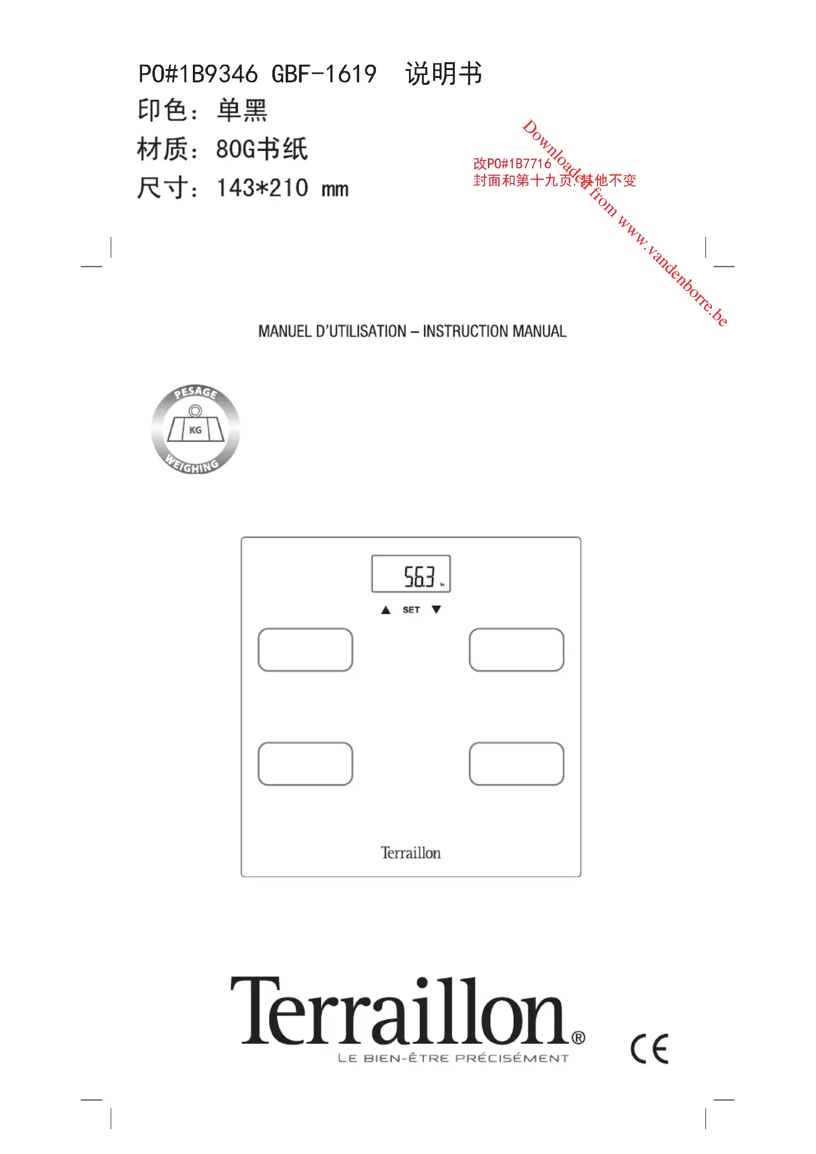 IT BILANCIA MASSA GRASSA TERRAILLON - MANUALE DI ISTRUZIONI ....................... 36 ES MANUAL DE INSTRUCCIONES DE LA BÁSCULA DE MASA GRASA DE TERRAILLON . 44 PT BALANÇA DE MASSA GORDA TERRAILLON – MANUAL DE INSTRUÇÕES ................ 52 Downloaded from www.vandenborre.beNe pas utiliser la balance chez les sujets porteurs stimulateur cardiaque ou autre appareil médical électronique. Cela pourrait causer un dysfonctionnement de l’appareil. En cas de doute, consultez votre médecin. Pour les femmes enceintes et les personnes porteuses d’implants tels que prothèses, dispositifs contraceptifs, ou broches, les résultats donnés par la balance peuvent s’avérer inexacts. Toutefois, l’utilisation de la balance ne représente aucun risque pour la santé. Downloaded from www.vandenborre.be5