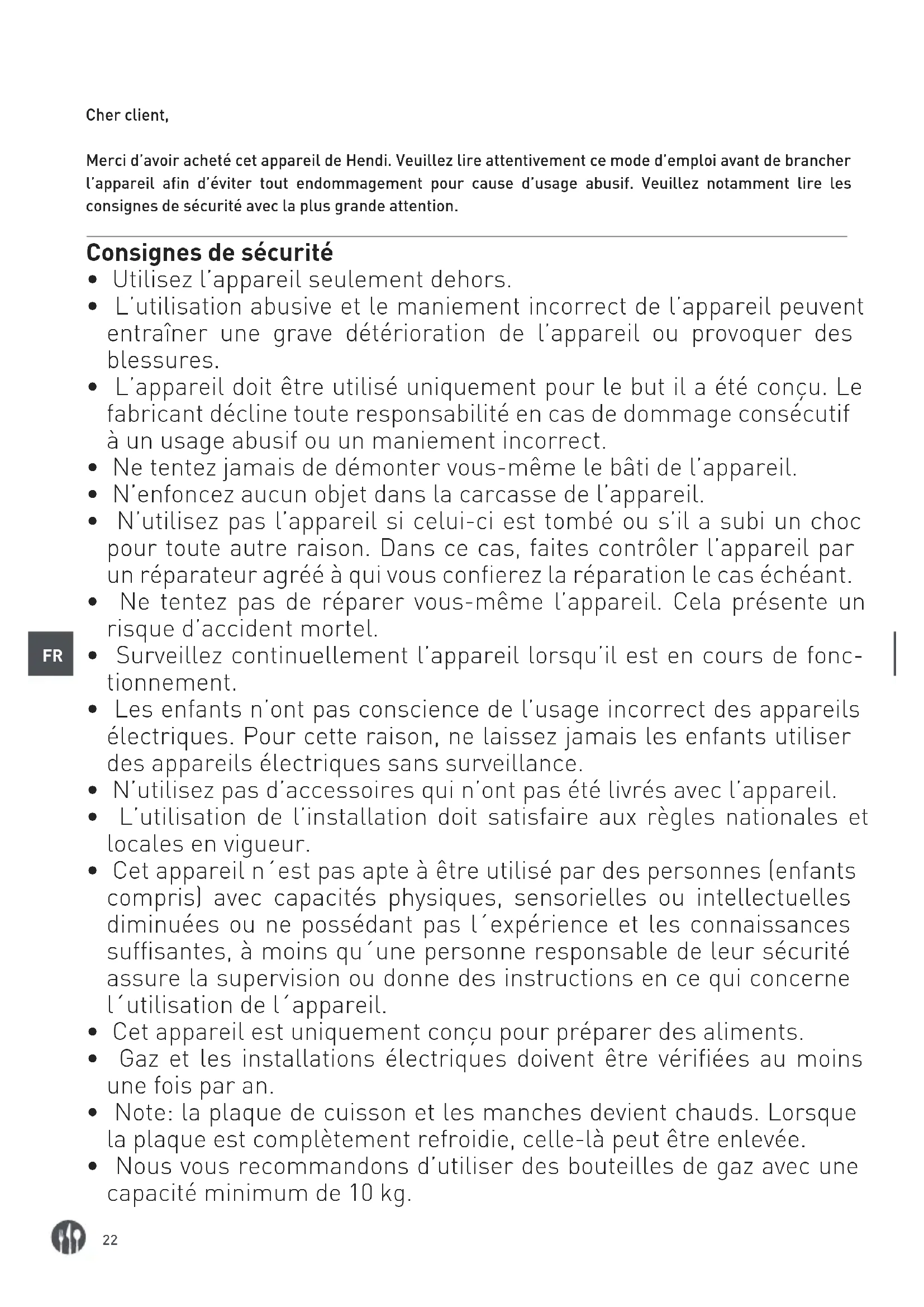 Cher client, Merci d’avoir acheté cet appareil de Hendi. Veuillez lire attentivement ce mode d’emploi avant de brancher l’appareil afin d’éviter tout endommagement pour cause d’usage abusif. Veuillez notamment lire les consignes de sécurité avec la plus grande attention. Consignes de sécurité