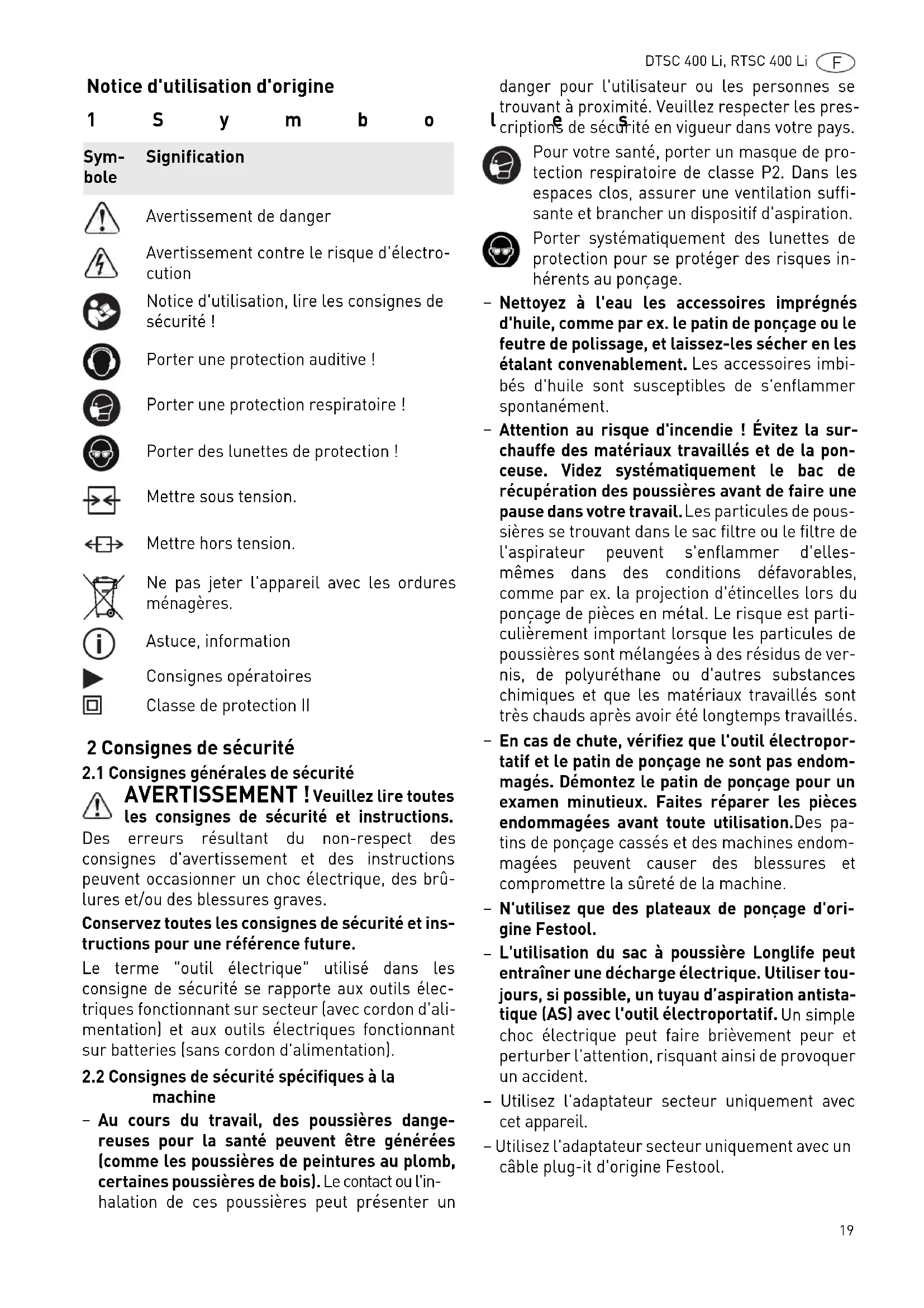 L'utilisation du sac à poussière Longlife peut entraîner une décharge électrique. Utiliser tou- jours, si possible, un tuyau d’aspiration antista- tique (AS) avec l'outil électroportatif. Un simple choc électrique peut faire brièvement peur et perturber l'attention, risquant ainsi de provoquer un accident. – Utilisez l'adaptateur secteur uniquement avec cet appareil. – Utilisez l'adaptateur secteur uniquement avec un câble plug-it d'origine Festool. Sym- bole Signification Avertissement de danger Avertissement contre le risque d'électro- cution Notice d'utilisation, lire les consignes de sécurité ! Porter une protection auditive ! Porter une protection respiratoire ! Porter des lunettes de protection ! Mettre sous tension. Mettre hors tension. Ne pas jeter l'appareil avec les ordures ménagères. Astuce, information Consignes opératoires Classe de protection II20 DTSC 400 Li, RTSC 400 Li