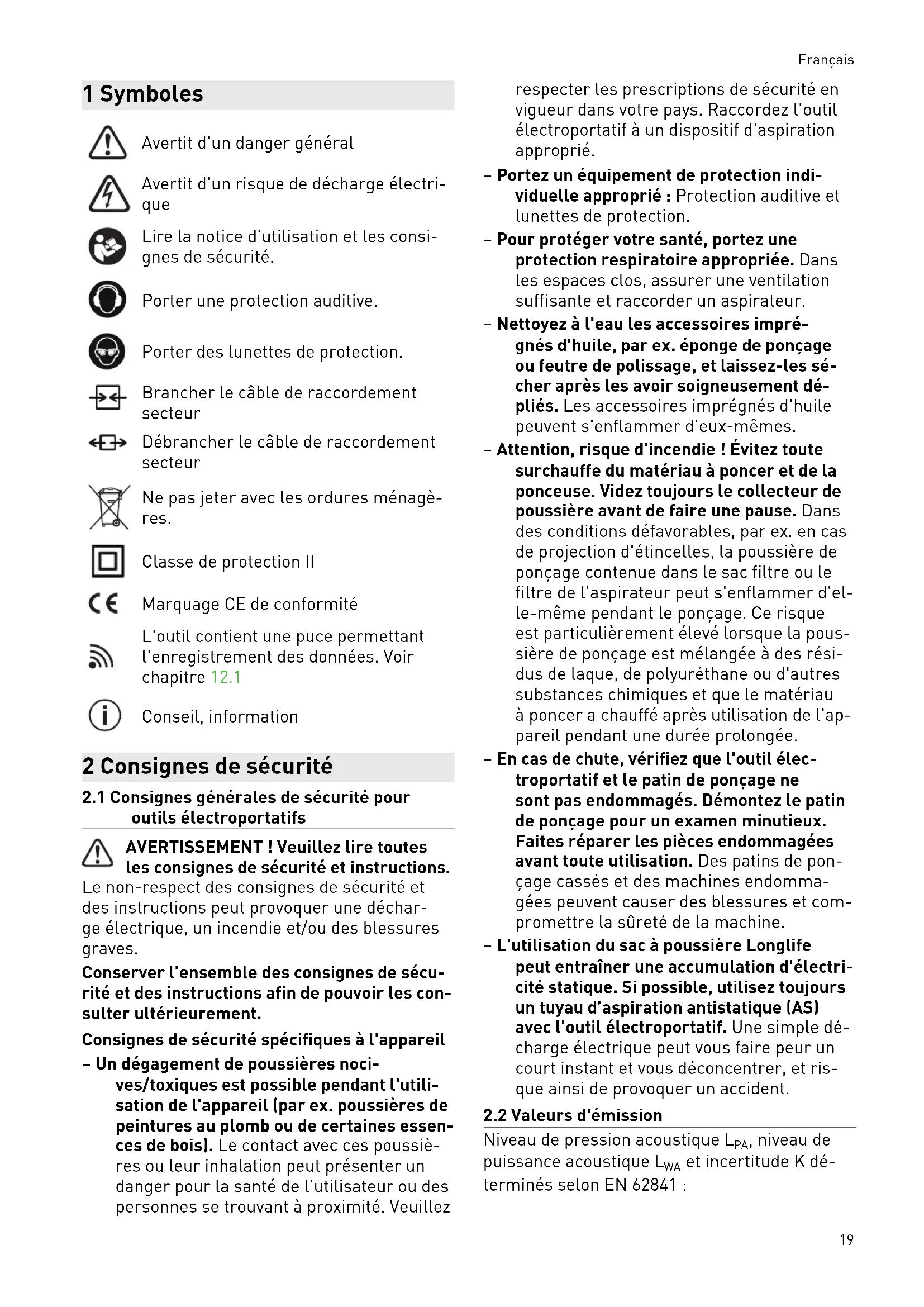 outils électroportatifs AVERTISSEMENT! Veuillez lire toutes les consignes de sécurité et instructions. Le non-respect des consignes de sécurité et des instructions peut provoquer une déchar ge électrique, un incendie et/ou des blessures graves. Conserver l'ensemble des consignes de sécu rité et des instructions afin de pouvoir les con sulter ultérieurement. Consignes de sécurité spécifiques à l'appareil – Un dégagement de poussières noci ves/toxiques est possible pendant l'utili sation de l'appareil (par ex. poussières de peintures au plomb ou de certaines essen ces de bois). Le contact avec ces poussiè res ou leur inhalation peut présenter un danger pour la santé de l'utilisateur ou des personnes se trouvant à proximité. Veuillez respecter les prescriptions de sécurité en vigueur dans votre pays. Raccordez l'outil électroportatif à un dispositif d'aspiration approprié. – Portez un équipement de protection indi viduelle approprié: Protection auditive et lunettes de protection. – Pour protéger votre santé, portez une protection respiratoire appropriée. Dans les espaces clos, assurer une ventilation suffisante et raccorder un aspirateur. – Nettoyez à l'eau les accessoires impré gnés d'huile, par ex. éponge de ponçage ou feutre de polissage, et laissez-les sé cher après les avoir soigneusement dé pliés. Les accessoires imprégnés d'huile peuvent s'enflammer d'eux-mêmes. – Attention, risque d'incendie! Évitez toute surchauffe du matériau à poncer et de la ponceuse. Videz toujours le collecteur de poussière avant de faire une pause. Dans des conditions défavorables, par ex. en cas de projection d'étincelles, la poussière de ponçage contenue dans le sac filtre ou le filtre de l'aspirateur peut s'enflammer d'el le-même pendant le ponçage. Ce risque est particulièrement élevé lorsque la pous sière de ponçage est mélangée à des rési dus de laque, de polyuréthane ou d'autres substances chimiques et que le matériau à poncer a chauffé après utilisation de l'ap pareil pendant une durée prolongée. – En cas de chute, vérifiez que l'outil élec troportatif et le patin de ponçage ne sont pas endommagés. Démontez le patin de ponçage pour un examen minutieux. Faites réparer les pièces endommagées avant toute utilisation. Des patins de pon çage cassés et des machines endomma gées peuvent causer des blessures et com promettre la sûreté de la machine. – L'utilisation du sac à poussière Longlife peut entraîner une accumulation d'électri cité statique. Si possible, utilisez toujours un tuyau d’aspiration antistatique (AS) avec l'outil électroportatif. Une simple dé charge électrique peut vous faire peur un court instant et vous déconcentrer, et ris que ainsi de provoquer un accident.