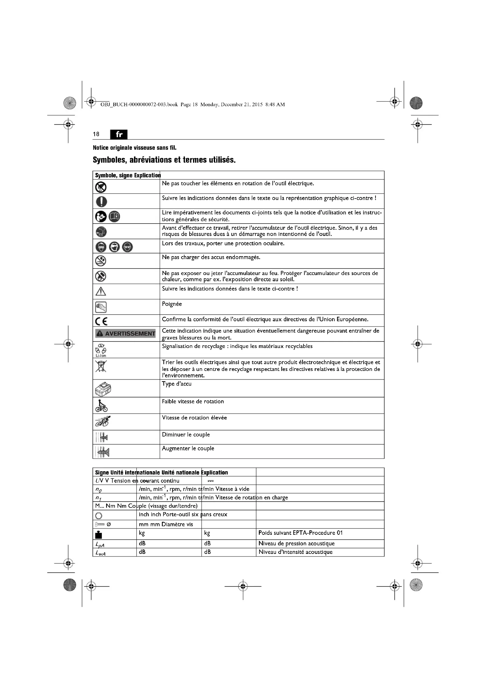 Notice originale visseuse sans fil. Symboles, abréviations et termes utilisés. Symbole, signe Explication Ne pas toucher les éléments en rotation de l’outil électrique. Suivre les indications données dans le texte ou la représentation graphique ci-contre ! Lire impérativement les documents ci-joints tels que la notice d’utilisation et les instruc- tions générales de sécurité. Avant d’effectuer ce travail, retirer l’accumulateur de l’outil électrique. Sinon, il y a des risques de blessures dues à un démarrage non intentionné de l’outil. Lors des travaux, porter une protection oculaire. Ne pas charger des accus endommagés. Ne pas exposer ou jeter l’accumulateur au feu. Protéger l’accumulateur des sources de chaleur, comme par ex. l’exposition directe au soleil. Suivre les indications données dans le texte ci-contre ! Poignée Confirme la conformité de l’outil électrique aux directives de l’Union Européenne. Cette indication indique une situation éventuellement dangereuse pouvant entraîner de graves blessures ou la mort. Signalisation de recyclage : indique les matériaux recyclables Trier les outils électriques ainsi que tout autre produit électrotechnique et électrique et les déposer à un centre de recyclage respectant les directives relatives à la protection de l’environnement. Type d’accu Faible vitesse de rotation Vitesse de rotation élevée Diminuer le couple Augmenter le couple Signe Unité internationale Unité nationale Explication U V V Tension en courant continu