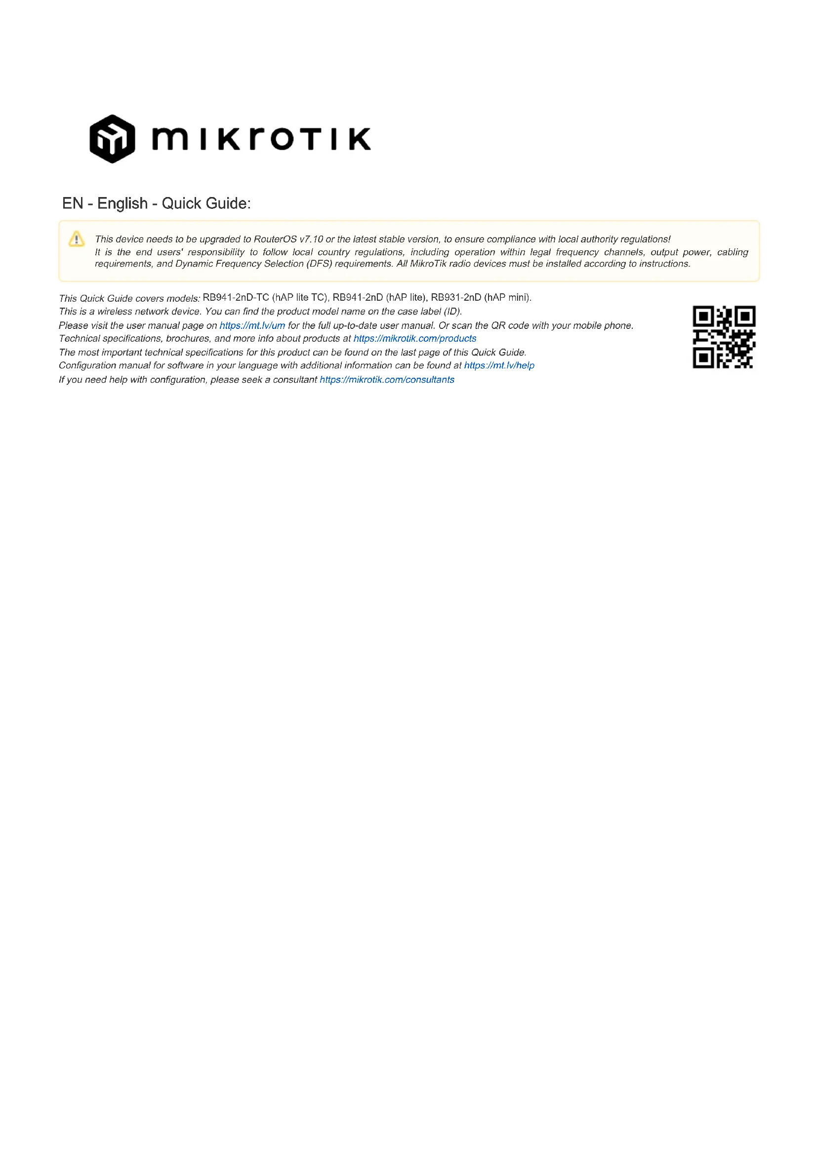 Il s'agit d'un périphérique réseau sans fil. Vous pouvez trouver le nom du modèle du produit sur l'étiquette du boîtier (ID). Veuillez visiter la page du manuel d'utilisation sur pour le manuel d'utilisation complet et à jour.https://mt.lv/um-fr Ou scannez le code QR avec votre téléphone portable. Spécifications techniques, brochures et plus d'informations sur les produits surhttps://mikrotik.com/products Les spécifications techniques les plus importantes de ce produit se trouvent sur la dernière page de ce guide rapide. Vous trouverez le manuel de configuration du logiciel dans votre langue avec des informations supplémentaires sur https://mt.lv/help-fr Si vous avez besoin d'aide pour la configuration, veuillez consulter un consultant https://mikrotik.com/consultants Premiers pas: Cet appareil doit être mis à niveau vers RouterOS v7.10 ou la dernière version stable, pour garantir la conformité aux réglementations des autorités locales! Il est de la responsabilité des utilisateurs finaux de suivre les réglementations locales du pays, y compris le fonctionnement dans les canaux de fréquence légaux, la puissance de sortie, les exigences de câblage et les exigences de sélection dynamique de fréquence (DFS). Tous les appareils radio MikroTik doivent être installés conformément aux instructions.Assurez-vous que votre fournisseur de services Internet autorise les modifications matérielles et attribue automatiquement une adresse IP; Connectez le câble de votre fournisseur de services Internet au port Ethernet1; Connectez l'appareil à la source d'alimentation; Connectez-vous à l'appareil via l'un des ports, à l'exclusion d'Ethernet1, ou du réseau sans fil "MikroTik-..." (assurez-vous de vérifier les mots de passe sans fil sur l'autocollant); Établir une connexion à l'aide d'une application mobile. Vous pouvez également utiliser WebFig dans un navigateur Web ou l'outil de configuration "WinBox" à l'adresse ; https://mt.lv/WinBox plusieurs méthodes de configuration sont disponibles pour garantir l’accessibilité Démarrez la configuration dans l'outil choisi en utilisant l'adresse IP par défaut 192.168.88.1. Si l'adresse IP n'est pas disponible, utilisez WinBox et choisissez l'onglet "Neighbors" pour trouver le périphérique; Procédez à la connexion en utilisant l'adresse MAC. Le nom d'utilisateur est "admin", et il n'y a pas de mot de passe (ou, pour certains modèles, vérifiez les mots de passe utilisateur et sans fil sur l'autocollant); Cliquez sur le bouton "Check for updates" et mettez à jour RouterOS vers la dernière version; Pour une mise à jour manuelle de l'appareil, visitez la page des produits sur pour trouver votre produit. Les paquets nécessaires https://mikrotik.com/products sont accessibles dans le menu "Support&Downloads"; Téléchargez les paquets téléchargés dans le menu "Files" de WebFig ou WinBox et redémarrez l'appareil; En mettant à jour votre logiciel RouterOS vers la dernière version, vous pouvez garantir des performances optimales, une stabilité et des mises à jour de sécurité; Dans le menu "QuickSet", configurez ce qui suit : Choisissez votre pays pour appliquer les paramètres de régulation du pays; Configurez le mot de passe de votre réseau sans fil dans le champ de gauche; Configurez le mot de passe de votre routeur dans le champ inférieur. Information sur la sécurité: Avant de travailler sur un équipement MikroTik, soyez conscient des dangers liés aux circuits électriques et familiarisez-vous avec les pratiques standard de prévention des accidents. Le programme d'installation doit être familiarisé avec les structures, les termes et les concepts du réseau. Utilisez uniquement l'alimentation et les accessoires approuvés par le fabricant et qui se trouvent dans l'emballage d'origine de ce produit. Cet équipement doit être installé par du personnel formé et qualifié, conformément à ces instructions d'installation. L'installateur est responsable de s'assurer que l'installation de l'équipement est conforme aux codes électriques locaux et nationaux. N'essayez pas de démonter, réparer ou modifier l'appareil. Ce produit est destiné à être installé à l'intérieur. Gardez ce produit loin de l'eau, du feu, de l'humidité ou des environnements chauds. Nous ne pouvons garantir qu'aucun accident ou dommage ne se produira en raison d'une mauvaise utilisation de l'appareil. Veuillez utiliser ce produit avec soin et l'utiliser à vos propres risques! La prise de courant doit être installée à proximité de l'équipement et doit être facilement accessible. En cas de panne de l'appareil, veuillez le déconnecter de l'alimentation.La façon la plus rapide de le faire est de débrancher l'adaptateur secteur de la prise de courant. Pour éviter la contamination de l'environnement, séparez l'appareil des déchets ménagers et éliminez-le de manière sûre, par exemple dans des zones désignées. Familiarisez-vous avec les procédures pour transporter correctement l'équipement vers les points de collecte désignés dans votre région. cet équipement MikroTik est conforme aux limites d'exposition aux rayonnements Union européenne établies pourExposition aux rayonnements radiofréquences: un environnement non contrôlé. Cet appareil MikroTik doit être installé et utilisé à au moins centimètres de votre corps, de l'utilisateur professionnel ou du grand 20 public. Fabricant: Mikrotikls SIA, Unijas 2, Riga, Lettonie, LV1039. HR - Hrvatski. Brzi vodič: Ovaj kratki vodič obuhvaća modele: RB941-2nD-TC (hAP lite TC), RB941-2nD (hAP lite),RB931-2nD (hAP mini).
