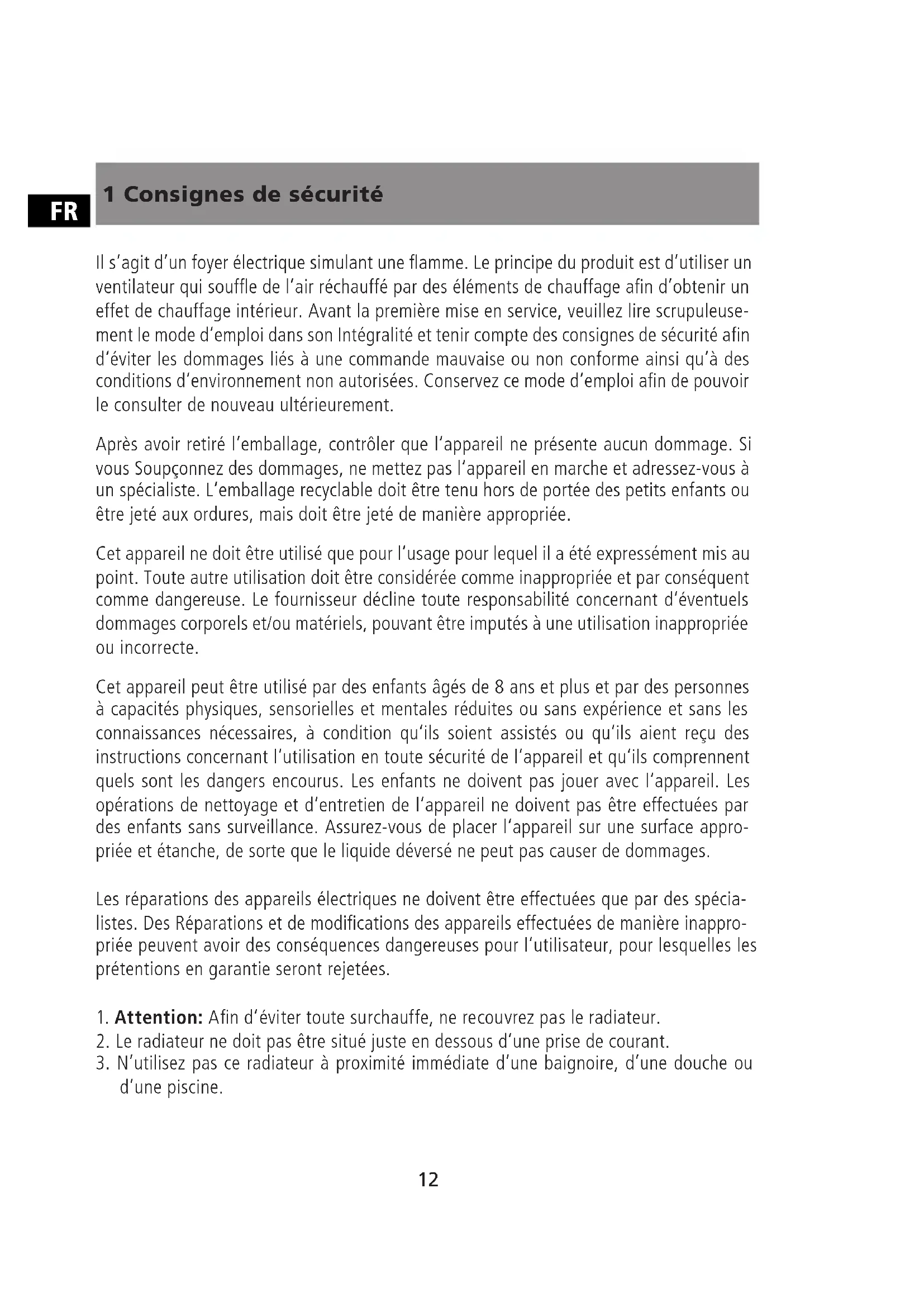 Il s'agit d'un foyer électrique simulant une flamme. Le principe du produit est d'utiliser un ventilateur qui souffle de l'air réchauffé par des éléments de chauffage afin d'obtenir un effet de chauffage interieur. Avant la première mise en service, veuillez tire scrupuleusement le mode d'emploi dans son Intégralité et tener compte des consignes de sécurité afin d'éviter les dommages liés à une commande mauvaise ou non conforme ainsi qu'à des conditions d'environnement non autorisées. Conserve ce mode d'emploi afin de pouvoir le consulter de nouveau ultérieurement.