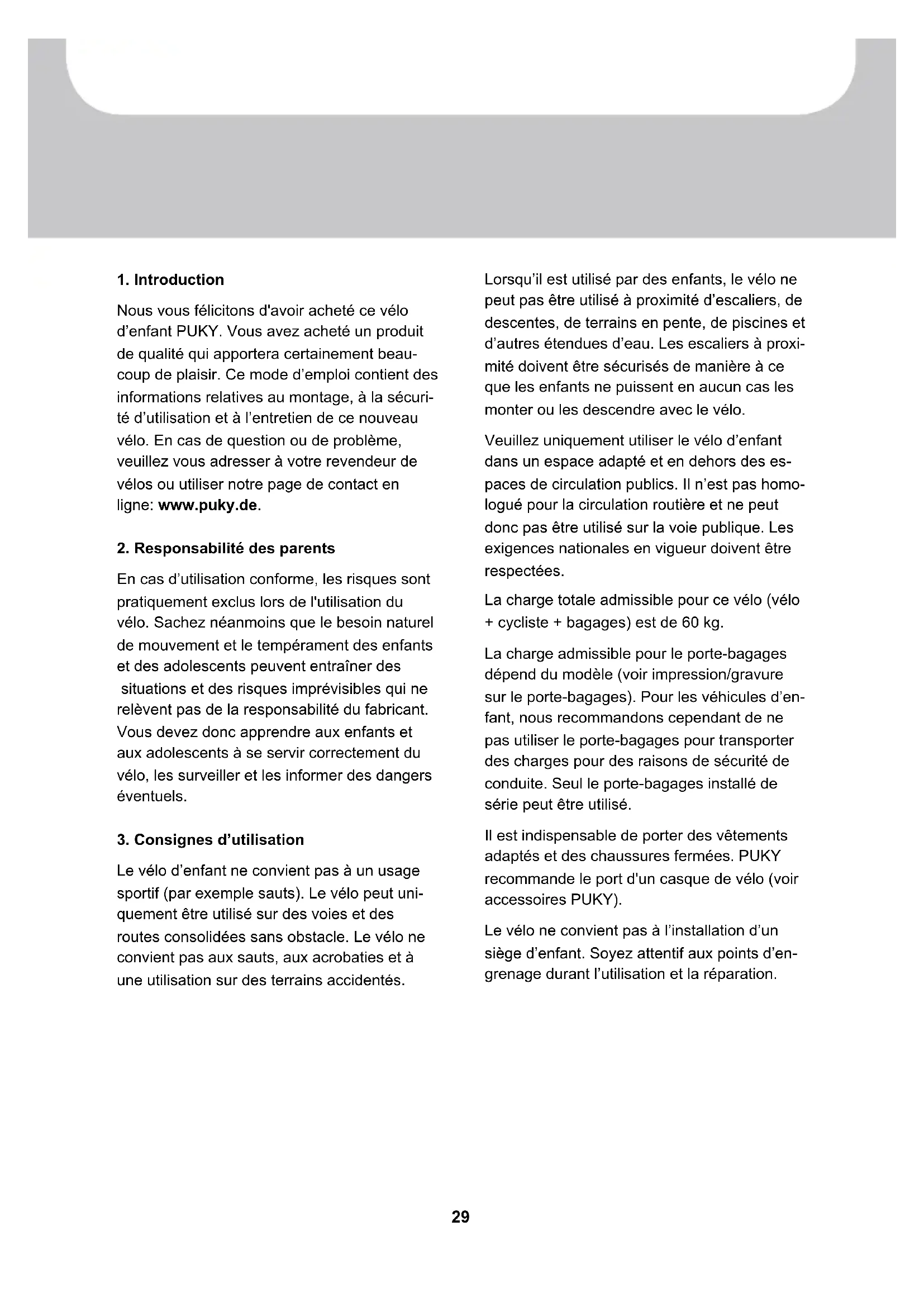 Nous vous félicitons d'avoir acheté ce vélo d'enfant PUKY. Vous avez acheté un produit de qualité qui apportera certainement beau-coup de plaisir. Ce mode d'emploi contient des informations relatives au montage, à la sécurité d'utilisation et à l'entretien de ce nouveau vélo. En cas de question ou de problème, veuillez vous adresser à votre revendeur de vélos ou utiliser notre page de contact en ligne: www.puky.de.