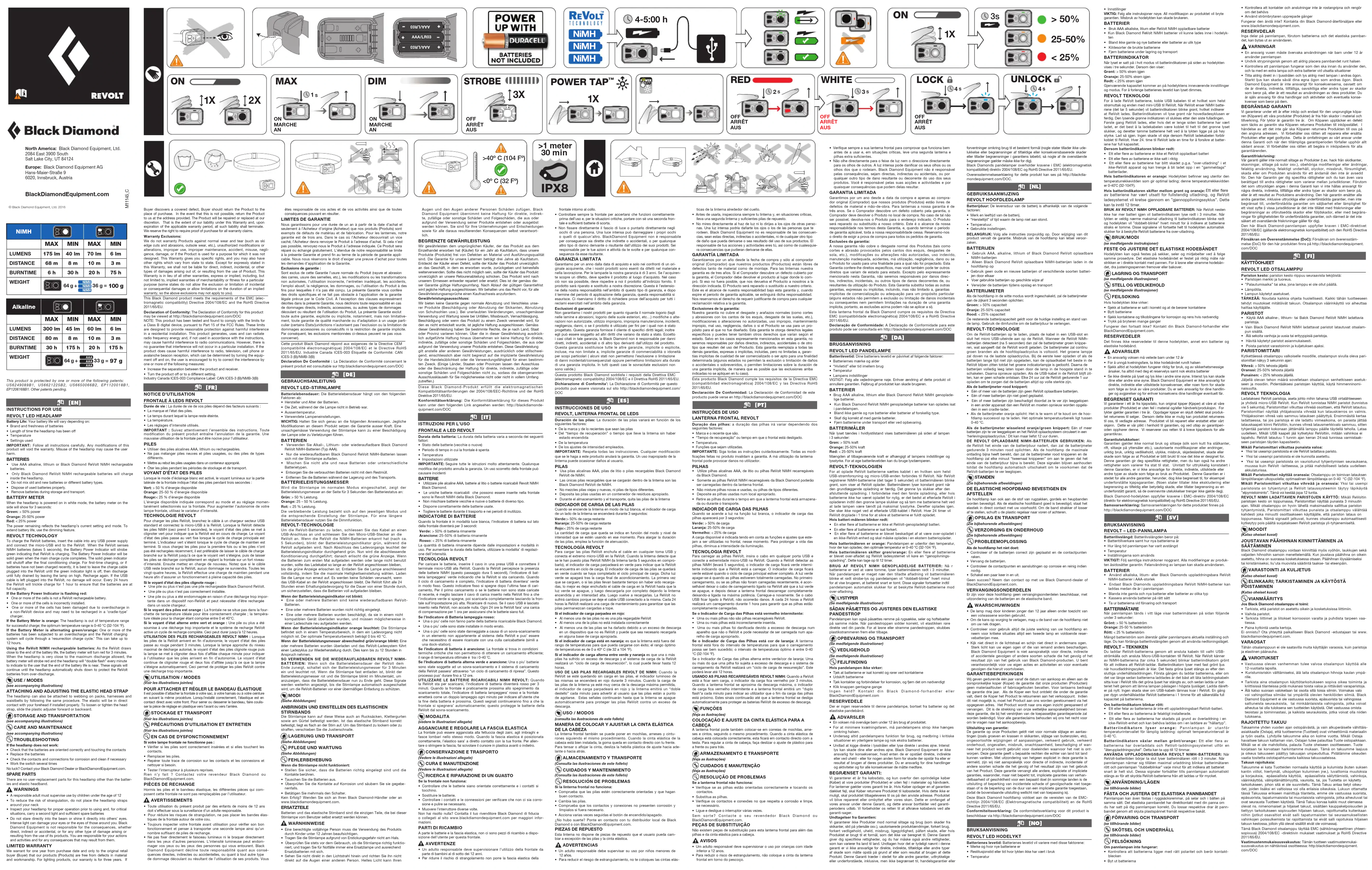 - Une pile ou plus a été endommagée en raison d’une décharge trop impor- tante dans un dispositif non-ReVolt et peut nécessiter d’être rechargée dans un socle chargeur. Si le voyant des piles est orange : La frontale ne se situe pas dans la four- chette de température idéale pour être correctement chargée ; la tempéra-ture idéale pour la charger étant comprise entre 0 et 40°C.Si le voyant d’état alterne entre vert et orange : Une pile ou plus a été soumise à une décharge trop importante et le système de recharge ReVolt active un cycle de recharge complète. Ceci peut durer jusqu’à 12 heures.UTILISATION DES PILES RECHARGEABLES REVOLT NIMH : Lorsque les piles de la ReVolt arrivent en fin d’autonomie, le voyant d’état des piles passe au rouge pendant 3 minutes. Lorsque la lampe approche du niveau maximal de décharge autorisé, le voyant d’état des piles clignote rouge puis la lampe se met à clignoter deux fois d’affilée chaque minute pour indiquer à l’utilisateur que les piles arrivent en fin d’autonomie. Le voyant d’état continue de clignoter rouge et deux fois d’affilée jusqu’à ce que la lampe s’éteigne automatiquement. Ceci permet de protéger les piles ReVolt contre une décharge trop importante. UTILISATION / MODES(Voir les illustrations jointes)POUR ATTACHER ET RÉGLER LE BANDEAU ÉLASTIQUEIl est possible d’attacher la frontale à votre sac, à votre harnais ou à votre ceinture en suivant la même procédure. Lorsqu’installé correctement, l’élastique est en contact direct avec votre front. Pour serrer ou desserrer le bandeau, faire coulis-ser la pièce de réglage en plastique vers l’avant ou vers l’arrière.STOCKAGE ET TRANSPORT(Voir les illustrations jointes)PRÉCAUTIONS D’UTILISATION ET ENTRETIEN (Voir les illustrations jointes)EN CAS DE DYSFONCTIONNEMENTSi votre lampe frontale ne fonctionne pas :• Vérifier si les piles sont correctement insérées et si elles touchent les contacts.• Remplacer les piles.• Repérer toute trace de corrosion sur les contacts et les connexions et nettoyer si besoin.• Tester l’interrupteur à plusieurs reprises.Rien n’y fait ? Contactez votre revendeur Black Diamond ou BlackDiamondEquipment.com.PIÈCES DE RECHANGEHormis les piles et le bandeau élastique, les différentes pièces qui com-posent cette frontale ne sont pas remplaçables par l’utilisateur.AVERTISSEMENTS• Toute utilisation du présent produit par des enfants de moins de 12 ans doit s’effectuer sous la surveillance d’un adulte responsable.