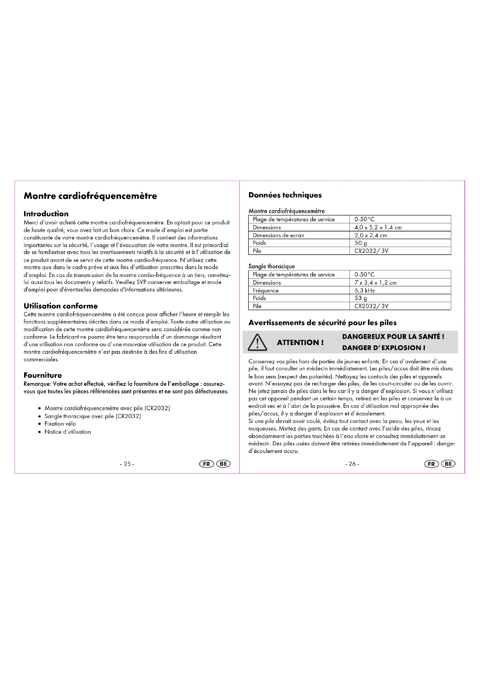 Sangle thoracique et Résistance à l’eau Résistance à l’eau selon IEC 60529 IPX7. Conseils d’entretien Ne nettoyez les appareils qu’avec un chiffon sec ne faisant pas de peluches, comme pour le nettoyage des verres de lunettes par exemple. Après chaque utilisation, veuillez nettoyer votre sangle thoracique et le bracelet de votre montre avec un peu d’eau tiède ou d’eau savonneuse et une éponge. La sangle textile de la sangle thoracique est lavable en machine à 30°. Attention : la montre en soi ne doit jamais être mouillée ! Essuyez bien tout ensuite avec un chiffon doux et accrochez la sangle pour la faire sécher. La sueur et les salissures perturbent le bon fonctionnement de l’émetteur. Pile: CR2032