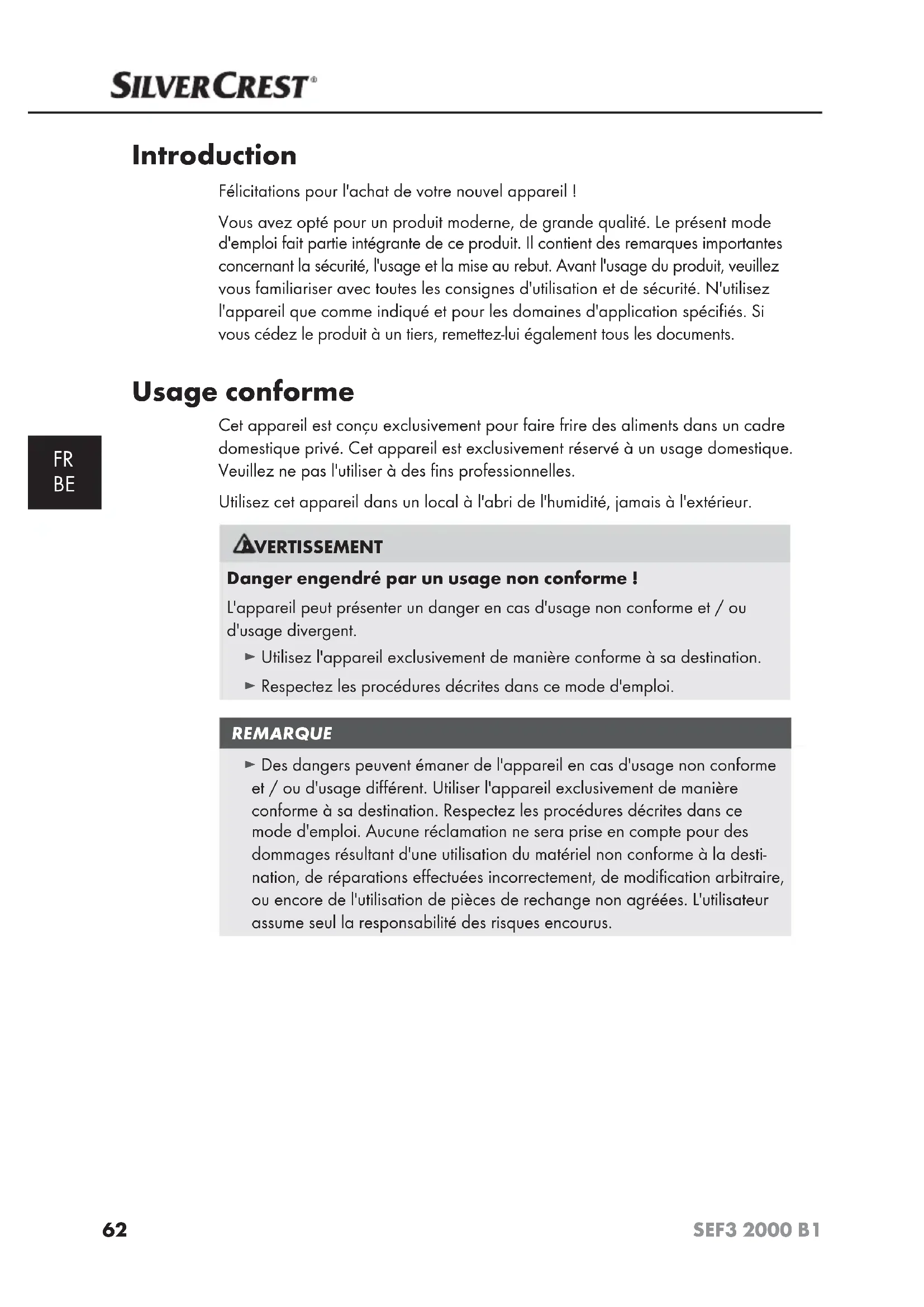 Introduction Félicitations pour l'achat de votre nouvel appareil ! Vous avez opté pour un produit moderne, de grande qualité. Le présent mode d'emploi fait partie intégrante de ce produit. Il contient des remarques importantes concernant la sécurité, l'usage et la mise au rebut. Avant l'usage du produit, veuillez vous familiariser avec toutes les consignes d'utilisation et de sécurité. N'utilisez l'appareil que comme indiqué et pour les domaines d'application spécifiés. Si vous cédez le produit à un tiers, remettez-lui également tous les documents. Usage conforme Cet appareil est conçu exclusivement pour faire frire des aliments dans un cadre domestique privé. Cet appareil est exclusivement réservé à un usage domestique. Veuillez ne pas l'utiliser à des fins professionnelles. Utilisez cet appareil dans un local à l'abri de l'humidité, jamais à l'extérieur. AVERTISSEMENT Danger engendré par un usage non conforme! L'appareil peut présenter un danger en cas d'usage non conforme et / ou d'usage divergent. ► Utilisez l'appareil exclusivement de manière conforme à sa destination. ► Respectez les procédures décrites dans ce mode d'emploi. REMARQUE ► Des dangers peuvent émaner de l'appareil en cas d'usage non conforme et / ou d'usage différent. Utiliser l'appareil exclusivement de manière conforme à sa destination. Respectez les procédures décrites dans ce mode d'emploi. Aucune réclamation ne sera prise en compte pour des dommages résultant d'une utilisation du matériel non conforme à la desti- nation, de réparations effectuées incorrectement, de modification arbitraire, ou encore de l'utilisation de pièces de rechange non agréées. L'utilisateur assume seul la responsabilité des risques encourus.63 SEF3 2000 B1