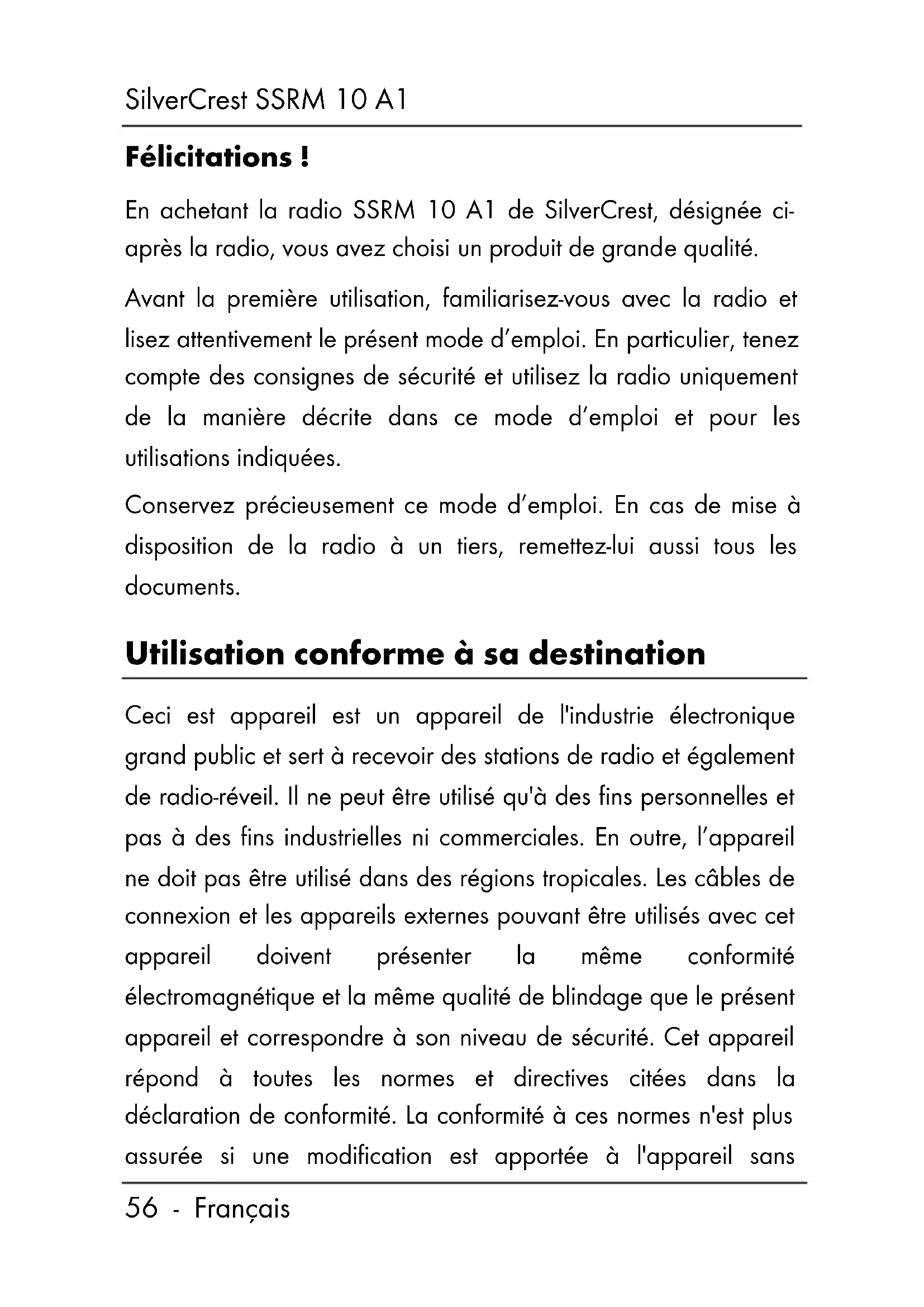 Félicitations ! En achetant la radio SSRM 10 A1 de SilverCrest, désignée ci- après la radio, vous avez choisi un produit de grande qualité. Avant la première utilisation, familiarisez-vous avec la radio et lisez attentivement le présent mode d’emploi. En particulier, tenez compte des consignes de sécurité et utilisez la radio uniquement de la manière décrite dans ce mode d’emploi et pour les utilisations indiquées. Conservez précieusement ce mode d’emploi. En cas de mise à disposition de la radio à un tiers, remettez-lui aussi tous les documents. Utilisation conforme à sa destination Ceci est appareil est un appareil de l'industrie électronique grand public et sert à recevoir des stations de radio et également de radio-réveil. Il ne peut être utilisé qu'à des fins personnelles et pas à des fins industrielles ni commerciales. En outre, l’appareil ne doit pas être utilisé dans des régions tropicales. Les câbles de connexion et les appareils externes pouvant être utilisés avec cet appareil doivent présenter la même conformité électromagnétique et la même qualité de blindage que le présent appareil et correspondre à son niveau de sécurité. Cet appareil répond à toutes les normes et directives citées dans la déclaration de conformité. La conformité à ces normes n'est plus assurée si une modification est apportée à l'appareil sansSilverCrest SSRM 10 A1 Français - 57 l'accord du fabricant. Le fabricant décline toute responsabilité en cas de dommages ou pannes en résultant. Utilisez exclusivement les accessoires mentionnés par le fabricant. Veuillez tenir compte des réglementations et lois nationales du pays d'utilisation. Contenu du coffret Sortez l'appareil et tous les accessoires de l'emballage. Retirez tous les matériaux d'emballage et vérifiez que toutes les pièces sont au complet et en parfait état. Si la livraison est incomplète ou endommagée, veuillez contacter le fabricant. A Radio FM SSRM 10 A1 avec dragonne B Écouteurs de type : SSRM 10 A1 C 2 piles 1,5 V, AAA, Micro LR3 D Le présent mode d'emploi (représentation non contractuelle)SilverCrest SSRM 10 A1