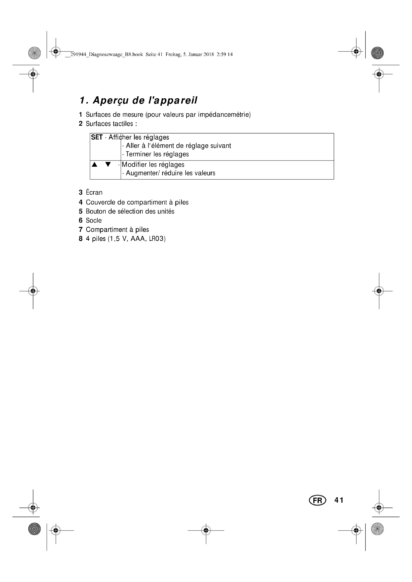 1 pèse-personne impédancemètre 4 piles (1,5 V, AAA, LR03)|8 (insérées) 1 mode d'emploi