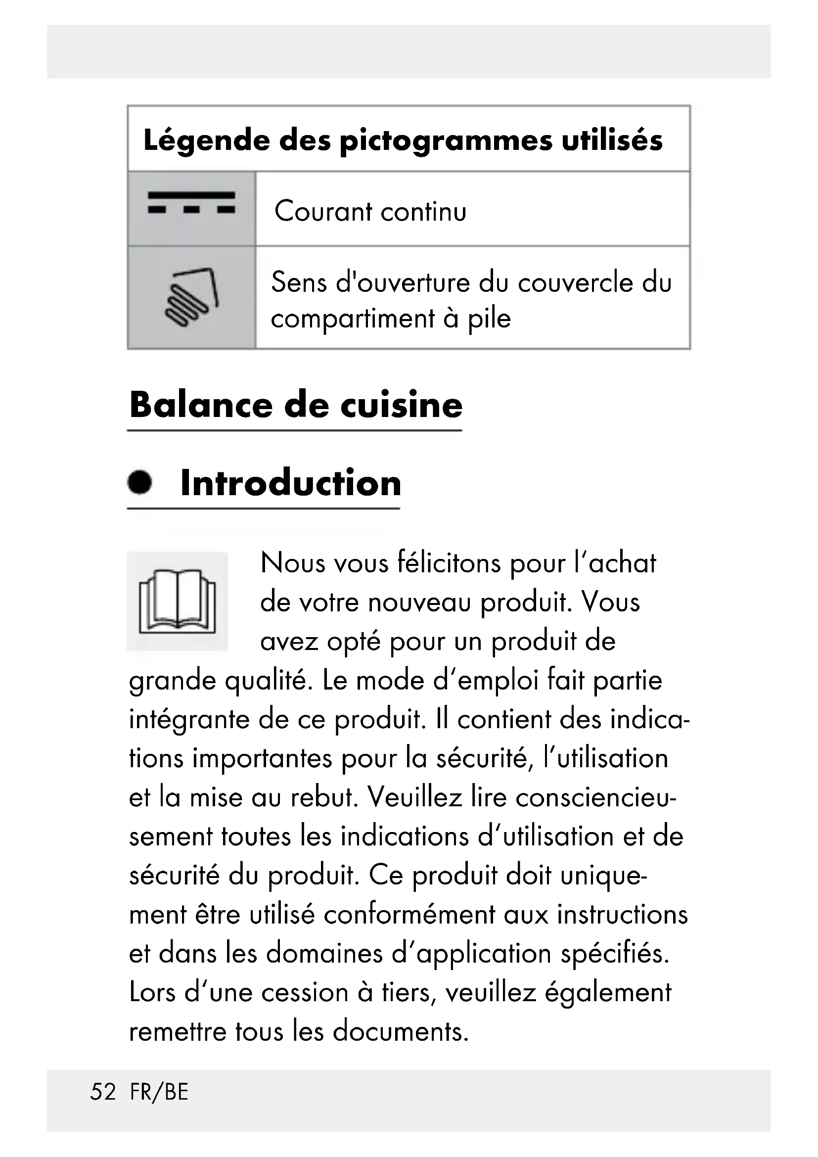 Veuillez respecter l‘identification des matériaux d‘emballage pour le tri sélectif, ils sont identifiés avec des abbréviations (a) et des chiffres (b) ayant la signification suivante : 1–7 : plastiques / 20–22 : papiers et cartons / 80–98 : matériaux composite. Le produit et les matériaux d’embal- lage sont recyclables, mettez-les au rebut séparément pour un meilleur traitement des déchets. Le logo Triman n’est valable qu’en France.73 FR/BE Votre mairie ou votre municipalité vous renseigneront sur les possibili- tés de mise au rebut des produits usagés. Afin de contribuer à la protection de l’environnement, veuillez ne pas jeter votre produit usagé dans les ordures ménagères, mais élimi- nez-le de manière appropriée. Pour obtenir des renseignements concer- nant les points de collecte et leurs horaires d’ouverture, vous pouvez contacter votre municipalité. Les piles / piles rechargeables défectueuses ou usagées doivent être recyclées conformément à la directive 2006/66/CE et ses modifica- tions. Les piles et / ou piles rechargeables et / ou le produit doivent être retournés dans les centres de collecte proposés.74 FR/BE Pollution de l’environnement par la mise au rebut incor- recte des piles / piles rechar- geables ! Les piles / piles rechargeables ne doivent pas être mises au rebut avec les ordures ménagères. Elles peuvent contenir des métaux lourds toxiques et doivent être considérées comme des déchets spéciaux. Les symboles chimiques des métaux lourds sont les suivants : Cd = cadmium, Hg = mercure, Pb = plomb. Pour cette raison, veuillez toujours déposer les piles / piles rechargeables usagées dans les conteneurs de recyclage communaux. Garantie Le produit a été fabriqué selon des critères de qualité stricts et contrôlé consciencieusement avant sa livraison. En cas de défaillance, vous êtes en droit de retourner ce produit au ven- deur. La présente garantie ne constitue pas une restriction de vos droits légaux.75 FR/BE Ce produit bénéficie d‘une garantie de 3 ans à compter de sa date d’achat. La durée de garantie débute à la date d’achat. Veuillez conserver le ticket de caisse original. Il fera office de preuve d’achat. Si un problème matériel ou de fabrication devait survenir dans 3 ans suivant la date d‘achat de ce produit, nous assurons à notre discrétion la réparation ou le remplacement du produit sans frais supplémentaires. La ga- rantie prend fin si le produit est endommagé suite à une utilisation inappropriée ou à un entretien défaillant. La garantie couvre les vices matériels et de fabrication. Cette garantie ne s’étend ni aux pièces du produit soumises à une usure nor- male (p. ex. des piles) et qui, par conséquent, peuvent être considérées comme des pièces d’usure, ni aux dommages sur des compo-76 FR/BE sants fragiles, comme des interrupteurs, des batteries ou des éléments fabriqués en verre.77 NL/BE Legenda van de gebruikte pictogrammen ............................ Pagina 78 Inleiding ........................................... Pagina 78 Correct gebruik ................................... Pagina 79 Beschrijving van de onderdelen ........Pagina 79 Technische gegevens .........................Pagina 80 Omvang van de levering ...................Pagina 80 Veiligheidsinstructies ...........Pagina 81 Algemene veiligheidsinstructies .........Pagina 81 Veiligheidsinstructies voor batterijen / accu‘s ...............................Pagina 86 Voor de ingebruikname ....Pagina 91 Batterijen vervangen ...........................Pagina 91 Bediening ........................................Pagina 92 Wegen ................................................Pagina 92 Doorwegen .........................................Pagina 94 Meeteenheid veranderen ..................Pagina 95 Uitschakelen ........................................Pagina 95 Storingen verhelpen ............. Pagina 96 Reiniging en onderhoud ...Pagina 96 Afvoer ................................................Pagina 97 Garantie ..........................................Pagina 9978 NL/BE Legenda van de gebruikte pictogrammen Gelijkstroom Openingsrichting van het batterijvakdeksel Keukenweegschaal Inleiding Hartelijk gefeliciteerd met de aan- koop van uw nieuwe product. U heeft voor een hoogwaardig pro- duct gekozen. De gebruiksaanwijzing is een deel van het product. Deze bevat belangrijke aanwijzingen voor veiligheid, gebruik en ver- wijdering. Maakt U zich voor de ingebruik- name van het product met alle bedienings- en veiligheidsvoorschriften vertrouwd. Gebruik het product alleen zoals beschreven en voor de aangegeven toepassingsgebieden.79 NL/BE Overhandig alle documenten bij doorgifte van het product aan derden. Correct gebruik Het product is bedoeld voor het wegen en doorwegen van huishoudelijke hoeveelheden levensmiddelen. Het product is er niet voor bedoeld met levensmiddelen in contact te ko- men. Het product is uitsluitend bestemd voor het gebruik in privéhuishoudens en mag niet in medische of commerciële omgevingen worden gebruikt. De fabrikant is niet aansprakelijk voor schade als gevolg van onjuist gebruik. Beschrijving van de onderdelen Keukenweegschaal (afb. A+B):