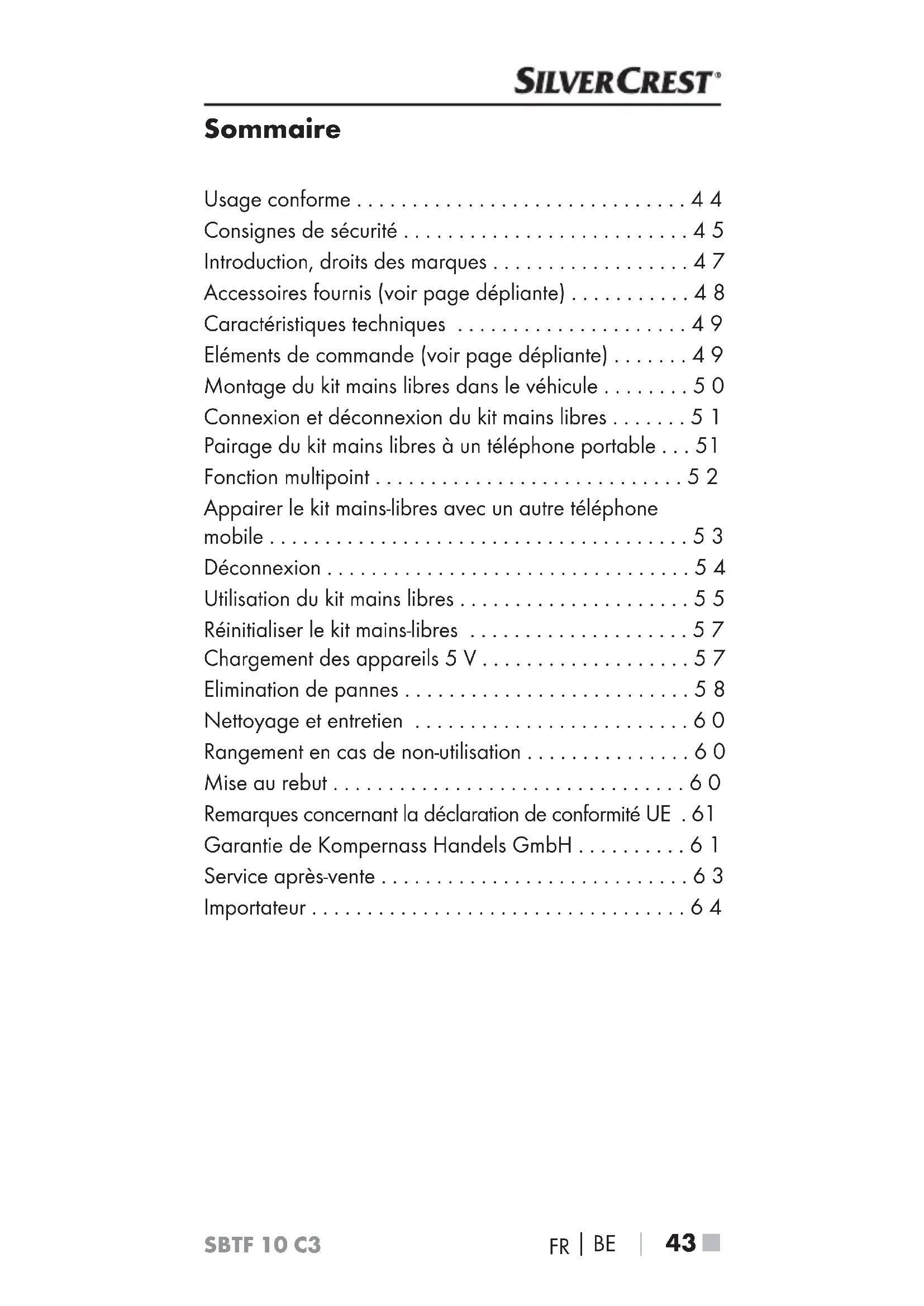 Ɣ Ne vous laissez pas distraire par l‘opération et l‘affi- chage du kit mains libres et surtout, ne relâchez pas votre vigilance face à la circulation routière ! Ɣ Avant de mettre le véhicule en marche, familiarisez- vous avec l‘opération et l‘usage en toute sécurité du kit mains libres ! Ɣ Installez le kit mains libres dans le véhicule de telle manière qu‘il n‘obstrue pas votre vue et que l‘appareil ne soit pas installé dans une zone d‘impact des passa- gers de l‘habitacle ou dans la zone de déploiement de l‘airbag. Pour ce faire, veuillez lire le mode d’emploi du constructeur du véhicule. Consignes de sécurité générales Ɣ N‘essayez pas d‘ouvrir ou de réparer l‘appareil. Dans ce cas, la sécurité n‘est plus assurée et vous perdez le bénéfice de la garantie. Ɣ Confiez la réparation de l‘appareil défectueux exclu- sivement au service après-vente ou à des techniciens spécialisés agréés. Nous n‘assumons aucune responsa- bilité pour tous les dommages résultant d‘un traitement abusif ou non conforme, du recours à la force ou d‘une modification non autorisée. Ɣ N‘exposez pas l‘appareil à l‘humidité, à des tempéra- tures extrêmes (> +70°C) ou à de fortes vibrations. Ɣ Cet appareil ne doit pas être utilisé par des personnes (enfants compris) ayant des capacités physiques, mentales et sensorielles réduites ou qui n‘ont pas l‘expérience et les connaissances nécessaires, à moins qu‘elles ne soient sous la surveillance d‘une personne responsable de leur sécurité ou qu‘elles aient reçu de cette personne des directives concernant l‘utilisation de l‘appareil. Danger ! Ɣ Les matériaux d‘emballage ne sont pas des jouets. Tenez les films, les sacs et tous les autres matériaux d‘emballage hors de portée des enfants. Il y a risque d‘étouffement.SBTF 10 C3