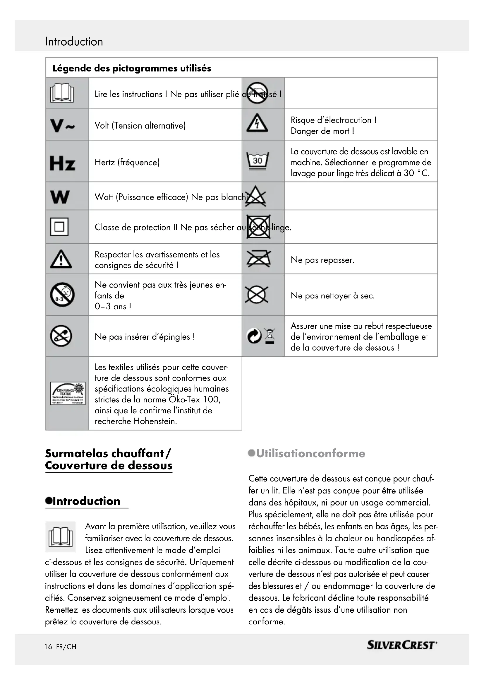 - Bei Eigenverschulden des Kunden. Die gesetzlichen Gewährleistungen des Kunden bleiben durch die Garantie unberührt. Für Geltendmachung eines Garantiefalles inner- halb der Garantiezeit ist durch den Kunden der Nachweis des Kaufes zu führen. Die Garantie ist innerhalb eines Zeitraumes von 3 Jahren ab Kaufdatum gegenüber der MGG Elektro GmbH-Service c / o Dachser GmbH & Co. KG Thomas-Dachser-Str. 1 89129 Langenau, Germany 02151 780 96 96 (Mo.–Fr.: 8–18 Uhr) 01206 091 047 (Mo.–Fr.: 8–18 Uhr) 044 200 1140 (Mo.–Fr.: 8–18 Uhr) geltend zu machen. Der Kunde hat im Garantiefall das Recht zur Repa- ratur der Ware bei unseren eigenen oder bei von uns autorisierten Werkstätten. Das Wärmeunterbett aus keinem Grund öffnen – im Falle von Öffnung oder Veränderung erlischt der Garantieanspruch. Weitergehende Rechte werden dem Kunden (aufgrund der Garantie) nicht eingeräumt. In vielen Fällen liegt der Grund für Reklamationen in Bedie- nungsfehlern. Diese könnten ohne weiteres telefo- nisch oder per E-Mail behoben werden. Bitte wenden Sie sich an die für Sie eingerichtete Ser- vice-Hotline, bevor Sie das Wärmeunterbett beim Hersteller reklamieren. IAN 96962 Konformitätserklärung Dieses Wärmeunterbett erfüllt die Anforderungen der geltenden europäischen und nationalen Richtli- nien. Dies wird durch CE-Kennzeichnung bestätigt. Entsprechende Erklärungen sind beim Hersteller hinterlegt.1415 FR/CH Table des matières Légende des pictogrammes utilisés .......................................................................... Page 16 Introduction ................................................................................................................................... Page 16 Utilisation conforme ............................................................................................................................Page 16 Description des pièces et éléments ....................................................................................................Page 17 Fourniture ............................................................................................................................................. Page 17 Données techniques ............................................................................................................................ Page 17 Instructions de sécurité importantes ........................................................................Page 17 Système de sécurité ...............................................................................................................Page 20 Caractéristiques particulières ........................................................................................Page 20 Mise en service ...........................................................................................................................Page 20 Placement de la couverture de dessous ............................................................................................Page 20 Activation / désactivation / sélection de la température ................................................................... Page 20 Niveaux de température ....................................................................................................................Page 21 Sélection de l’heure de désactivation automatique .......................................................................... Page 21 Nettoyage et entretien ........................................................................................................ Page 21 Rangement.....................................................................................................................................Page 22 Mise au rebut ............................................................................................................................... Page 22 Garantie / service .....................................................................................................................Page 23 Déclaration de conformité ................................................................................................ Page 2316 FR/CH Introduction Surmatelas chauffant / Couverture de dessous Introduction Avant la première utilisation, veuillez vous familiariser avec la couverture de dessous. Lisez attentivement le mode d’emploi ci-dessous et les consignes de sécurité. Uniquement utiliser la couverture de dessous conformément aux instructions et dans les domaines d’application spé- cifiés. Conservez soigneusement ce mode d’emploi. Remettez les documents aux utilisateurs lorsque vous prêtez la couverture de dessous. Utilisation conforme Cette couverture de dessous est conçue pour chauf- fer un lit. Elle n’est pas conçue pour être utilisée dans des hôpitaux, ni pour un usage commercial. Plus spécialement, elle ne doit pas être utilisée pour réchauffer les bébés, les enfants en bas âges, les per- sonnes insensibles à la chaleur ou handicapées af- faiblies ni les animaux. Toute autre utilisation que celle décrite ci-dessous ou modification de la cou- verture de dessous n’est pas autorisée et peut causer des blessures et / ou endommager la couverture de dessous. Le fabricant décline toute responsabilité en cas de dégâts issus d’une utilisation non conforme. Légende des pictogrammes utilisés Lire les instructions! Ne pas utiliser plié ou froissé! Volt (Tension alternative) Risque d’électrocution! Danger de mort! Hertz (fréquence) La couverture de dessous est lavable en machine. Sélectionner le programme de lavage pour linge très délicat à 30 °C. Watt (Puissance efficace) Ne pas blanchir. Classe de protection II Ne pas sécher au sèche-linge. Respecter les avertissements et les consignes de sécurité! Ne pas repasser. Ne convient pas aux très jeunes en- fants de 0–3 ans ! Ne pas nettoyer à sec. Ne pas insérer d’épingles! Assurer une mise au rebut respectueuse de l’environnement de l’e