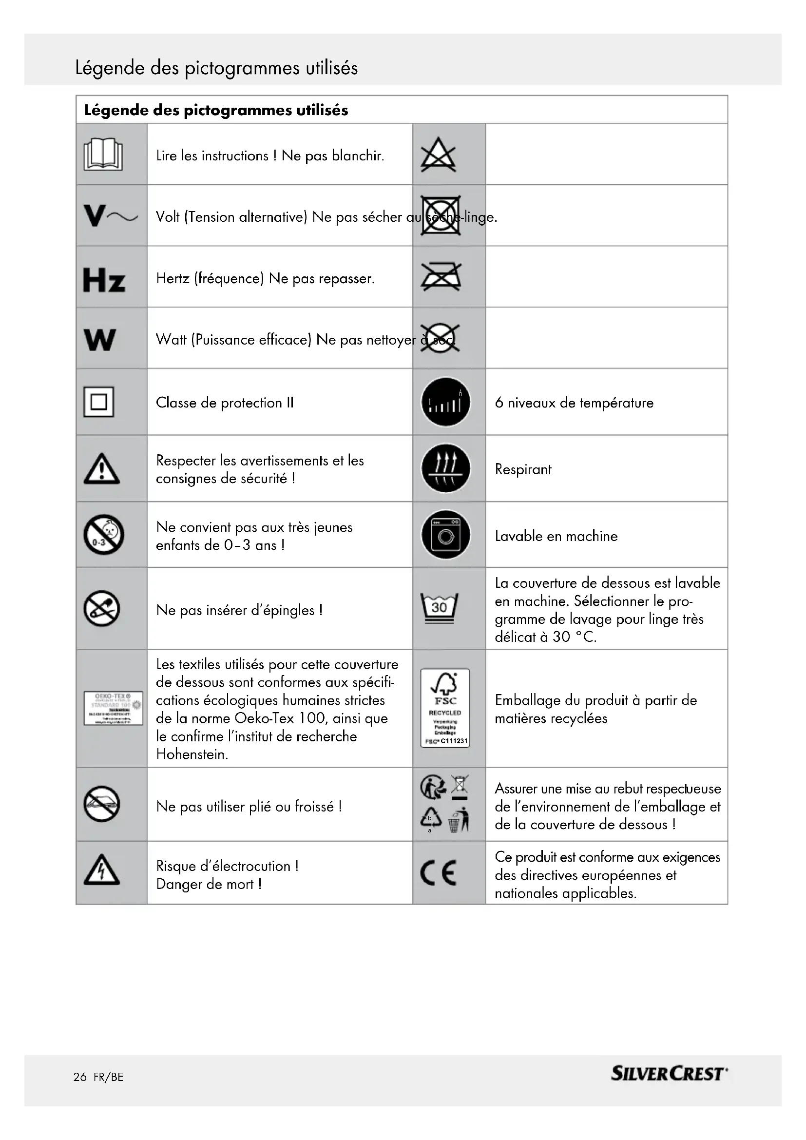AVERTISSEMENT! Le non-respect des consignes suivantes peut provoquer des dommages corporels ou matériels (électrocution, brûlure de peau, incendie). Les consignes de sécurité et d'avertissement suivantes seront non seulement à protéger votre santé ou celle de tiers, mais aussi à préserver la couverture de dessous. Par conséquent, veuillez respecter ces consignes et remettre ce mode d'emploi aux utilisateurs à qui vous prêtez cette couverture de dessous.