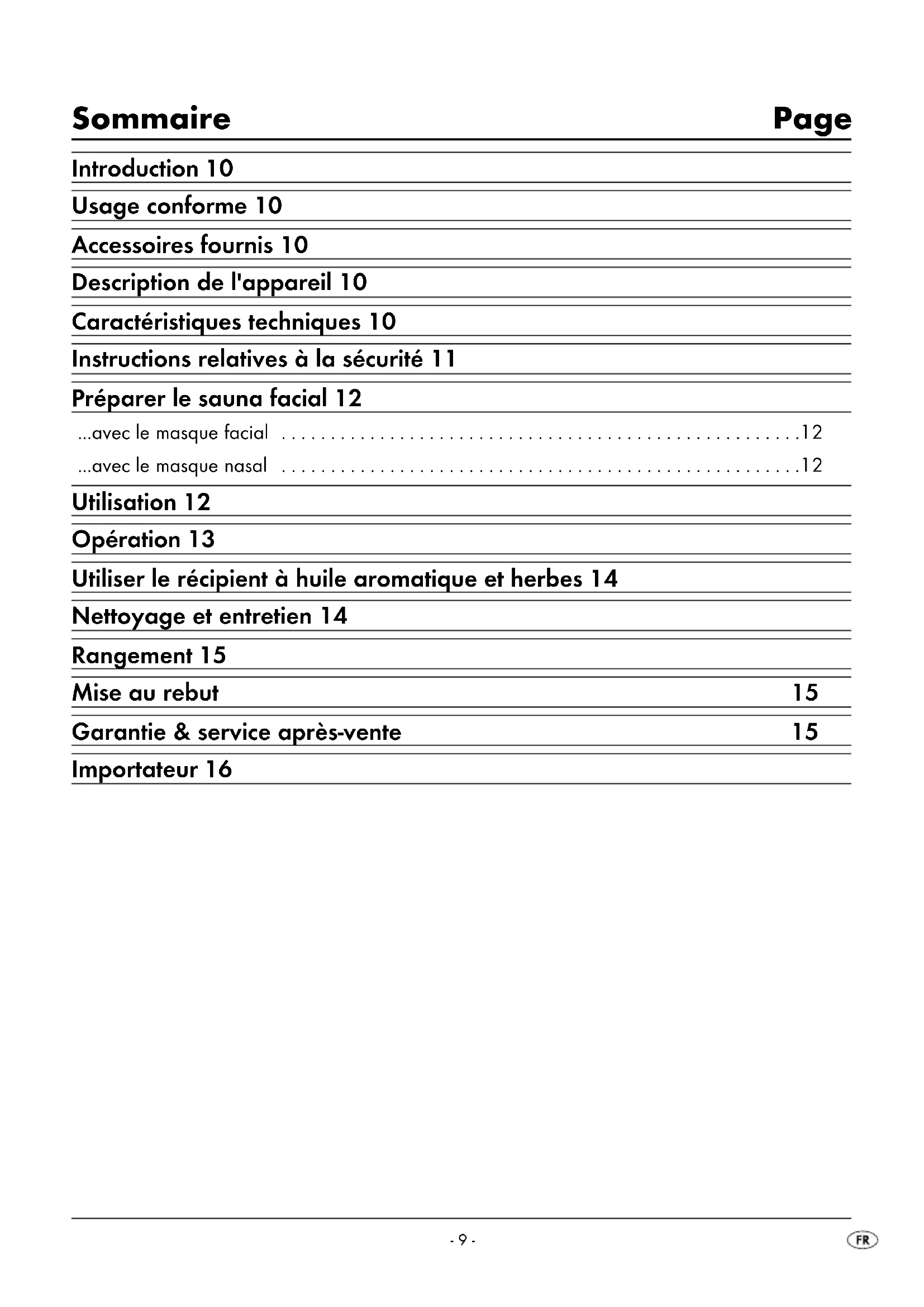 - avec le masque nasal Utilisation 12 Opération 13 Utiliser le récipient à huile aromatique et herbes 14 Nettoyage et entretien 14 Rangement 15 Mise au rebut 15 Garantie & service après-vente 15 Importateur 16 IB_100149_SGS80A2_CH 05.05.2014 10:35 Uhr Seite 9- 10 - Sauna facial Introduction Toutes nos félicitations pour l'achat de votre nouvel appareil. Vous avez choisi un produit de grande qualité. Le mode d'emploi fait partie de ce produit. Il contient des remarques importantes concernant la sécurité, l'utilisation et la mise au rebut. Veuillez vous familia- riser avec l'ensemble des consignes d'opération et de sécurité avant l'usage du produit. N'utilisez le produit que conformément aux consignes et pour les domaines d'utilisation prévus. En cas de transfert du produit à un tiers, remettez-lui également tous les documents. Usage conforme Le sauna facial est destiné aux soins de beauté du visage par la vapeur. L'appareil est prévu pour l'usage privé et n'est pas adapté à des fins commerciales ! Accessoires fournis Masque facial Masque nasal Régulateur de vapeur Unité de chauffage Verre mesureur Mode d'emploi Description de l'appareil Figure A : 1 Masque facial 2 Couvercle du réservoir à arômes et herbes aromatiques (s'adapte sur le réservoir à arômes et herbes aromatiques du masque facial et du masque nasal) 3 Récipient à huile aromatique et herbes 4 Régulateur de vapeur 5 Poignée du régulateur de vapeur 6 Coupe d'eau 7 Indicateur de contrôle 8 Touche Lo/Hi/Off 9 Unité de chauffage 0 Enroulement de câble q Partie inférieure du masque nasal w Réservoir à arômes et herbes aromatiques e Partie supérieure du masque nasal Figure B : r Godet de mesure Caractéristiques techniques Tension nominale : 220 - 240 V p. 12