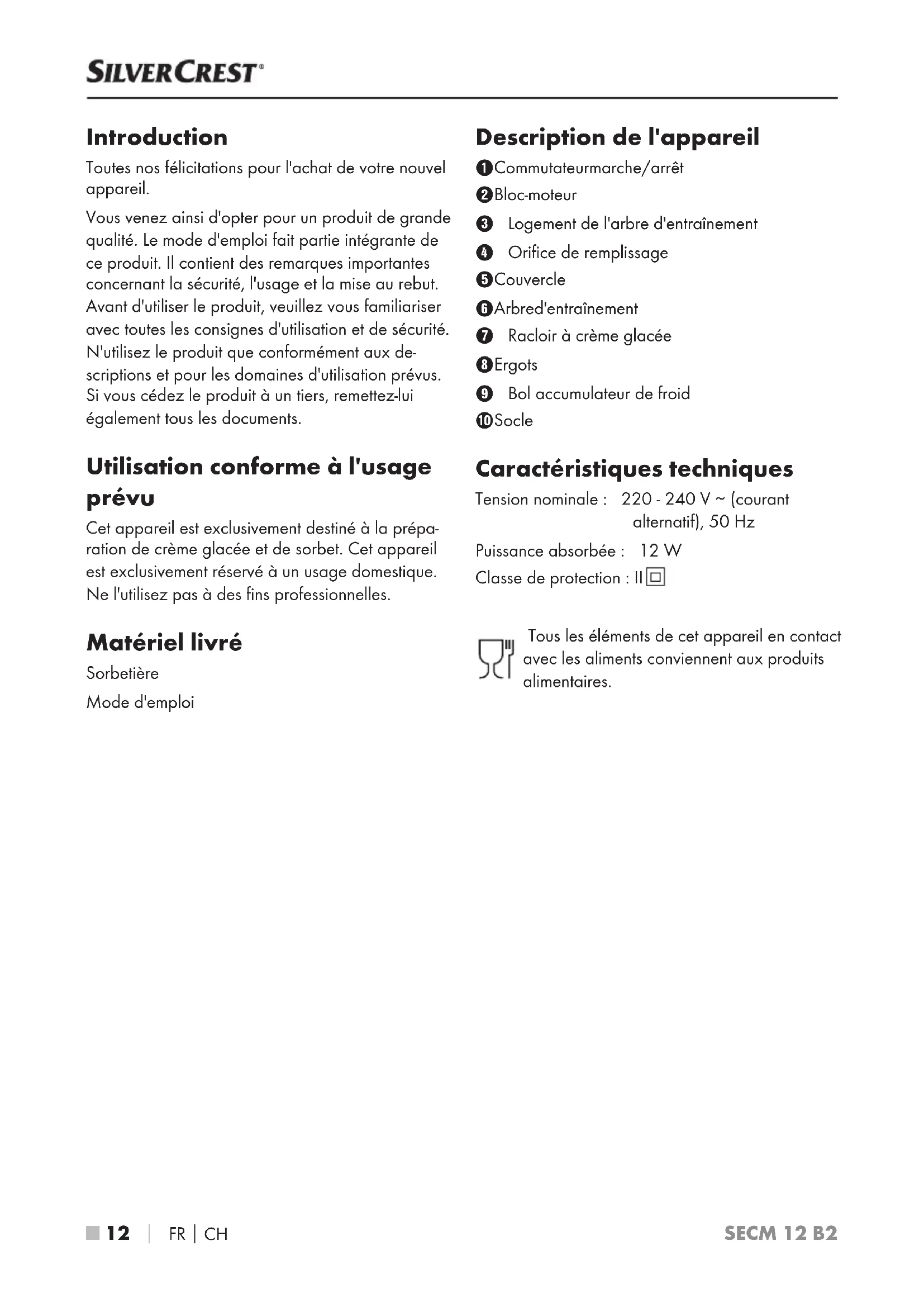 Introduction Toutes nos félicitations pour l'achat de votre nouvel appareil. Vous venez ainsi d'opter pour un produit de grande qualité. Le mode d'emploi fait partie intégrante de ce produit. Il contient des remarques importantes concernant la sécurité, l'usage et la mise au rebut. Avant d'utiliser le produit, veuillez vous familiariser avec toutes les consignes d'utilisation et de sécurité. N'utilisez le produit que conformément aux de- scriptions et pour les domaines d'utilisation prévus. Si vous cédez le produit à un tiers, remettez-lui également tous les documents. Utilisation conforme à l'usage prévu Cet appareil est exclusivement destiné à la prépa- ration de crème glacée et de sorbet. Cet appareil est exclusivement réservé à un usage domestique. Ne l'utilisez pas à des fins professionnelles. Matériel livré Sorbetière Mode d'emploi Description de l'appareil 1 Commutateur marche/arrêt 2 Bloc-moteur 3 Logement de l'arbre d'entraînement 4 Orifice de remplissage 5 Couvercle 6 Arbre d'entraînement 7 Racloir à crème glacée 8 Ergots 9 Bol accumulateur de froid 0 Socle Caractéristiques techniques Tension nominale: 220 - 240 V ∼ (courant alternatif), 50Hz Puissance absorbée: 12 W Classe de protection: II Tous les éléments de cet appareil en contact avec les aliments conviennent aux produits alimentaires. IB_290154_SECM12B2_LB1.indb 12 08.11.17 16:24SECM 12 B2