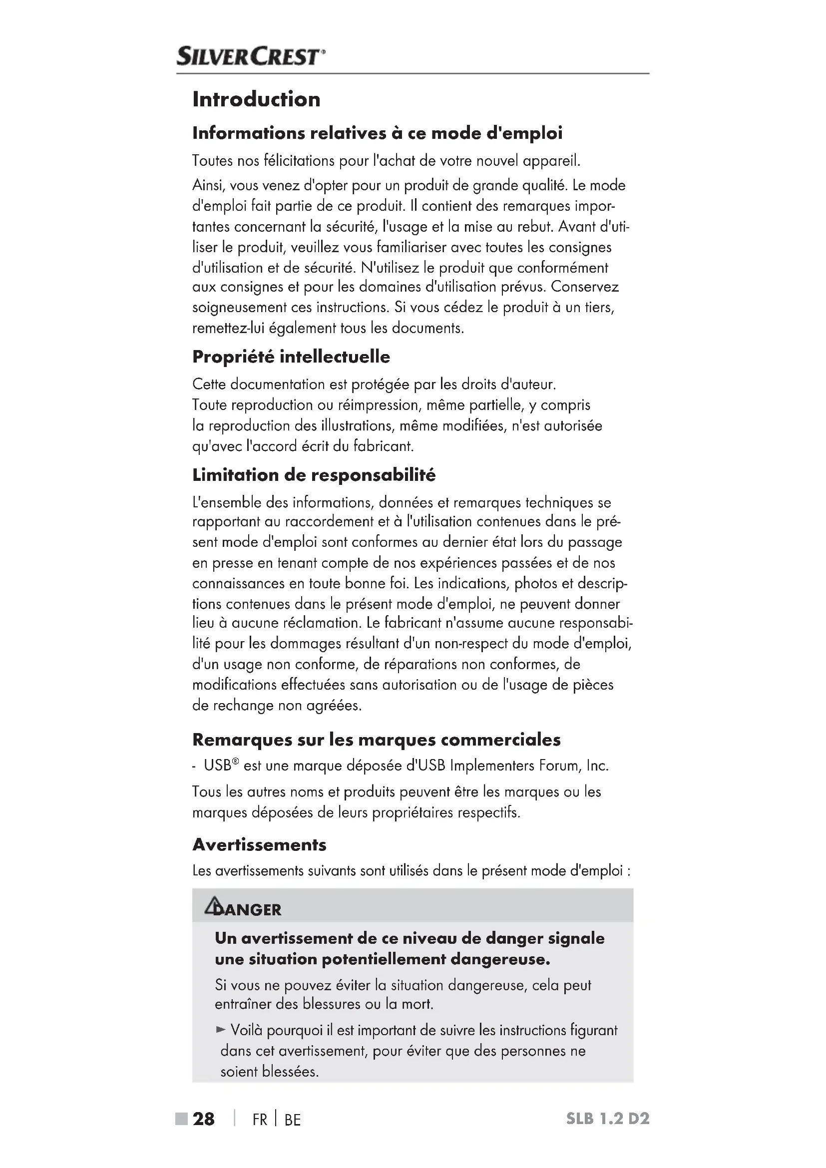 SLB 1.2 D2 Introduction Informations relatives à ce mode d'emploi Toutes nos félicitations pour l'achat de votre nouvel appareil. Ainsi, vous venez d'opter pour un produit de grande qualité. Le mode d'emploi fait partie de ce produit. Il contient des remarques impor- tantes concernant la sécurité, l'usage et la mise au rebut. Avant d'uti- liser le produit, veuillez vous familiariser avec toutes les consignes d'utilisation et de sécurité. N'utilisez le produit que conformément aux consignes et pour les domaines d'utilisation prévus. Conservez soigneusement ces instructions. Si vous cédez le produit à un tiers, remettez-lui également tous les documents. Propriété intellectuelle Cette documentation est protégée par les droits d'auteur. Toute reproduction ou réimpression, même partielle, y compris la reproduction des illustrations, même modifiées, n'est autorisée qu'avec l'accord écrit du fabricant. Limitation de responsabilité L'ensemble des informations, données et remarques techniques se rapportant au raccordement et à l'utilisation contenues dans le pré- sent mode d'emploi sont conformes au dernier état lors du passage en presse en tenant compte de nos expériences passées et de nos connaissances en toute bonne foi. Les indications, photos et descrip- tions contenues dans le présent mode d'emploi, ne peuvent donner lieu à aucune réclamation. Le fabricant n'assume aucune responsabi- lité pour les dommages résultant d'un non-respect du mode d'emploi, d'un usage non conforme, de réparations non conformes, de modifications effectuées sans autorisation ou de l'usage de pièces de rechange non agréées. Remarques sur les marques commerciales - USB est une marque déposée d'USB Implementers Forum, Inc. Tous les autres noms et produits peuvent être les marques ou les marques déposées de leurs propriétaires respectifs. Avertissements Les avertissements suivants sont utilisés dans le présent mode d'emploi : DANGER Un avertissement de ce niveau de danger signale une situation potentiellement dangereuse. Si vous ne pouvez éviter la situation dangereuse, cela peut entraîner des blessures ou la mort. ► Voilà pourquoi il est important de suivre les instructions figurant dans cet avertissement, pour éviter que des personnes ne soient blessées.FR