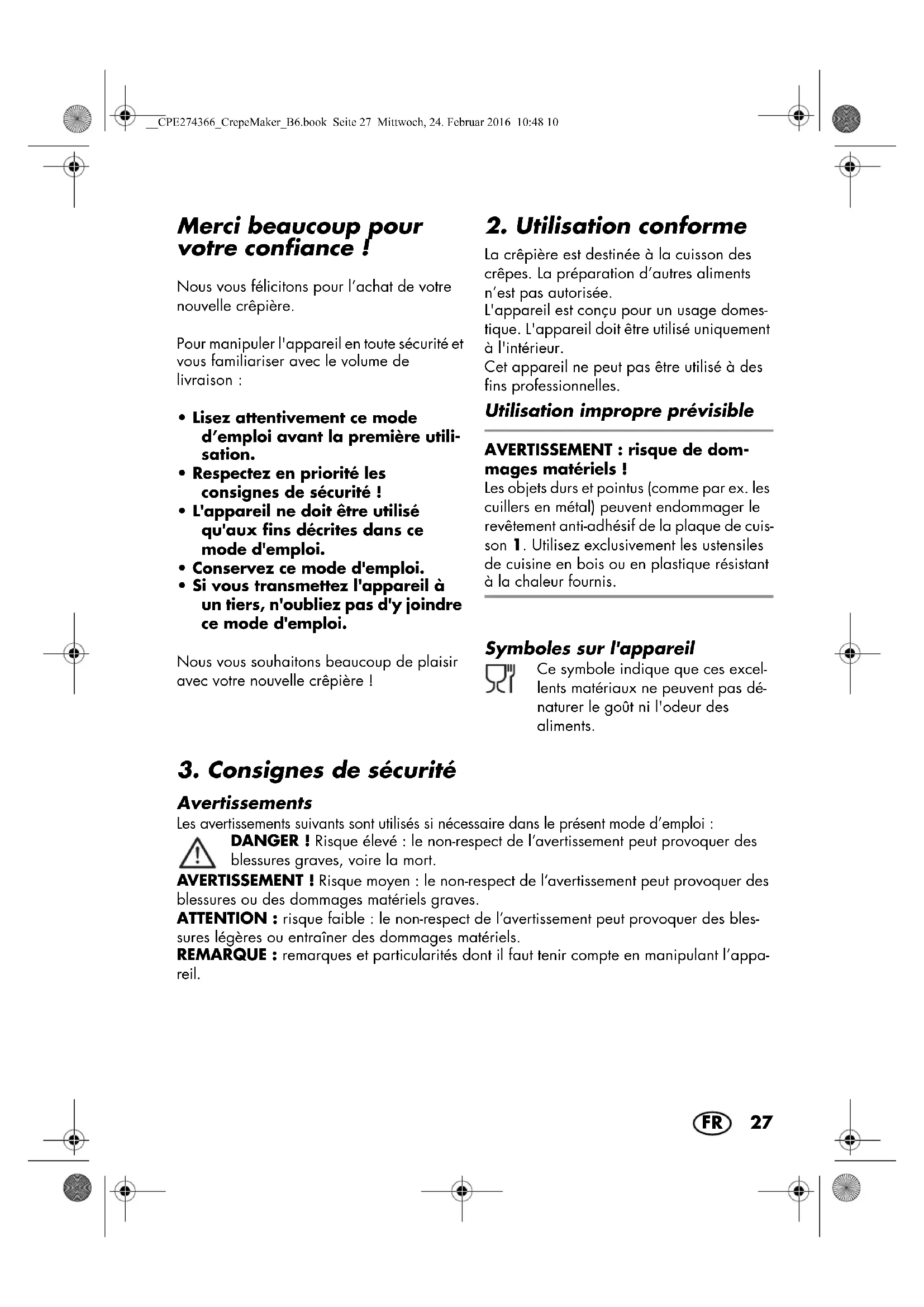 Merci beaucoup pour votre confiance ! Nous vous félicitons pour l’achat de votre nouvelle crêpière. Pour manipuler l'appareil en toute sécurité et vous familiariser avec le volume de livraison :