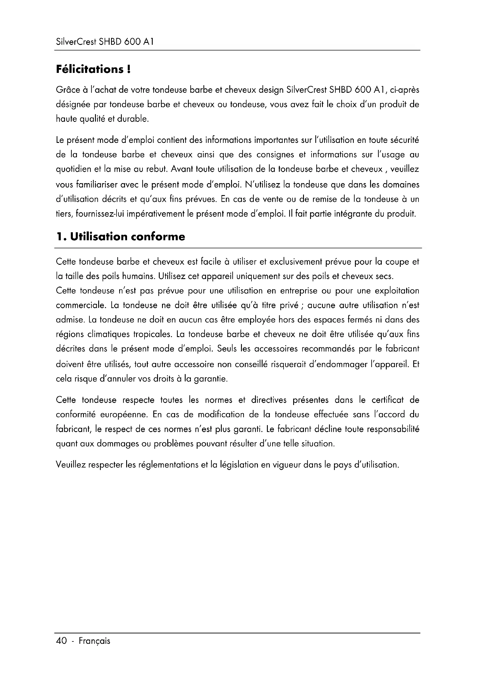 Félicitations ! Grâce à l’achat de votre tondeuse barbe et cheveux design SilverCrest SHBD 600 A1, ci-après désignée par tondeuse barbe et cheveux ou tondeuse, vous avez fait le choix d’un produit de haute qualité et durable. Le présent mode d’emploi contient des informations importantes sur l’utilisation en toute sécurité de la tondeuse barbe et cheveux ainsi que des consignes et informations sur l’usage au quotidien et la mise au rebut. Avant toute utilisation de la tondeuse barbe et cheveux , veuillez vous familiariser avec le présent mode d’emploi. N’utilisez la tondeuse que dans les domaines d’utilisation décrits et qu’aux fins prévues. En cas de vente ou de remise de la tondeuse à un tiers, fournissez-lui impérativement le présent mode d’emploi. Il fait partie intégrante du produit.