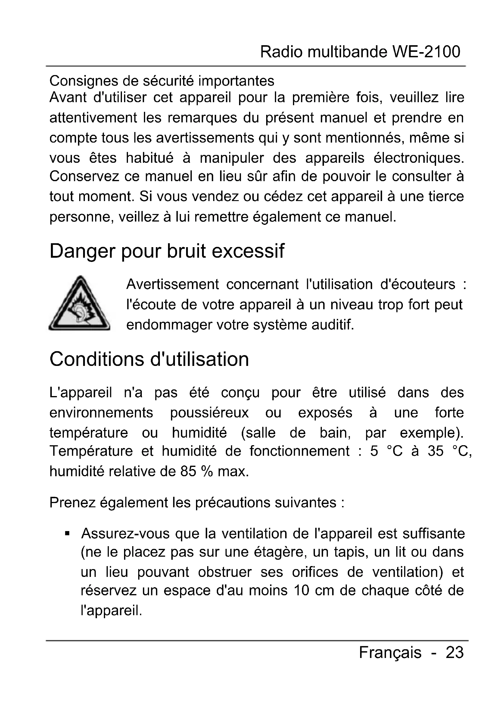 - Détails de la garantie Radio multibande WE-2100 Français - 23 Consignes de sécurité importantes Avant d'utiliser cet appareil pour la première fois, veuillez lire attentivement les remarques du présent manuel et prendre en compte tous les avertissements qui y sont mentionnés, même si vous êtes habitué à manipuler des appareils électroniques. Conservez ce manuel en lieu sûr afin de pouvoir le consulter à tout moment. Si vous vendez ou cédez cet appareil à une tierce personne, veillez à lui remettre également ce manuel. Danger pour bruit excessif Avertissement concernant l'utilisation d'écouteurs : l'écoute de votre appareil à un niveau trop fort peut endommager votre système auditif. Conditions d'utilisation L'appareil n'a pas été conçu pour être utilisé dans des environnements poussiéreux ou exposés à une forte température ou humidité (salle de bain, par exemple). Température et humidité de fonctionnement : 5 °C à 35 °C, humidité relative de 85 % max. Prenez également les précautions suivantes : Assurez-vous que la ventilation de l'appareil est suffisante (ne le placez pas sur une étagère, un tapis, un lit ou dans un lieu pouvant obstruer ses orifices de ventilation) et réservez un espace d'au moins 10 cm de chaque côté de l'appareil.Radio multibande WE-2100 p. 39
