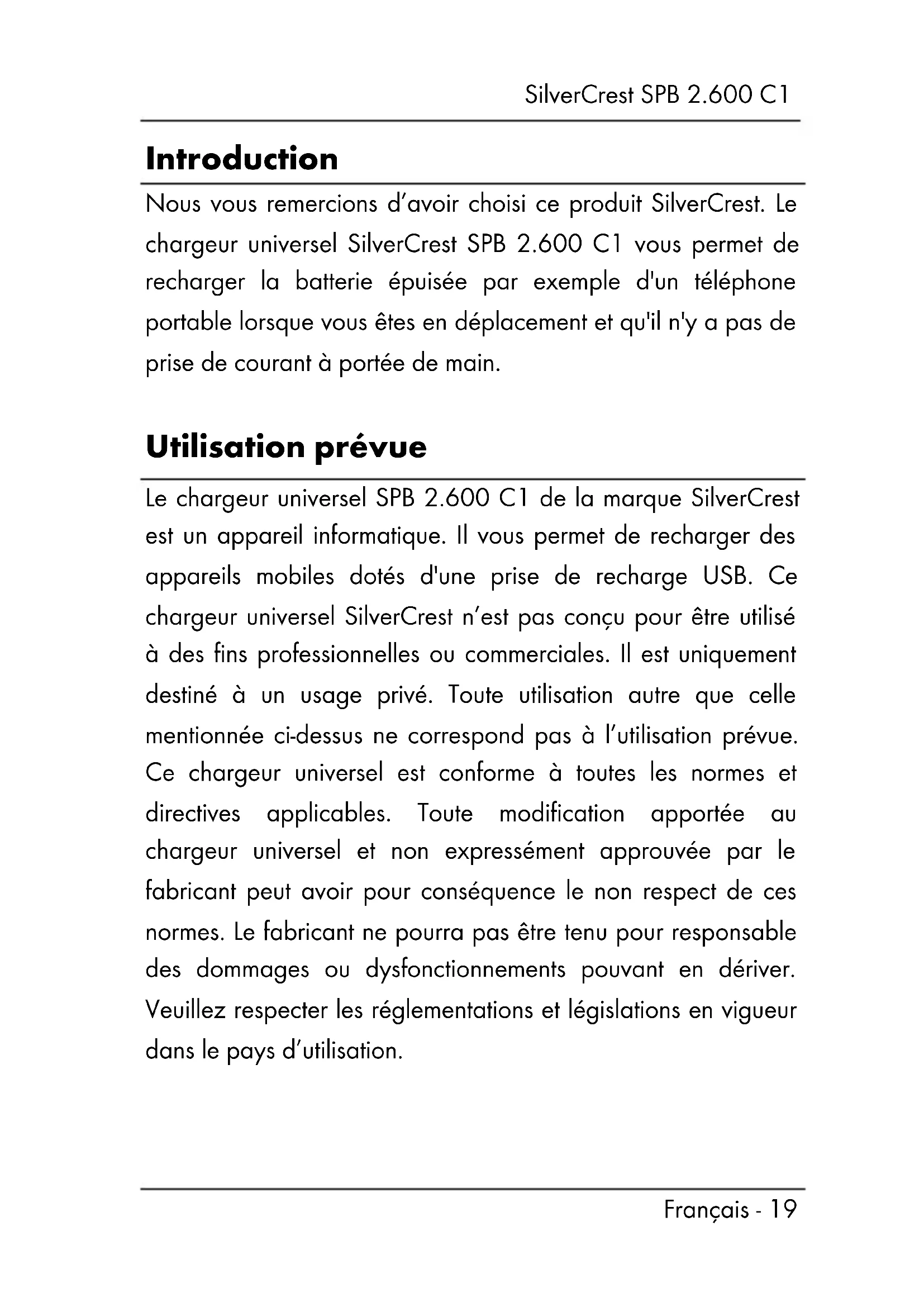 SilverCrest SPB 2.600 C1 Français - 19 Introduction Nous vous remercions d’avoir choisi ce produit SilverCrest. Le chargeur universel SilverCrest SPB 2.600 C1 vous permet de recharger la batterie épuisée par exemple d'un téléphone portable lorsque vous êtes en déplacement et qu'il n'y a pas de prise de courant à portée de main. Utilisation prévue Le chargeur universel SPB 2.600 C1 de la marque SilverCrest est un appareil informatique. Il vous permet de recharger des appareils mobiles dotés d'une prise de recharge USB. Ce chargeur universel SilverCrest n’est pas conçu pour être utilisé à des fins professionnelles ou commerciales. Il est uniquement destiné à un usage privé. Toute utilisation autre que celle mentionnée ci-dessus ne correspond pas à l’utilisation prévue. Ce chargeur universel est conforme à toutes les normes et directives applicables. Toute modification apportée au chargeur universel et non expressément approuvée par le fabricant peut avoir pour conséquence le non respect de ces normes. Le fabricant ne pourra pas être tenu pour responsable des dommages ou dysfonctionnements pouvant en dériver. Veuillez respecter les réglementations et législations en vigueur dans le pays d’utilisation.SilverCrest SPB 2.600 C1