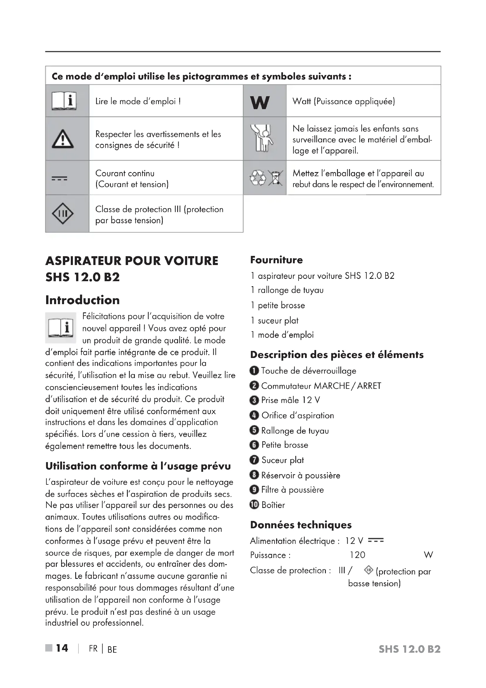 SHS 12.0 B2 Introduction Félicitations pour l‘acquisition de votre nouvel appareil ! Vous avez opté pour un produit de grande qualité. Le mode d‘emploi fait partie intégrante de ce produit. Il contient des indications importantes pour la sécurité, l’utilisation et la mise au rebut. Veuillez lire consciencieusement toutes les indications d‘utilisation et de sécurité du produit. Ce produit doit uniquement être utilisé conformément aux instructions et dans les domaines d‘application spécifiés. Lors d‘une cession à tiers, veuillez également remettre tous les documents. Utilisation conforme à l‘usage prévu L’aspirateur de voiture est conçu pour le nettoyage de surfaces sèches et l’aspiration de produits secs. Ne pas utiliser l’appareil sur des personnes ou des animaux. Toutes utilisations autres ou modifica- tions de l’appareil sont considérées comme non conformes à l’usage prévu et peuvent être la source de risques, par exemple de danger de mort par blessures et accidents, ou entraîner des dom- mages. Le fabricant n’assume aucune garantie ni responsabilité pour tous dommages résultant d’une utilisation de l’appareil non conforme à l’usage prévu. Le produit n’est pas destiné à un usage industriel ou professionnel. Fourniture 1 aspirateur pour voiture SHS 12.0 B2 1 rallonge de tuyau 1 petite brosse 1 suceur plat 1 mode d’emploi Description des pièces et éléments Touche de déverrouillage Commutateur MARCHE / ARRET Prise mâle 12 V Orifice d‘aspiration Rallonge de tuyau Petite brosse Suceur plat Réservoir à poussière Filtre à poussière Boîtier Données techniques Alimentation électrique: 12 V Puissance: 120 W Classe de protection : III / (protection par basse tension) Ce mode d‘emploi utilise les pictogrammes et symboles suivants : Lire le mode d‘emploi !