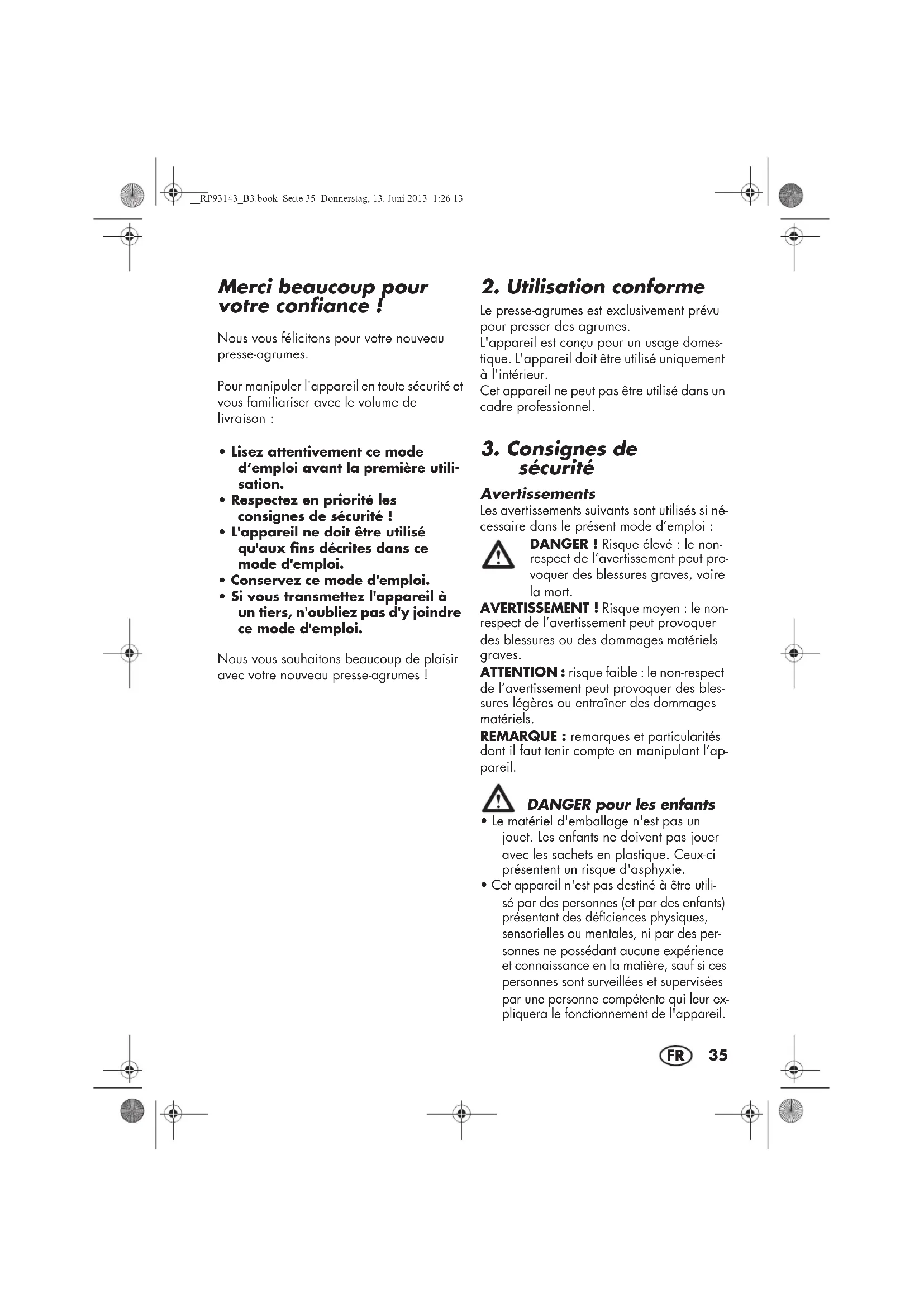 - Cet appareil n'est pas destiné à être utili- sé par des personnes (et par des enfants) présentant des déficiences physiques, sensorielles ou mentales, ni par des per- sonnes ne possédant aucune expérience et connaissance en la matière, sauf si ces personnes sont surveillées et supervisées par une personne compétente qui leur ex- pliquera le fonctionnement de l'appareil. __RP93143_B3.book Seite 35 Donnerstag, 13. Juni 2013 1:26 1336