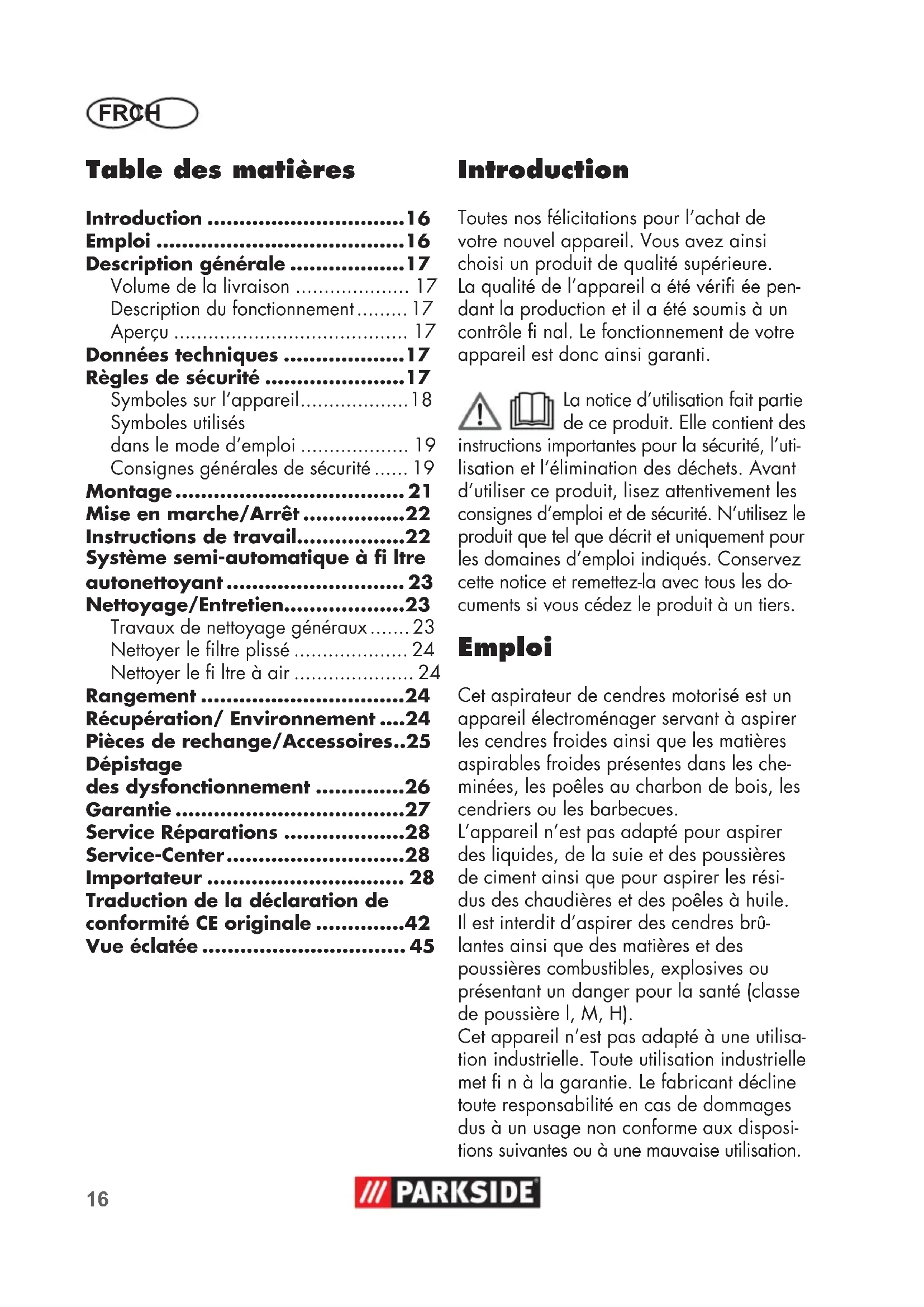 - Introduction Toutes nos félicitations pour l’achat de votre nouvel appareil. Vous avez ainsi choisi un produit de qualité supérieure. Laqualitédel’appareilaétévériéepen- dantlaproductionetilaétésoumisàun contrôlenal.Lefonctionnementdevotre appareil est donc ainsi garanti. La notice d’utilisation fait partie de ce produit. Elle contient des instructions importantes pour la sécurité, l’uti- lisation et l’élimination des déchets. Avant d’utiliser ce produit, lisez attentivement les consignes d’emploi et de sécurité. N’utilisez le produit que tel que décrit et uniquement pour les domaines d’emploi indiqués. Conservez cette notice et remettez-la avec tous les do- cumentssivouscédezleproduitàuntiers. Emploi Cet aspirateur de cendres motorisé est un appareilélectroménagerservantàaspirer les cendres froides ainsi que les matières aspirables froides présentes dans les che- minées, les poêles au charbon de bois, les cendriers ou les barbecues. L’appareil n’est pas adapté pour aspirer des liquides, de la suie et des poussières de ciment ainsi que pour aspirer les rési- dusdeschaudièresetdespoêlesàhuile. Il est interdit d’aspirer des cendres brû- lantes ainsi que des matières et des poussières combustibles, explosives ou présentant un danger pour la santé (classe de poussière l, M, H). Cetappareiln’estpasadaptéàuneutilisa- tion industrielle. Toute utilisation industrielle metnàlagarantie.Lefabricantdécline toute responsabilité en cas de dommages dusàunusagenonconformeauxdisposi- tionssuivantesouàunemauvaiseutilisation. Traduction de la déclaration de conformité CE originale p. 42