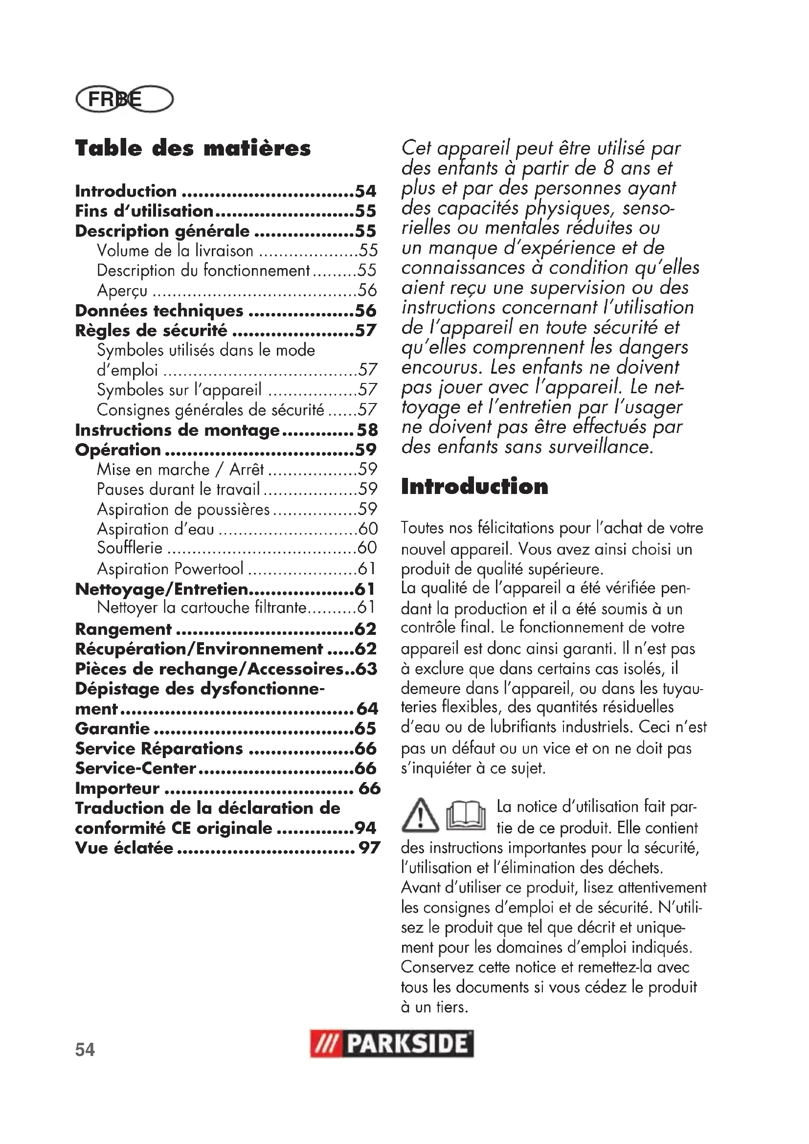 - Produkt evidovaný ako poškodený mô- žete po dohode s našim zákazníckym servisom, s priloženým dokladom o za- kúpení (pokladničný doklad) a s údaj-53 mi, v čom chyba spočíva a kedy vznik- la, zaslať bez poštovného na adresu servisu, ktorá vám bude oznámená. Pre zabránenie dodatočných nákladov a problémov pri prevzatí použite len tú adresu, ktorá vám bude oznámená. Nezasielajte prístroj ako nadmerný tovar na náklady príjemcu, expresne alebo s iným špeciálnym nákladom. Prístroj zašlite so všetkými časťami príslušenstva dodanými pri zakúpení a zabezpečte dostatočne bezpečné prepravné balenie. Servisná oprava Opravy,ktorénepodliehajúzáruke, mô- žeme nechať vykonať v našej servisnej pobočke za úhradu. Radi vám poskytneme predbežnú kalkuláciu nákladov. Môžeme spracovať len prístroje, ktoré boli doručené dostatočne zabalené a so zapla- teným poštovným. Pozor: Prístroj zašlite do našej servisnej po- bočky vyčistený a s informáciami o chybe. Neprevezmeme prístroje zaslané ako nad- merný tovar na náklady príjemcu, expres- ne alebo s iným špeciálnym nákladom. Likvidáciu vašich poškodených zaslaných prístrojov vykonáme bezplatne. Service-Center Servis Slovensko Tel.: 0850 232001 E-Mail: grizzly@lidl.sk IAN 97734 Dovozca Nasledujúca adresa nie je adresa servisu. Najskôr kontaktujte hore uvedené servisné centrum. Grizzly Gartengeräte GmbH & CO KG Am Gewerbepark 2 64823 Groß-Umstadt Nemecko www.grizzly-service.eu54 FR BE Table des matières Introduction ...............................54 Fins d‘utilisation .........................55 Description générale ..................55 Volume de la livraison ....................55 Description du fonctionnement .........55 Aperçu .........................................56 Données techniques ...................56 Règles de sécurité ......................57 Symboles utilisés dans le mode d’emploi .......................................57 Symboles sur l‘appareil ..................57 Consignes générales de sécurité ......57 Instructions de montage ............. 58 Opération ..................................59 Mise en marche / Arrêt ..................59 Pauses durant le travail ...................59 Aspiration de poussières .................59 Aspiration d’eau ............................60 Souferie ......................................60 Aspiration Powertool ......................61 Nettoyage/Entretien...................61 Nettoyer la cartouche ltrante ..........61 Rangement ................................62 Récupération/Environnement .....62 Pièces de rechange/Accessoires ..63 Dépistage des dysfonctionne- ment .......................................... 64 Garantie ....................................65 Service Réparations ...................66 Service-Center ............................66 Importeur .................................. 66 Traduction de la déclaration de conformité CE originale ..............94 Vue éclatée ................................ 97 Cet appareil peut être utilisé par des enfants à partir de 8 ans et plus et par des personnes ayant des capacités physiques, senso- rielles ou mentales réduites ou un manque d’expérience et de connaissances à condition qu’elles aient reçu une supervision ou des instructions concernant I’utilisation de I’appareil en toute sécurité et qu’elles comprennent les dangers encourus. Les enfants ne doivent pas jouer avec l’appareil. Le net- toyage et I’entretien par I’usager ne doivent pas être effectués par des enfants sans surveillance. Introduction Toutes nos félicitations pour l’achat de votre nouvel appareil. Vous avez ainsi choisi un produit de qualité supérieure. La qualité de l’appareil a été vériée pen- dant la production et il a été soumis à un contrôle nal. Le fonctionnement de votre appareil est donc ainsi garanti. Il n’est pas à exclure que dans certains cas isolés, il demeure dans l’appareil, ou dans les tuyau- teries exibles, des quantités résiduelles d’eau ou de lubriants industriels. Ceci n’est pas un défaut ou un vice et on ne doit pas s’inquiéter à ce sujet. La notice d’utilisation fait par- tie de ce produit. Elle contient des instructions importantes pour la sécurité, l’utilisation et l’élimination des déchets. Avant d’utiliser ce produit, lisez attentivement les consignes d’emploi et de sécurité. N’utili- sez le produit que tel que décrit et unique- ment pour les domaines d’emploi indiqués. Conservez cette notice et remettez-la avec tous les documents si vous cédez le produit à un tiers.55 FR BE Fins d‘utilisation L‘appareil est destiné à l‘aspiration de pous- sière et de liquides à des ns ménagères, p. ex. pour la maison, l‘atelier de bricolage, dans la voiture ou le garage. L’appareil peut également être utilisé en guise de souferie ou pour aspirer de l’eau. Cet appareil n’est pas adapté à une utilisa- tion industrielle. Toute utilisation industrielle met n à la garantie. Il est interdit d’aspirer des substances combustibles, explosives ou dangereuses pour la santé. Le fabricant décline toute responsabilité en cas de dommages dus à un usage non conforme aux dispositions sui- vantes ou à une mauvaise utilisation. Description générale Vous trouverez le dessin détaillé des organes de service les plus importants sur les pages dépliantes avant et arrière. Volume de la livraison Déballez l’appareil et vériez que la livrai- son est complète : L’appareil est livré avec la tête de moteur montée ( 3). Pour retirer la tête de mo- teur, ouvrez les clips de fermeture ( 4). Evacuez le matériel d’emballage comme il se doit. 3 Compartiment du moteur 5 Collecteur 6a 2 pieds avec roues 6b 2 pieds avec roulettes 11 Filtre pliable 11a) et couvercle du ltre (11b) (déjà monté) 12 Sac à poussière en papier 13 Filtre en mousse 14 Sac 