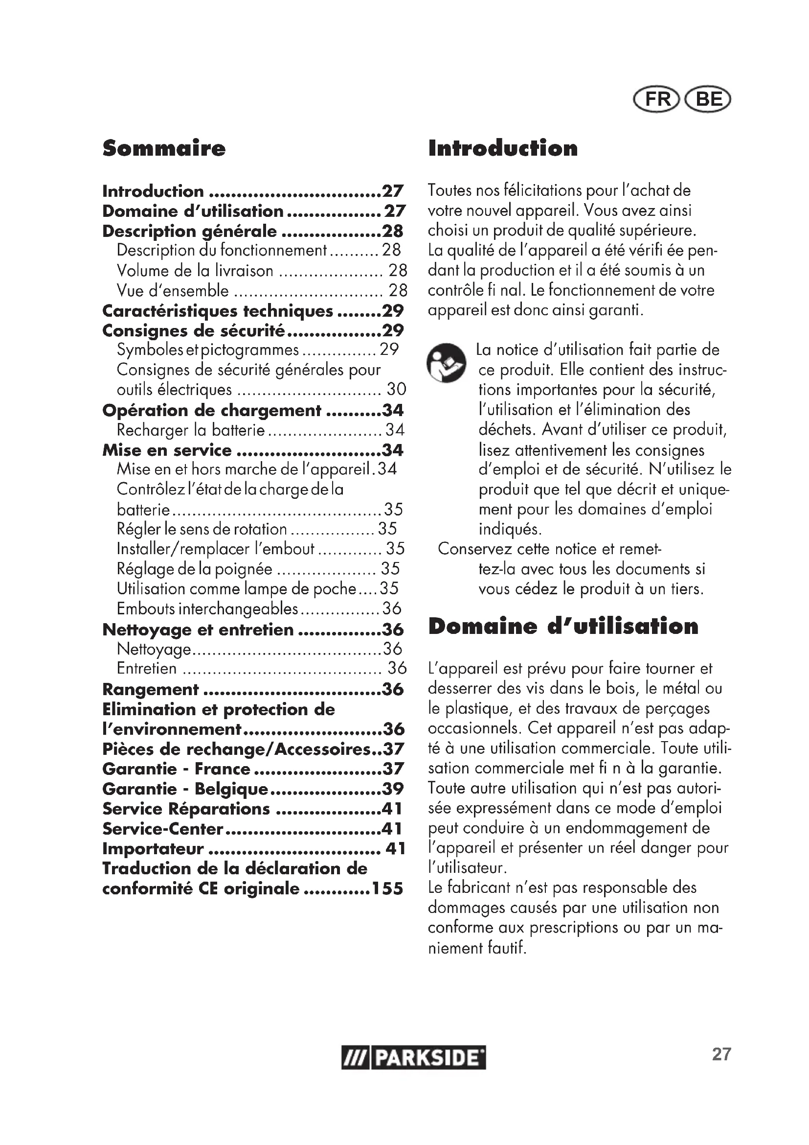 - Introduction Toutes nos félicitations pour l’achat de votre nouvel appareil. Vous avez ainsi choisi un produit de qualité supérieure. La qualité de l’appareil a été véri ée pen- dant la production et il a été soumis à un contrôle nal. Le fonctionnement de votre appareil est donc ainsi garanti. La notice d’utilisation fait partie de ce produit. Elle contient des instruc- tions importantes pour la sécurité, l’utilisation et l’élimination des déchets. Avant d’utiliser ce produit, lisez attentivement les consignes d’emploi et de sécurité. N’utilisez le produit que tel que décrit et unique- ment pour les domaines d’emploi indiqués. Conservez cette notice et remet- tez-la avec tous les documents si vous cédez le produit à un tiers. Domaine d’utilisation L’appareil est prévu pour faire tourner et desserrer des vis dans le bois, le métal ou le plastique, et des travaux de perçages occasionnels. Cet appareil n’est pas adap- té à une utilisation commerciale. Toute utili- sation commerciale met n à la garantie. Toute autre utilisation qui n’est pas autori- sée expressément dans ce mode d’emploi peut conduire à un endommagement de l’appareil et présenter un réel danger pour l’utilisateur. Le fabricant n’est pas responsable des dommages causés par une utilisation non conforme aux prescriptions ou par un ma- niement fautif. Traduction de la déclaration de conformité CE originale 8 FR BE Description générale Vous trouverez les illustra- tions sur la page de rabat avant. Description du fonctionnement Le tournevis articulé sans l est doté d’une rotation à droite et à gauche. L’appareil peut également être utilisé en tant que lampe de poche. Pour la fonction des pièces de service, veuillez vous reporter aux descriptions suivantes. Volume de la livraison Déballez l’appareil et véri ez que la li- vraison est complète. Evacuez le matériel d’emballage comme il se doit. - Visseuse sans l - Câble de charge USB-C - 26 embouts - 1 Porte embouts - Coffre - Notice d’utilisation 26 embouts: Fente N°N°N°N°N°N°N° Crois Crois Torx Hexagonal p. 1552