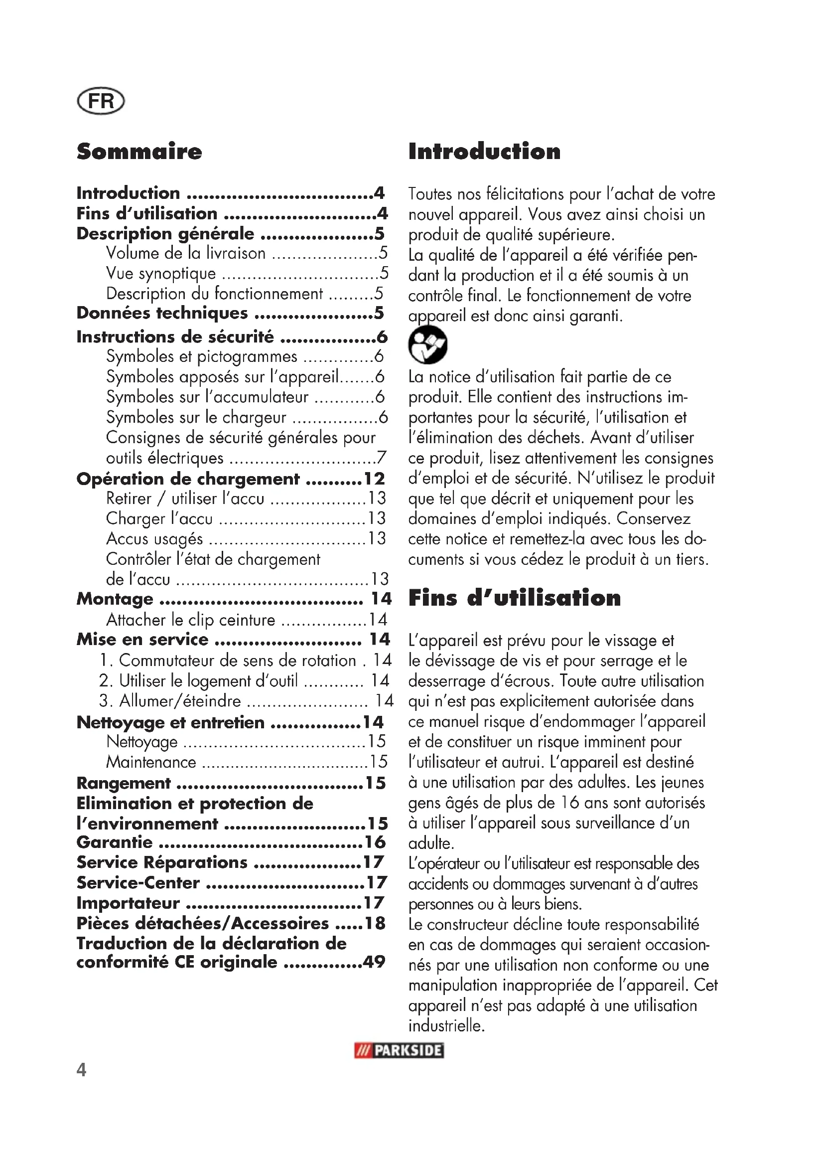 - Fins d‘utilisation p. 4