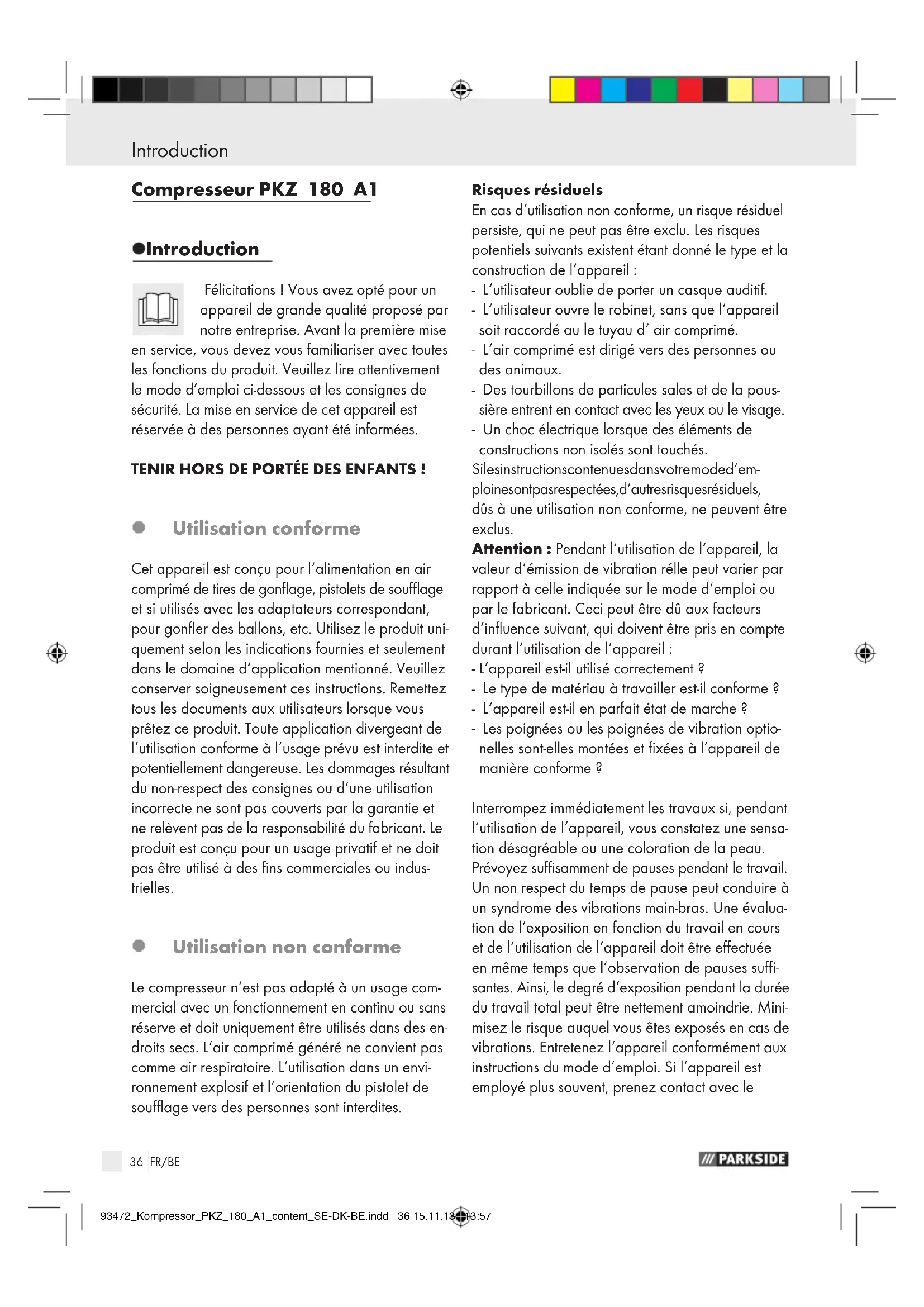 Kontakt først den ovenstående serviceafdeling. Adresse: C. M. C. GmbH Katharina-Loth-Str. 15 66386 St. Ingbert Tyskland EG-konformitetserklæring Vi, virksomheden C. M. C. GmbH Dokumentansvarlig: Markus Zimmer Katharina-Loth-Str. 15 66386 St. Ingbert erklærer på eget ansvar, at produktet Kompressor Serienummer: 1672 Produktionsår: 2014 / 13 IAN: 93472 Model: PKZ 180 A1 opfylder de væsentlige sikkerhedskrav, som er fastlagt i EU-direktiverne EG-maskinretningslinje 2006 / 42 / EF EF-direktiv Elektromagnetisk kompatibili- tet 2004 / 108 / EF RoHS retningslinje 2011 / 65 / EF Printerretningslinje 97 / 23 / EF Outdoor-retningslinje 2000 / 14 / EG_2005 / 88 / EG og de senere vedtagne ændringer. Følgende har- moniserede normer blev taget i betragtning i forbin- delse med evalueringen af konformitetserklæringen: EN 1012-1 EN 60204-1 EN 55014-1 EN 55014-2 EN 61000-3-2 EN 61000-3-3 St. Ingbert, 30. November 2013 Karl Peter Uhle - Direktør - 93472_Kompressor_PKZ_180_A1_content_SE-DK-BE.indd 33 15.11.13 13:5734 Table des matières 93472_Kompressor_PKZ_180_A1_content_SE-DK-BE.indd 34 15.11.13 13:5735 FR/BE Introduction Utilisation conforme ............................................................................................................................Page 36 Utilisation non conforme ..................................................................................................................... Page 36 Équipement .......................................................................................................................................... Page 37 Caractéristiques techniques ................................................................................................................Page 37 Consignes de sécurité générales pour les outils à air comprimé .....Page 37 Consignes générales de sécurité concernant les appareils électriques Instructions de sécurité spécifiques au produit .................................................................................. Page 40 Avant la mise en service .....................................................................................................Page 40 Mise en service Allumer / éteindre le compresseur ......................................................................................................Page 41 Procéder aux raccordements .............................................................................................................Page 41 Utiliser le tire de gonflage ..................................................................................................................Page 41 Utiliser le pistolet de soufflage ...........................................................................................................Page 41 Utiliser l‘équipement d‘adaptateurs ................................................................................................... Page 41 Nettoyage et entretien ........................................................................................................ Page 41 Pièces de rechange .................................................................................................................Page 42 Maintenance et service........................................................................................................Page 42 Remarques sur la garantie et le service après-vente Conditions de garantie .......................................................................................................................Page 42 Étendue de la garantie .......................................................................................................................Page 43 Faire valoir sa garantie .......................................................................................................................Page 43 Indications relatives à l‘environnement et à la mise au rebut ..........Page 43 Déclaration de conformité CE ......................................................................................... Page 44 Table des matières 93472_Kompressor_PKZ_180_A1_content_SE-DK-BE.indd 35 15.11.13 13:5736 FR/BE Introduction / Consignes de sécurité générales pour les outils à air comprimé Introduction Compresseur PKZ 180 A1 Introduction Félicitations ! Vous avez opté pour un appareil de grande qualité proposé par notre entreprise. Avant la première mise en service, vous devez vous familiariser avec toutes les fonctions du produit. Veuillez lire attentivement le mode d’emploi ci-dessous et les consignes de sécurité. La mise en service de cet appareil est réservée à des personnes ayant été informées. TENIR HORS DE PORTÉE DES ENFANTS! Utilisation conforme Cet appareil est conçu pour l‘alimentation en air comprimé de tires de gonflage, pistolets de soufflage et si utilisés avec les adaptateurs correspondant, pour gonfler des ballons, etc. Utilisez le produit uni- quement selon les indications fournies et seulement dans le domaine d‘application mentionné. Veuillez conserver soigneusement ces instructions. Remettez tous les documents aux utilisateurs lorsque vous prêtez ce produit. Toute application divergeant de l‘utilisation conforme à l‘usage prévu est interdite et potentiellement dangereuse. Les dommages résultant du non-respect des consignes ou d‘une utilisation incorrecte ne sont pas couverts par la garantie et ne relèvent pas de la responsabilité du fabricant. Le produit est conçu pour un usage privatif et ne doit pas être utilisé à des fins commerciales ou indus- trielles. Utilisation non conforme Le compresseur n‘est pas adapté à un usage com- mercial avec un fonctionnement en continu ou sans réserve et doit uniquement être utilisés dans des en- droits secs. L‘air comprimé généré ne convient pas comme air respiratoire. L‘utilisation dans un envi- ronnement explosif et l‘orientation du pistolet de soufflage vers des personnes sont interdites. Risques ré