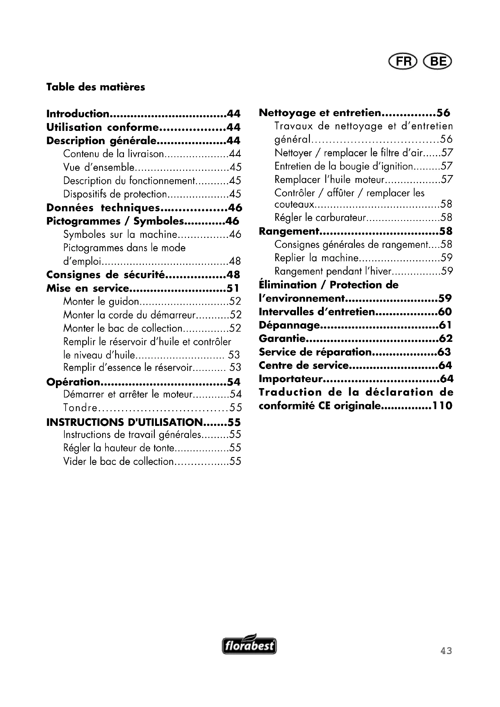 - … 4 BEFR Introduction Félicitations pour l’achat de votre nouvelle tondeuse à gazon. Vous avez acquis une machine de haute qualité. Au cours de sa fabrication, votre machine a été soumise à des contrôles de qualité et des tests finaux, afin de garantir sa fonctionnalité. Le mode d’emploi fait partie intégrale du produit. Il contient des informations importantes concernant la sécurité, l’utilisation et l’élimination du produit. Veuillez lire attentivement ce mode d’emploi et le mode d'emploi de Briggs & Stratton avant la première mise en service, afin d’éviter des manipulations erronées. N’utilisez le produit que selon les instructions et uniquement pour les fins prévues. Conservez précieusement les modes d’emploi et remettez-les à chaque utilisateur ultérieur. Utilisation conforme La machine est conçue exclusivement pour la tonte de pelouses du domaine privé. Il ne convient pas à l’exploitation commerciale. En cas d’exploitation commerciale, la couverture de garantie sera automatiquement annulée. Toute utilisation qui n’est pas expressément autorisée dans ce mode d’emploi peut mener à des dommages de la machine et mettre gravement en danger l’utilisateur. La machine a été conçue pour n’être utilisée que par des adultes. Des enfants et des personnes n’ayant pas pris connaissance des contenus de ce mode d’emploi ne doivent pas utiliser cette machine. L’utilisateur/opérateur de la machine est responsable pour les accidents entraînant des blessures et/ou des dommages à d’autres personnes ou leurs propriétés. Description générale Le composants fonctionnels les plus importants sont illustrés aux pages dépliantes avant et arrière. Contenu de la livraison Sortez prudemment la machine de son emballage et contrôlez si les pièces suivantes sont présentes: – Tondeuse à gazon (déjà montée) – Bac de collection – Leviers de serrage rapide – Bougie d’ignition de réserve – Clé à bougies – Mode d'emploi – Mode d'emploi de Briggs & Stratton Éliminez les matériel d'emballage conformément aux règles locales.45 BEFR Vue d’ensemble p. 1104