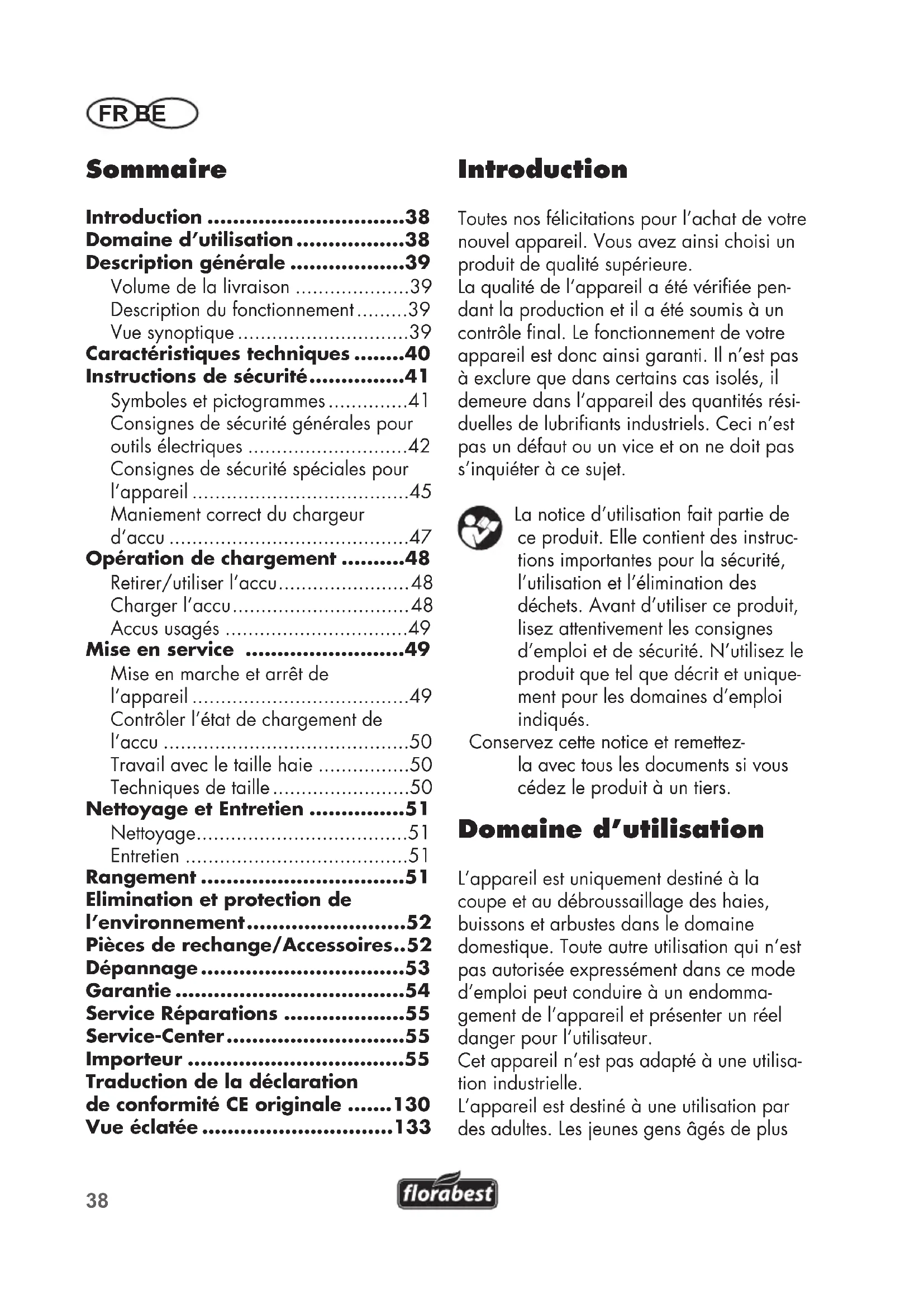 - pas un défaut ou un vice et on ne doit pas s’inquiéter à ce sujet. La notice d’utilisation fait partie de ce produit. Elle contient des instruc- tions importantes pour la sécurité, l’utilisation et l’élimination des déchets. Avant d’utiliser ce produit, lisez attentivement les consignes d’emploi et de sécurité. N’utilisez le produit que tel que décrit et unique- ment pour les domaines d’emploi indiqués. Conservez cette notice et remettez- la avec tous les documents si vous cédez le produit à un tiers. Domaine d’utilisation L’appareil est uniquement destiné à la coupe et au débroussaillage des haies, buissons et arbustes dans le domaine domestique. Toute autre utilisation qui n’est pas autorisée expressément dans ce mode d’emploi peut conduire à un endomma- gement de l’appareil et présenter un réel danger pour l’utilisateur. Cet appareil n’est pas adapté à une utilisa- tion industrielle. L’appareil est destiné à une utilisation par des adultes. Les jeunes gens âgés de plus Sommaire Introduction p. 38