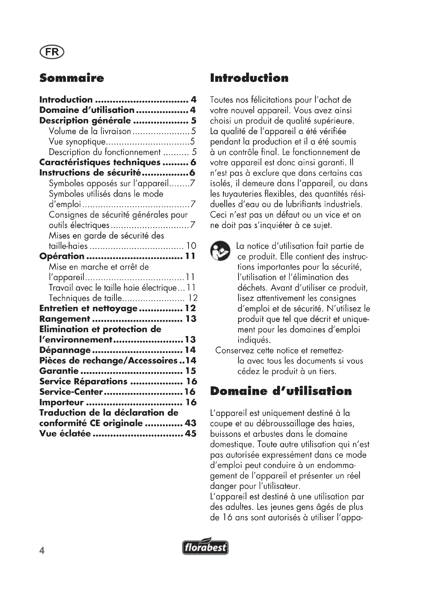 - Introduction Toutes nos félicitations pour l’achat de votre nouvel appareil. Vous avez ainsi choisi un produit de qualité supérieure. La qualité de l’appareil a été vériée pendant la production et il a été soumis à un contrôle nal. Le fonctionnement de votre appareil est donc ainsi garanti. Il n’est pas à exclure que dans certains cas isolés, il demeure dans l’appareil, ou dans les tuyauteries exibles, des quantités rési- duelles d’eau ou de lubriants industriels. Ceci n’est pas un défaut ou un vice et on ne doit pas s’inquiéter à ce sujet. La notice d’utilisation fait partie de ce produit. Elle contient des instruc- tions importantes pour la sécurité, l’utilisation et l’élimination des déchets. Avant d’utiliser ce produit, lisez attentivement les consignes d’emploi et de sécurité. N’utilisez le produit que tel que décrit et unique- ment pour les domaines d’emploi indiqués. Conservez cette notice et remettez- la avec tous les documents si vous cédez le produit à un tiers. Domaine d’utilisation L’appareil est uniquement destiné à la coupe et au débroussaillage des haies, buissons et arbustes dans le domaine domestique. Toute autre utilisation qui n’est pas autorisée expressément dans ce mode d’emploi peut conduire à un endomma- gement de l’appareil et présenter un réel danger pour l’utilisateur. L’appareil est destiné à une utilisation par des adultes. Les jeunes gens âgés de plus de 16 ans sont autorisés à utiliser l’appa- Sommaire Introduction p. 4