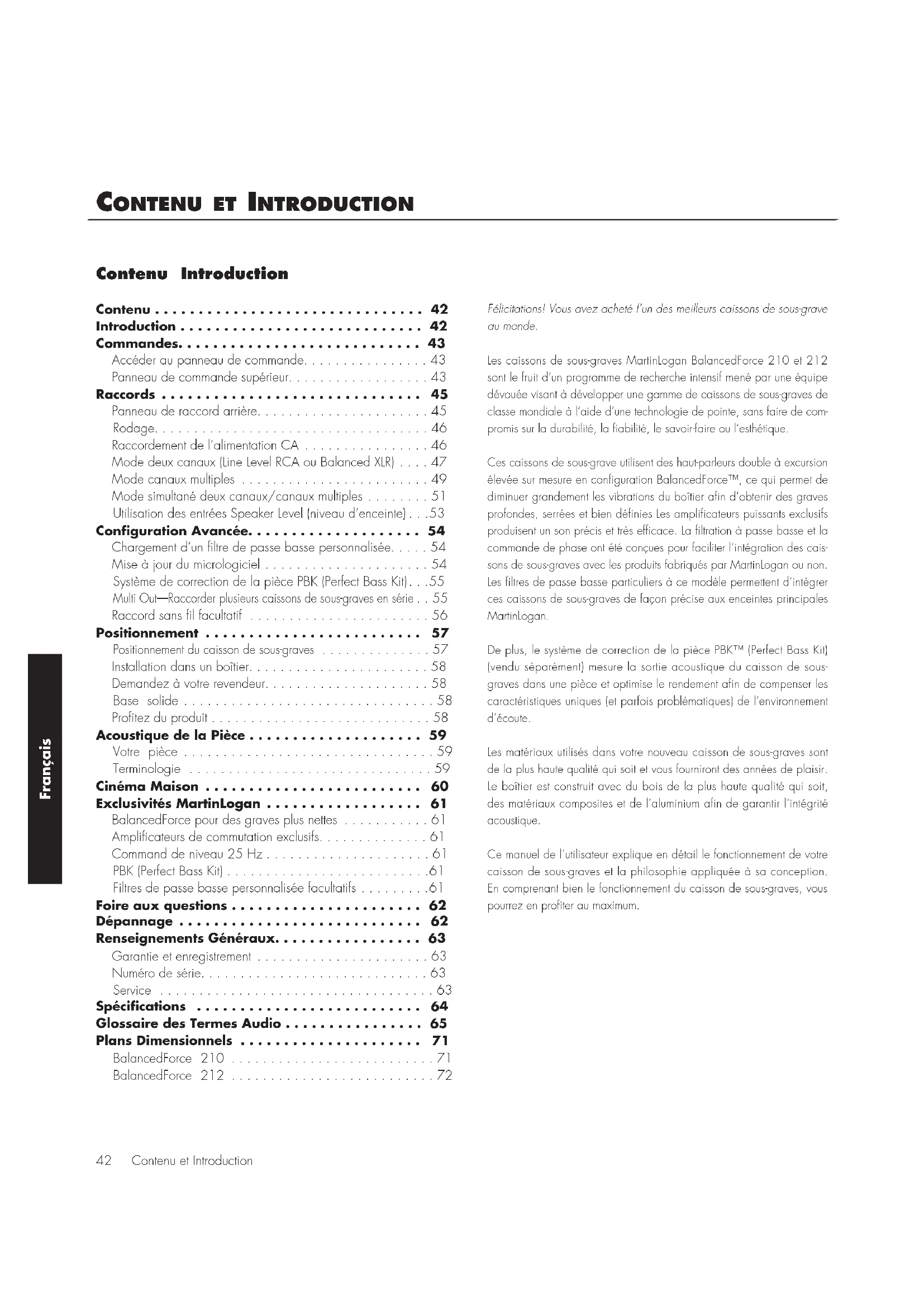 - BalancedForce 212 Félicitations! Vous avez acheté l’un des meilleurs caissons de sous-grave au monde. Les caissons de sous-graves MartinLogan BalancedForce 210 et 212 sont le fruit d’un programme de recherche intensif mené par une équipe dévouée visant à développer une gamme de caissons de sous-graves de classe mondiale à l’aide d’une technologie de pointe, sans faire de com-promis sur la durabilité, la fiabilité, le savoir-faire ou l’esthétique.Ces caissons de sous-grave utilisent des haut-parleurs double à excursion élevée sur mesure en configuration BalancedForce™, ce qui permet de diminuer grandement les vibrations du boîtier afin d’obtenir des graves profondes, serrées et bien définies Les amplificateurs puissants exclusifs produisent un son précis et très efficace. La filtration à passe basse et la commande de phase ont été conçues pour faciliter l’intégration des cais-sons de sous-graves avec les produits fabriqués par MartinLogan ou non. Les filtres de passe basse particuliers à ce modèle permettent d’intégrer ces caissons de sous-graves de façon précise aux enceintes principales MartinLogan.De plus, le système de correction de la pièce PBK™ (Perfect Bass Kit) (vendu séparément) mesure la sortie acoustique du caisson de sous-graves dans une pièce et optimise le rendement afin de compenser les caractéristiques uniques (et parfois problématiques) de l’environnement d’écoute.Les matériaux utilisés dans votre nouveau caisson de sous-graves sont de la plus haute qualité qui soit et vous fourniront des années de plaisir. Le boîtier est construit avec du bois de la plus haute qualité qui soit, des matériaux composites et de l’aluminium afin de garantir l’intégrité acoustique.Ce manuel de l’utilisateur explique en détail le fonctionnement de votre caisson de sous-graves et la philosophie appliquée à sa conception. En comprenant bien le fonctionnement du caisson de sous-graves, vous pourrez en profiter au maximum. Contenu Introduction FrançaisFrançais Commandes 43 Accéder au panneau de commande Le panneau de commande est caché sous le verre situé sur la partie supérieure du caisson de sous-graves. Pour accéder au panneau de commande, appuyez délicatement sur le rebord avant du verre. Le rebord opposé du verre basculera vers le haut afin de faciliter le retrait. Panneau de commande supérieur On/Off/DimCet interrupteur commande la luminosité de la lumière bleue sur la partie supérieure du caisson de sous-graves.LevelSi vous réglez le niveau trop haut, les graves sembleront gonflées; c’est la cause la plus courante de caissons de sous-graves qui offrent un mau-vais son. Une règle pratique stipule que le caisson de sous-graves ne doit pas attirer l’attention sur lui. Il doit simplement faire en sorte que les graves du système soient plus étendues et plus précisesNiveau 25 Hz (dB)Le bouton de niveau 25 Hz permet de régler les fréquences de façon importante lorsque des crêtes et des creux de différentes amplitudes se manifestent souvent. Le réglage idéal dépend de la taille et de la construction de la pièce, de la configuration du système et de vos pré-férences personnelles. Ce paramètre du bouton est ignoré lorsque le PBK fonctionne. Si vous utilisez la fonction correction automatique de la pièce du PBK, nous vous recommandons d'écouter d’abord avec le bouton réglé à 0 après le lancement du PBK – vous pouvez utiliser ce bouton pour ajouter ou enlever des graves au besoin.Filtre de passe basse (Hz)Le bouton de filtre de passe basse vous permet de régler la fréquence de passe basse pour les entrées de gauche et de droite (RCA, XLR ou entrées de niveau d’enceinte (speaker level)). Ce bouton n’est pas appli- Commandes Figure 1. Panneau de commande supérieur. Figure 2. Fréquences touchées par le bouton de niveau 25 Hz44 Commandes qué aux entrées LFE (RCA ou XLR); la tâche de la gestion des graves est plutôt laissée à votre processeur audio/vidéo. En règle générale, le filtre de passe basse doit être réglé à environ 70 % (ou plus bas) de la fréquence de réponse la plus basse de l’enceinte princi- pale. Exemple : la fréquence de réponse la plus basse de votre enceinte est 43 Hz. 70 % de 43 Hz donne 30.1; vous devez donc régler le filtre de passe basse du caisson de sous-graves à 30 Hz. Pour votre informa- tion, une fois que vous avez essayé le réglage recommandé à l’aide de la formule susmentionnée, vous devez essayer également les autres réglages. Si vous n’êtes pas certain de la réponse de fréquence la plus faible de votre enceinte principale, commencez avec un réglage de 35 Hz. Le fait d'essayer différents réglages ne causera pas de tort au système. Veuillez noter que les paramètres sur ce bouton sont tous contournés si le bouton « Custom Low-Pass » est engagé. Les filtres de passe basse personnalisée sont abordés plus loin dans ce manuel. Commande de phase La commande de la phase dépend entièrement de nombreux facteurs, notamment la taille et la configuration de votre environnement d’écoute, du positionnement de l’appareil et de la disposition des sièges. En raison de la façon selon laquelle les ondes sonores des graves se dével- oppent dans les différentes pièces, il n’existe aucune règle générale pour régler la phase. Par exemple, si la pièce a une crête dans la zone du répartiteur du caisson de sous-graves, il est recommandé de régler la phase de façon à ce que les sorties acoustiques réelles du caisson de sous-graves et les enceintes principales soient déphasées. Expérimentez, essayez différents réglages et soyez patient. Si vous utiliser le caisson de sous-graves pour compléter d'autres produits MartinLogan, nous vous conseillons de commencer avec un réglage de phase à 90°. Si vous utilisez un filtre de passe basse personnalisée (Custom Low-Pass filter), nous vous conseil