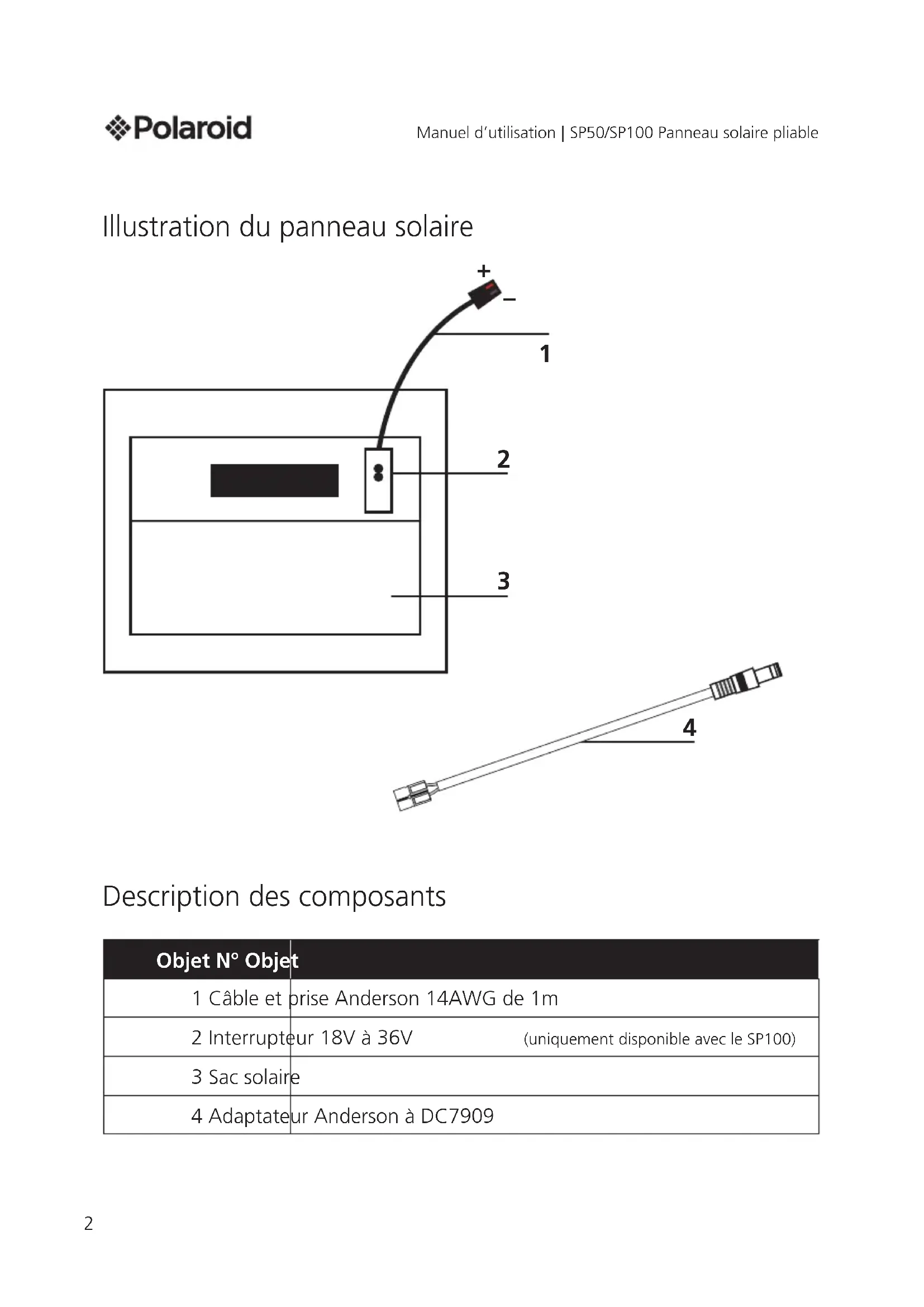 Illustration du panneau solaire Description des composants Objet N° Objet 1 Câble et prise Anderson 14AWG de 1m 2 Interrupteur 18V à 36V (uniquement disponible avec le SP100) 3 Sac solaire 4 Adaptateur Anderson à DC7909