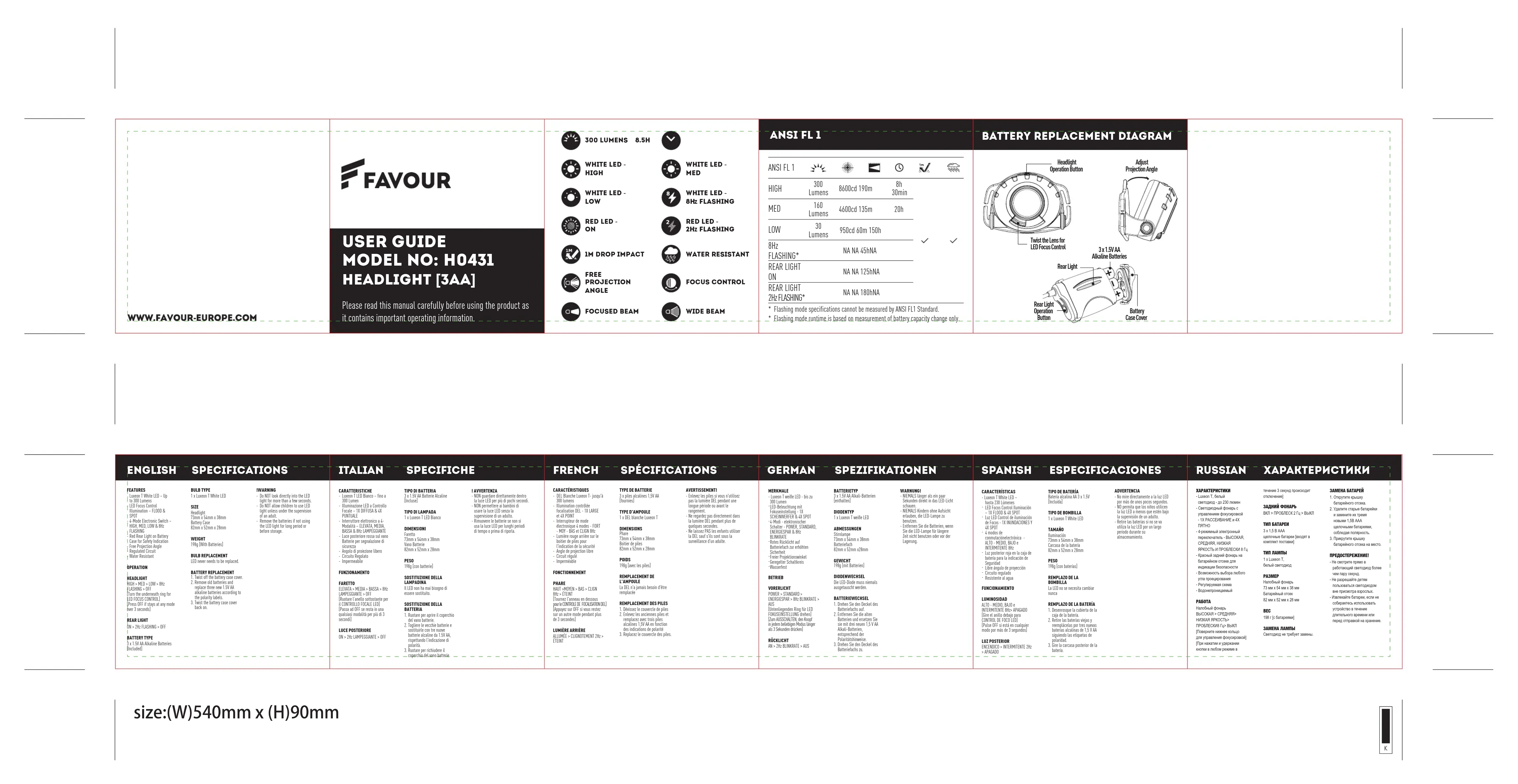 PHAREFONCTIONNEMENTHAUT >MOYEN > BAS > CLIGN 8Hz > ÉTEINT[Tournez l'anneau en dessous pour le CONTROLE DE FOCALISATION DEL][Appuyez sur OFF si vous restez sur un autre mode pendant plus de 3 secondes]TYPE DE BATTERIE3 x piles alcalines 1,5V AA [fournies] TYPE D’AMPOULE1 x DEL blanche Luxeon TDIMENSIONS Phare73mm x 54mm x 38mmBoitier de piles82mm x 52mm x 28mmPOIDS198g [avec les piles]REMPLACEMENT DE L’AMPOULELa DEL n'a jamais besoin d'être remplacéeAVERTISSEMENT!Enlevez les piles si vous n'utilisez pas la lumière DEL pendant une longue période ou avant le rangement.Ne regardez pas directement dans la lumière DEL pendant plus de quelques secondes.Ne laissez PAS les enfants utiliser la DEL sauf s'ils sont sous la surveillance d'un adulte.