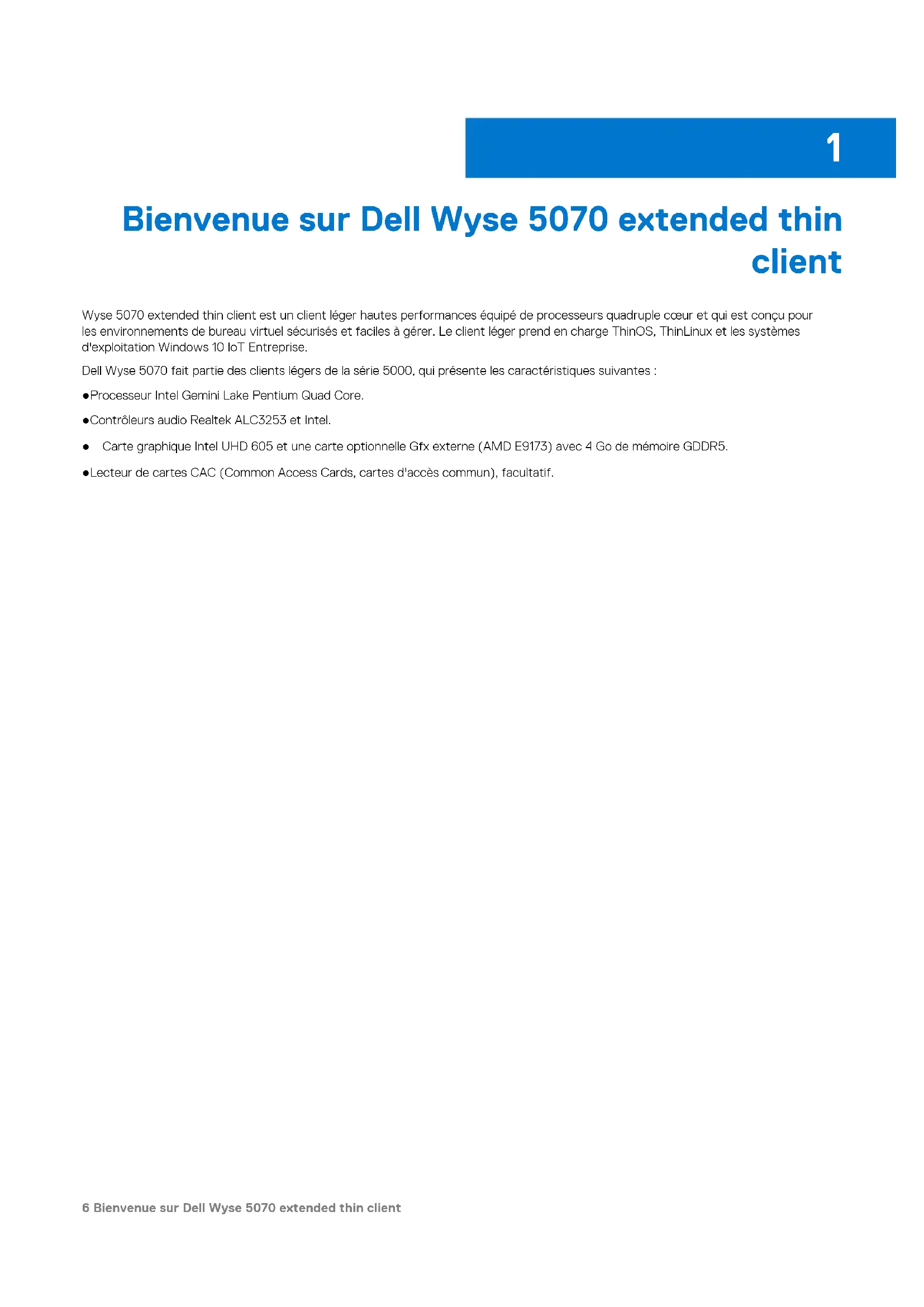 de décès. © 2018 - 2021 Dell Inc. ou ses filiales. Tous droits réservés. Dell, EMC et les autres marques commerciales mentionnées sont des marques de Dell Inc. ou de ses filiales. Les autres marques peuvent être des marques commerciales de leurs propriétaires respectifs.Chapitre 1: Bienvenue sur Dell Wyse 5070 extended thin client........................................................... 6 Chapitre 2: Présentation du châssis..................................................................................................7 Chapitre 3: Composants principaux de votre client léger.................................................................... 9