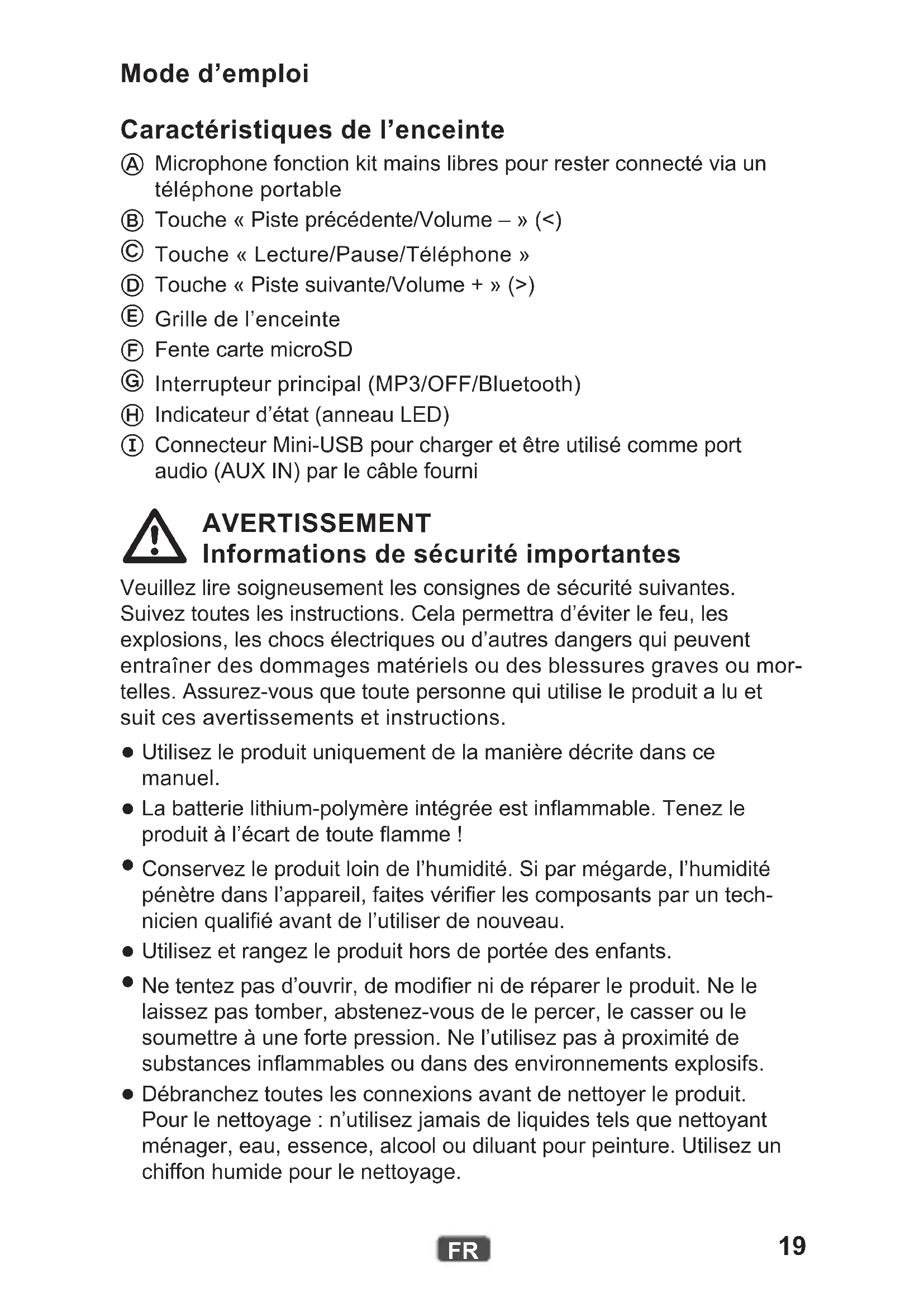 Connecteur Mini-USB pour charger et être utilisé comme port audio (AUX IN) par le câble fourni AVERTISSEMENT Informations de sécurité importantes Veuillez lire soigneusement les consignes de sécurité suivantes. Suivez toutes les instructions. Cela permettra d’éviter le feu, les explosions, les chocs électriques ou d’autres dangers qui peuvent entraîner des dommages matériels ou des blessures graves ou mor- telles. Assurez-vous que toute personne qui utilise le produit a lu et suit ces avertissements et instructions.